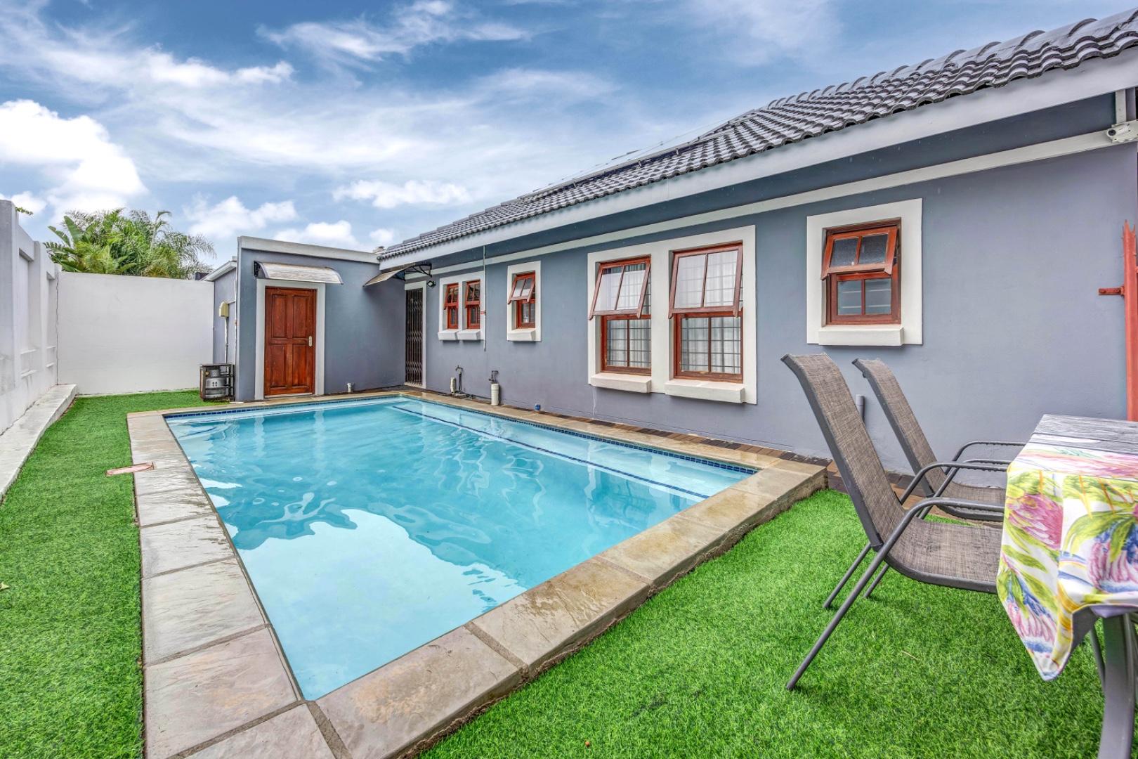 The home features three well-sized bedrooms, providing comfortable accommodation for the whole family. The seamless indoor-outdoor flow leads to a private garden and sparkling pool, ideal for weekend braais, family gatherings, or simply unwinding in your own tranquil space.