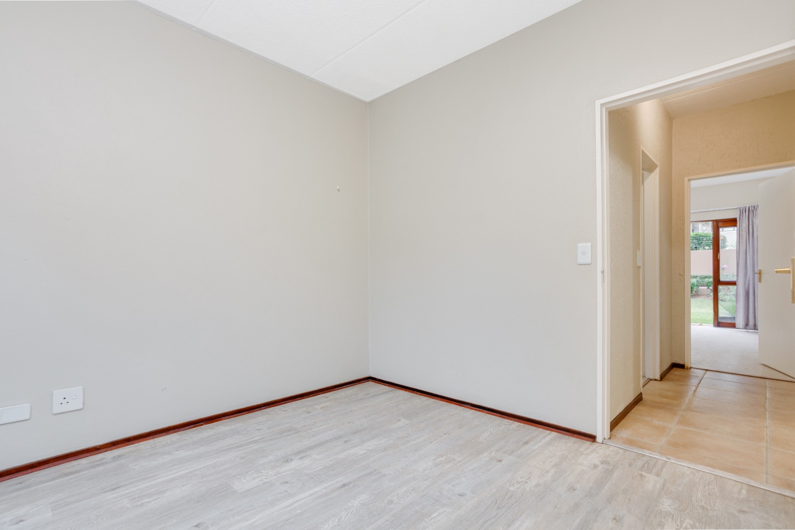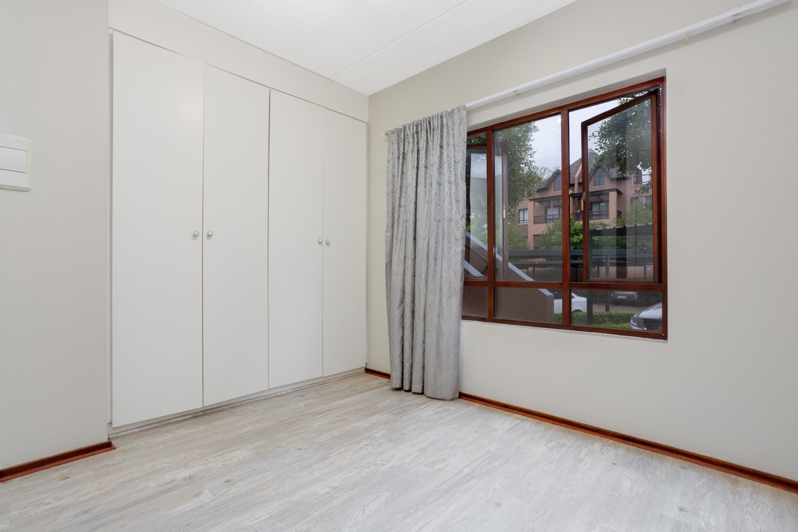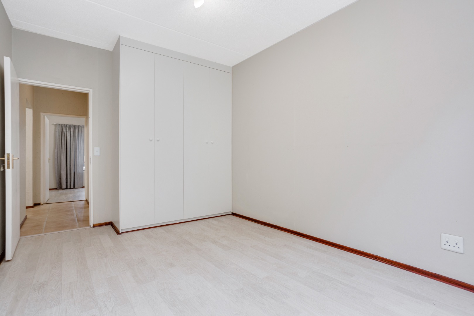 Both bedrooms feature laminate flooring and offer a generous amount of cupboard space, with the main bedroom providing its own private access to the garden.