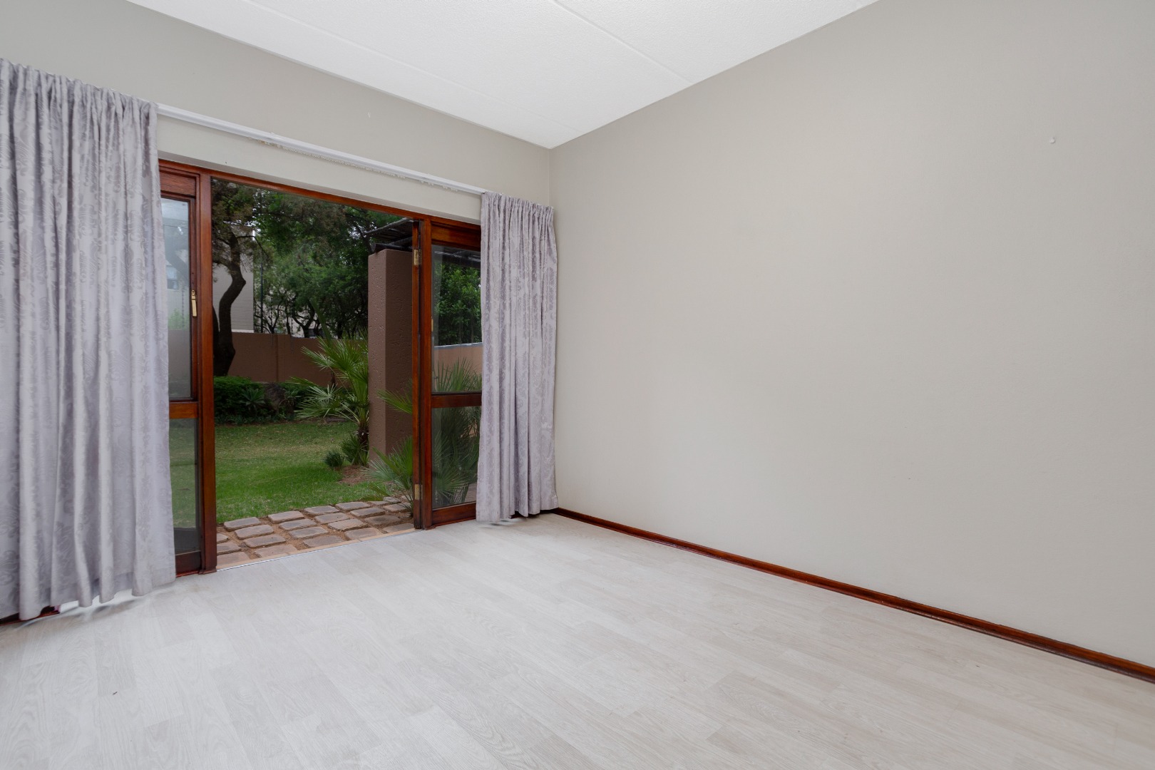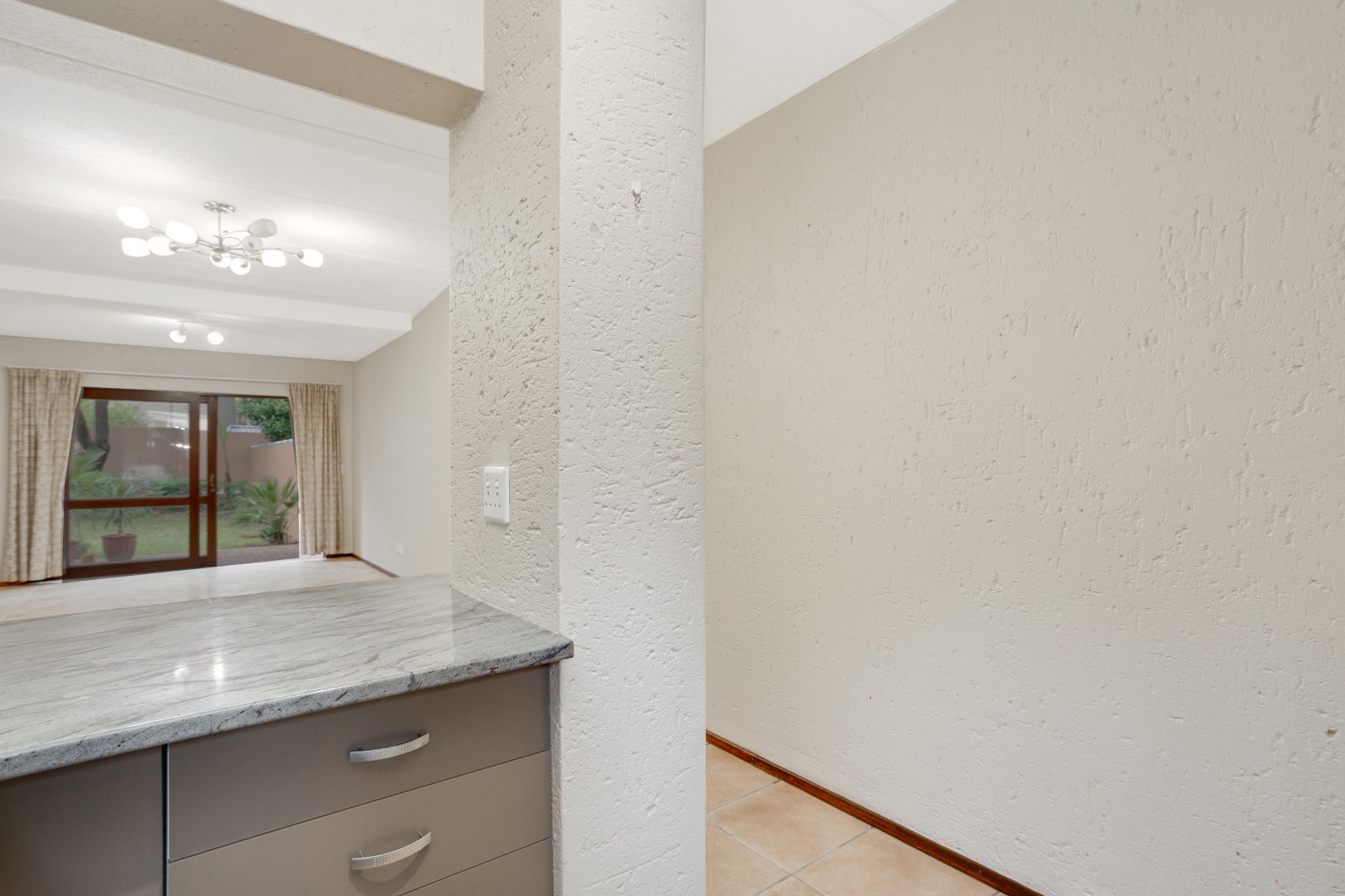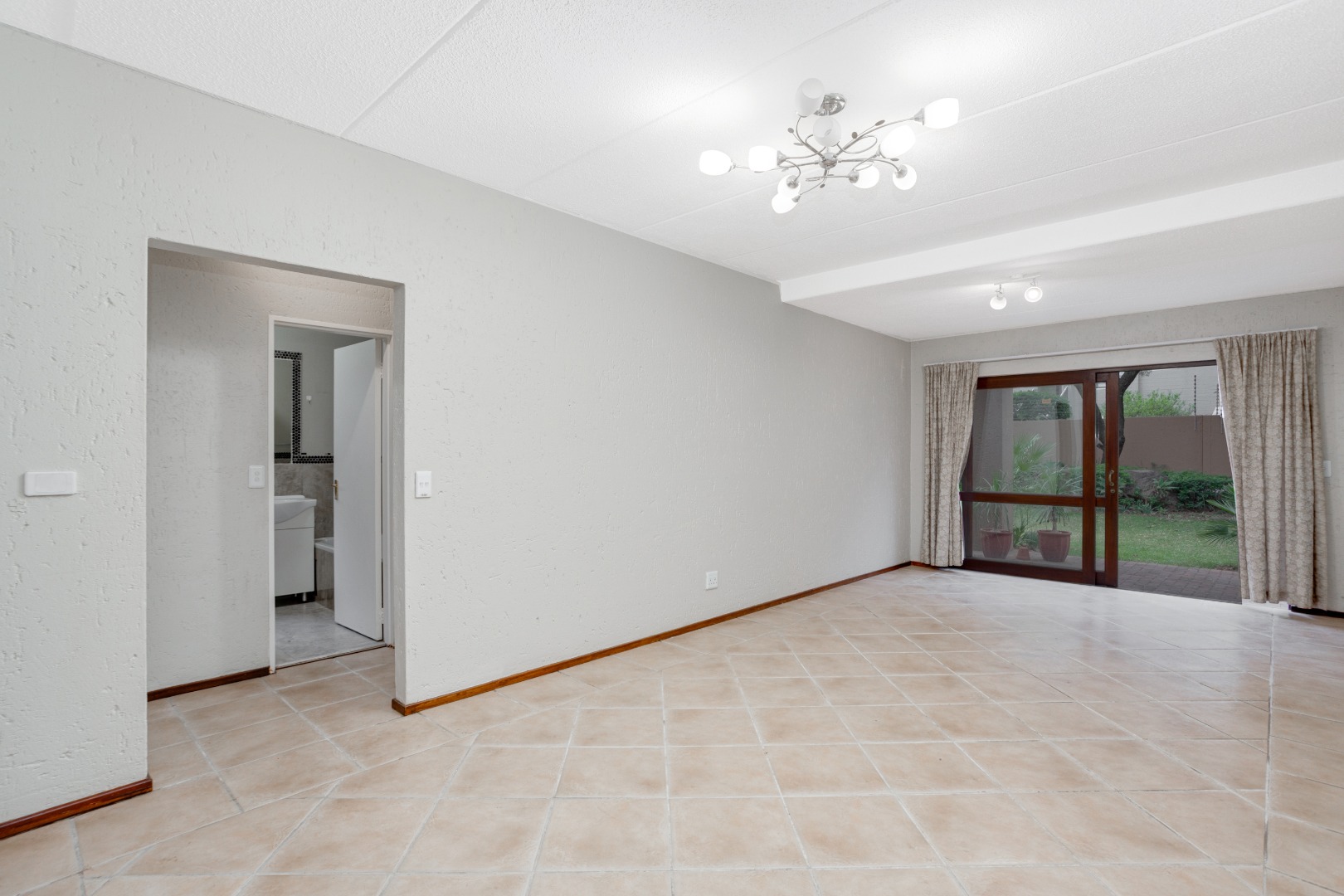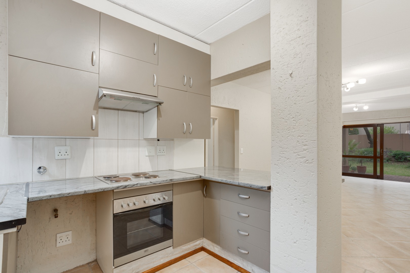 and dining area with sliders that open onto a sizable patio, providing serene views of an extra-large garden adorned with indigenous trees. The kitchen hasbeen tastefully upgraded, featuring a breakfast counter, space for one under-counter water appliance, a single fridge, a hob, and an under-counter oven. The bathroom has been stylishly modernized with new-look wall tiles and includes both a bath and a shower for your convenience.