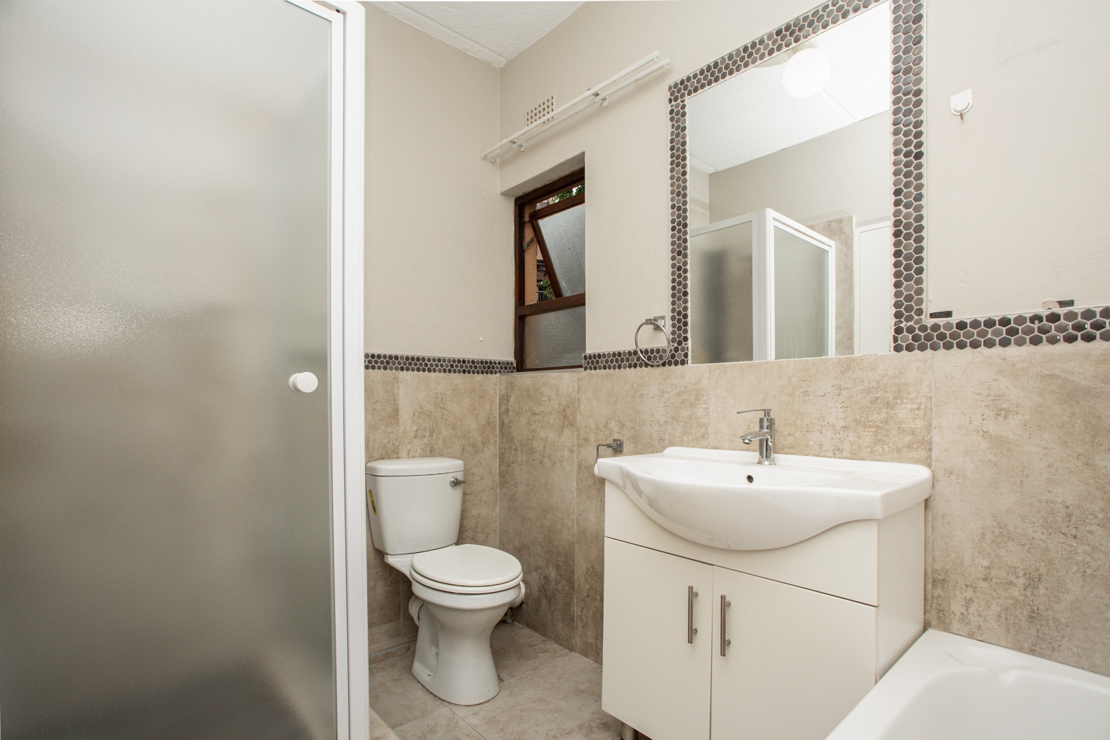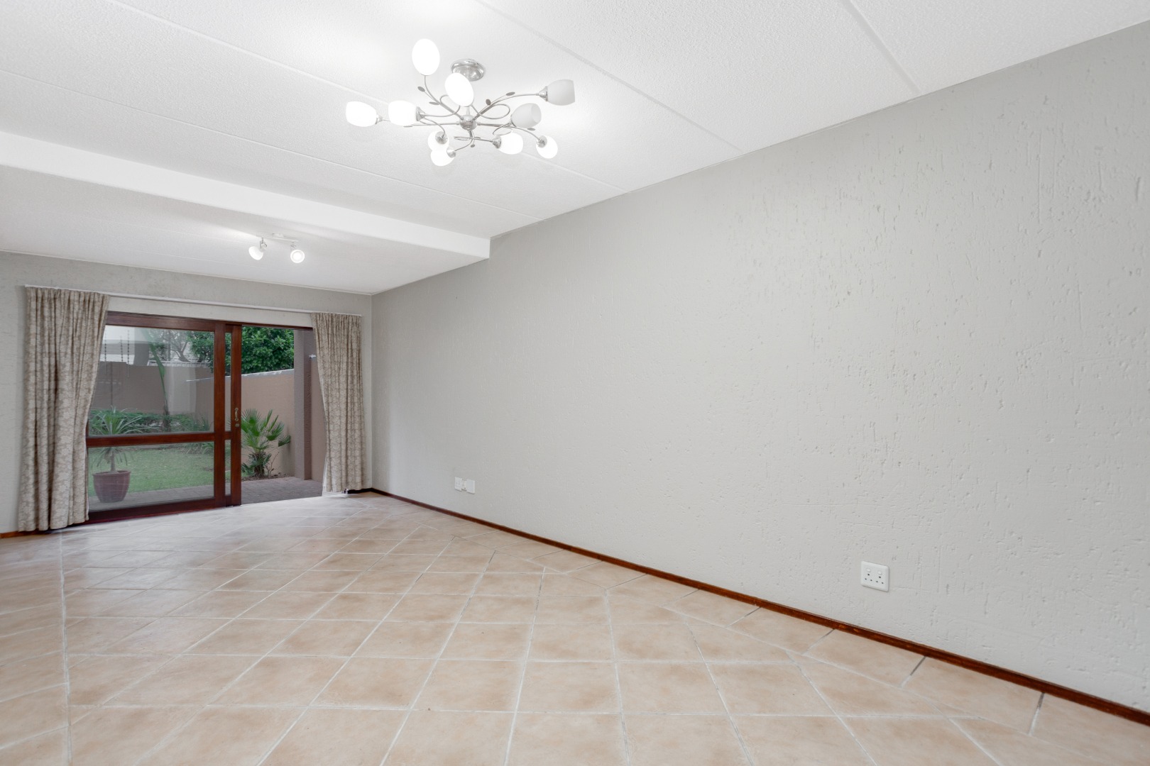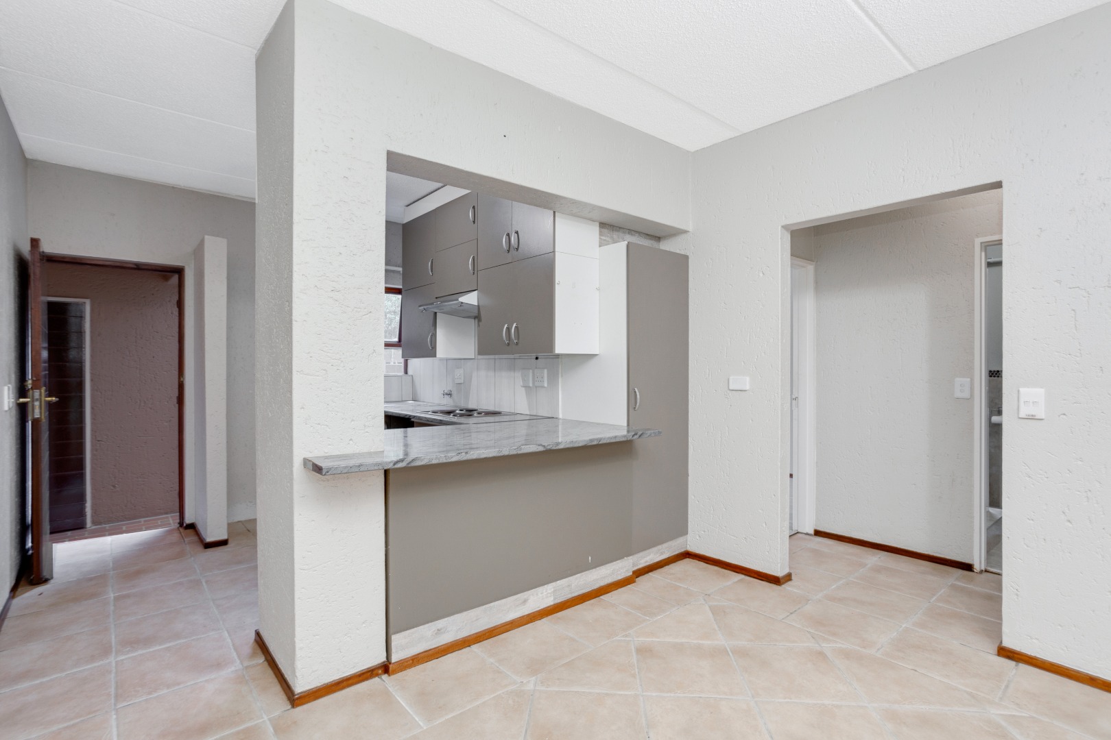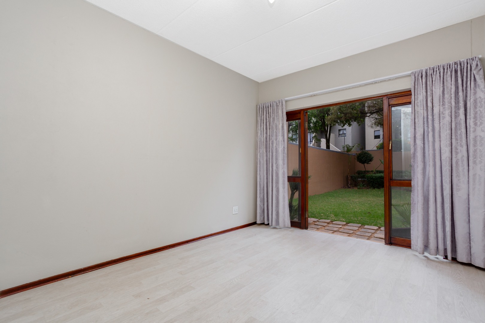 and dining area with sliders that open onto a sizable patio, providing serene views of an extra-large garden adorned with indigenous trees. The kitchen hasbeen tastefully upgraded, featuring a breakfast counter, space for one under-counter water appliance, a single fridge, a hob, and an under-counter oven. The bathroom has been stylishly modernized with new-look wall tiles and includes both a bath and a shower for your convenience.