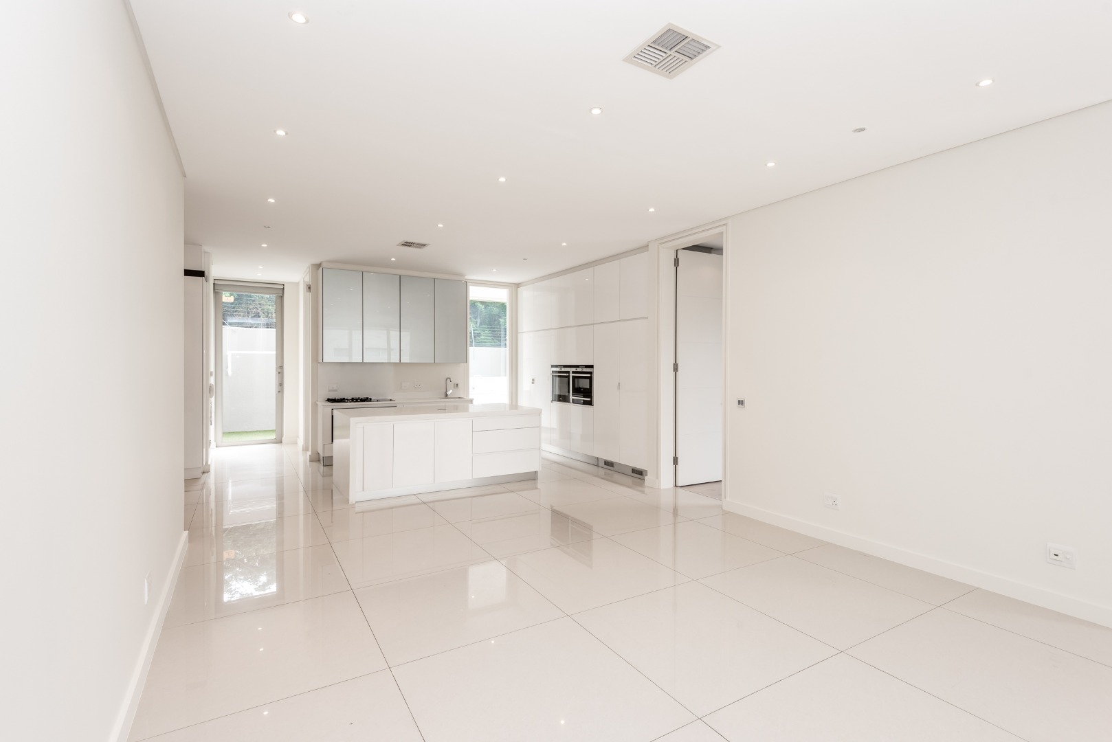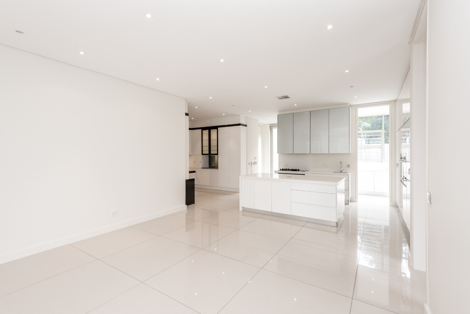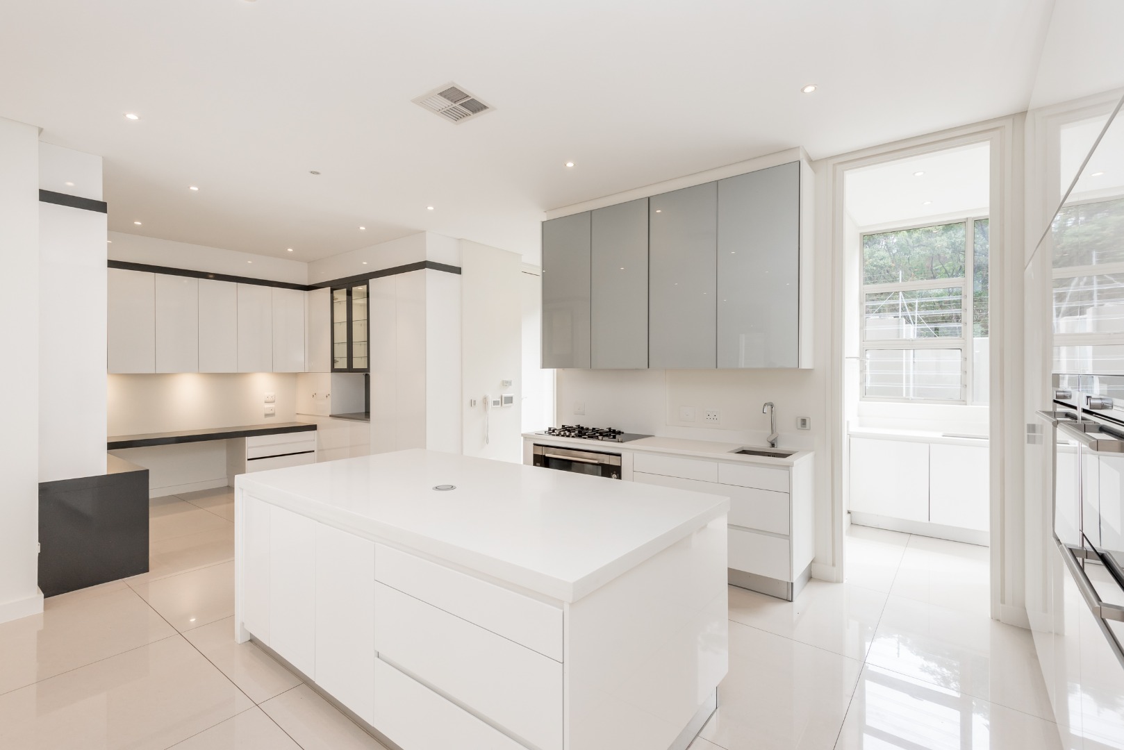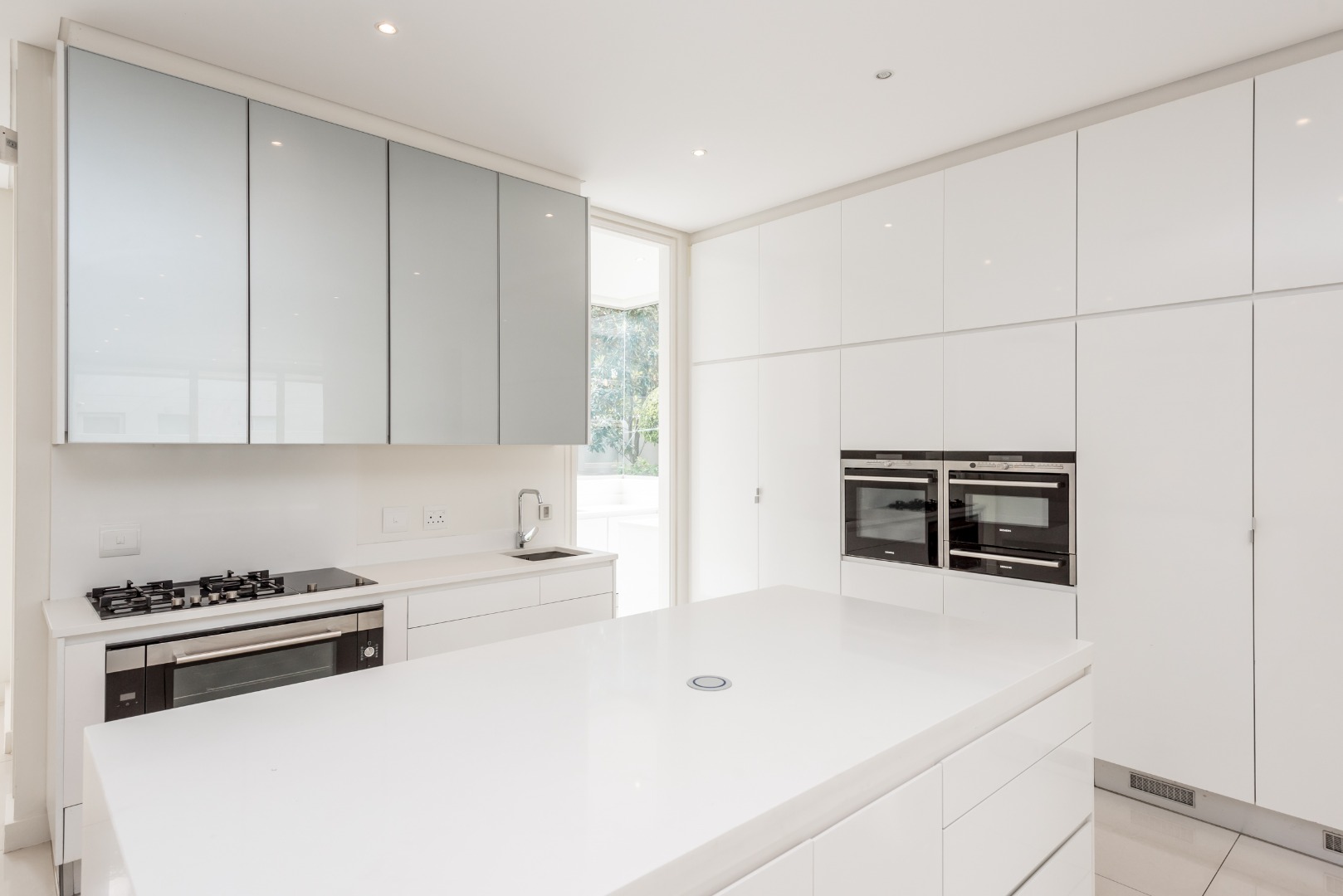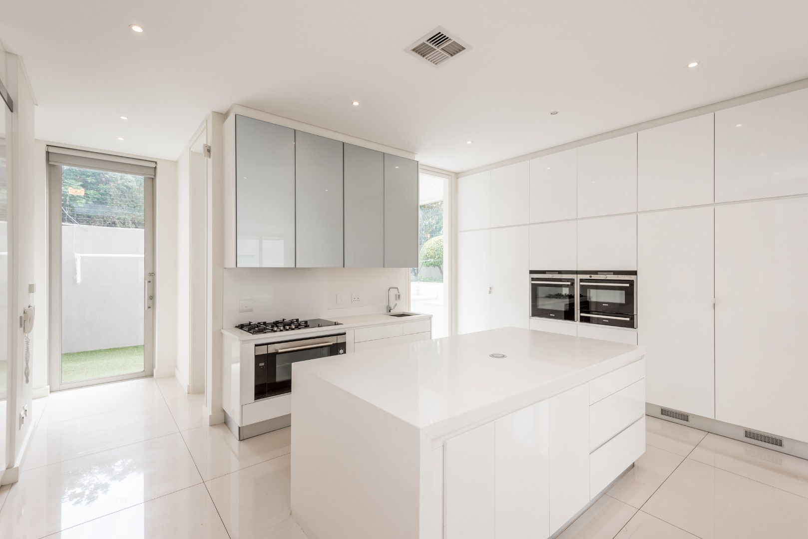 Step inside to an inviting open-plan layout, where the open plan environment abundant natural light create an airy atmosphere. The heart of this home is its ultra-modern kitchen, boasting extensive white high-gloss cabinetry, a large central island, and integrated appliances including a gas hob and ovens.