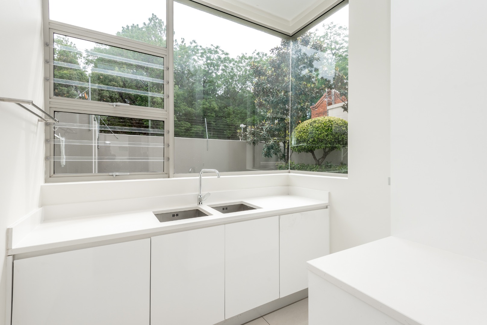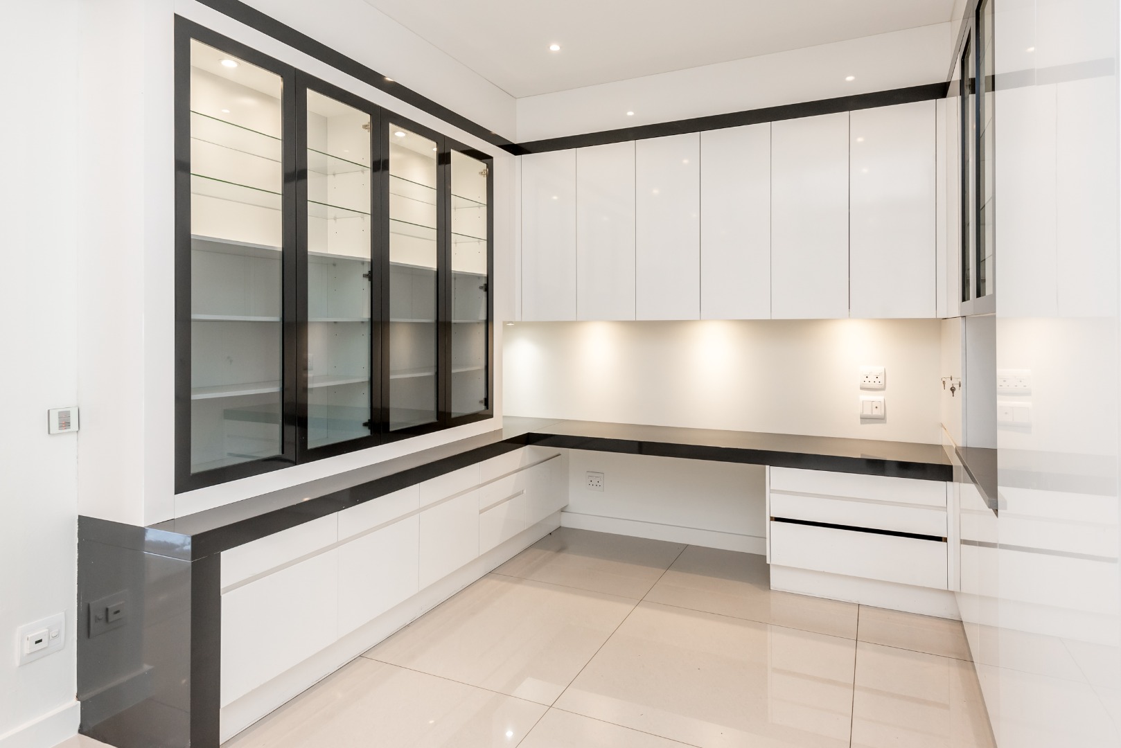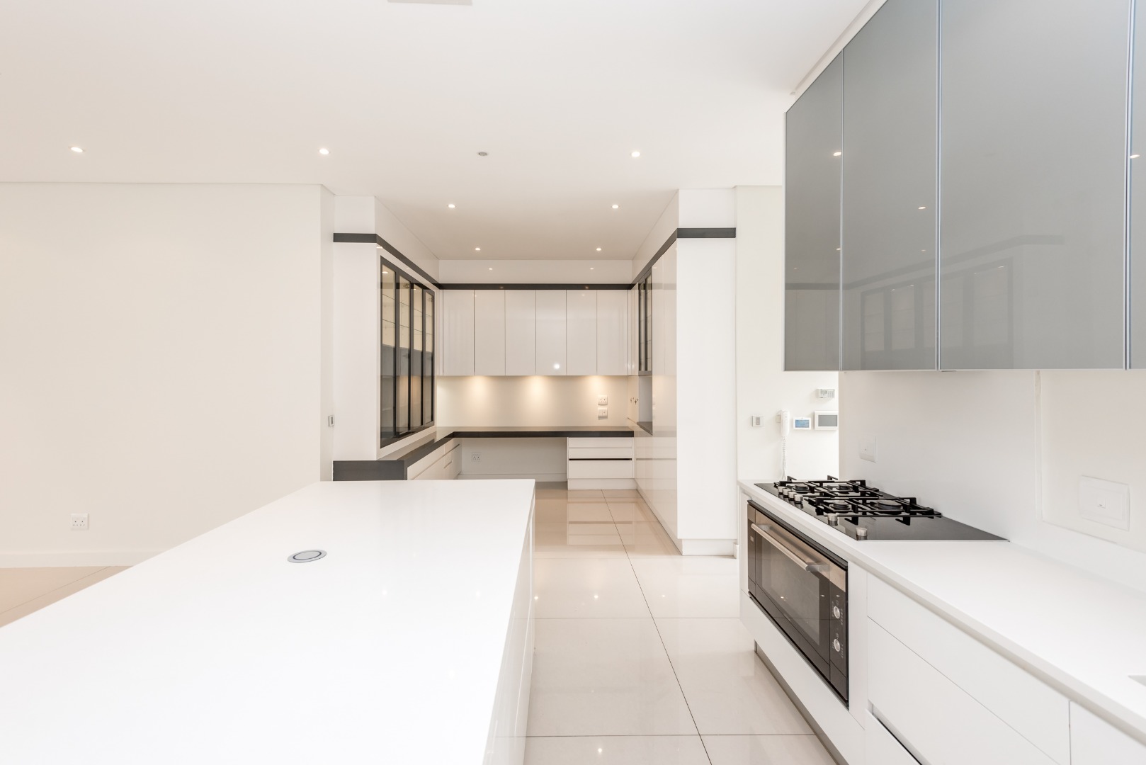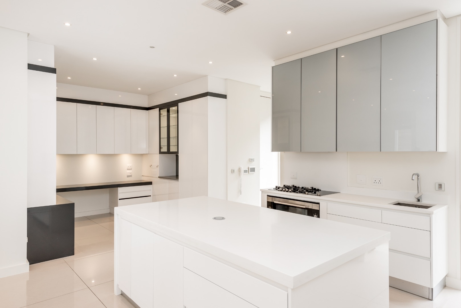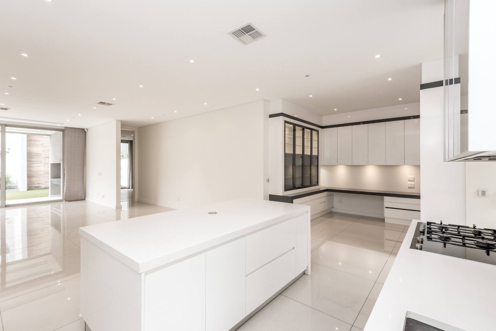 Step inside to an inviting open-plan layout, where the open plan environment abundant natural light create an airy atmosphere. The heart of this home is its ultra-modern kitchen, boasting extensive white high-gloss cabinetry, a large central island, and integrated appliances including a gas hob and ovens.