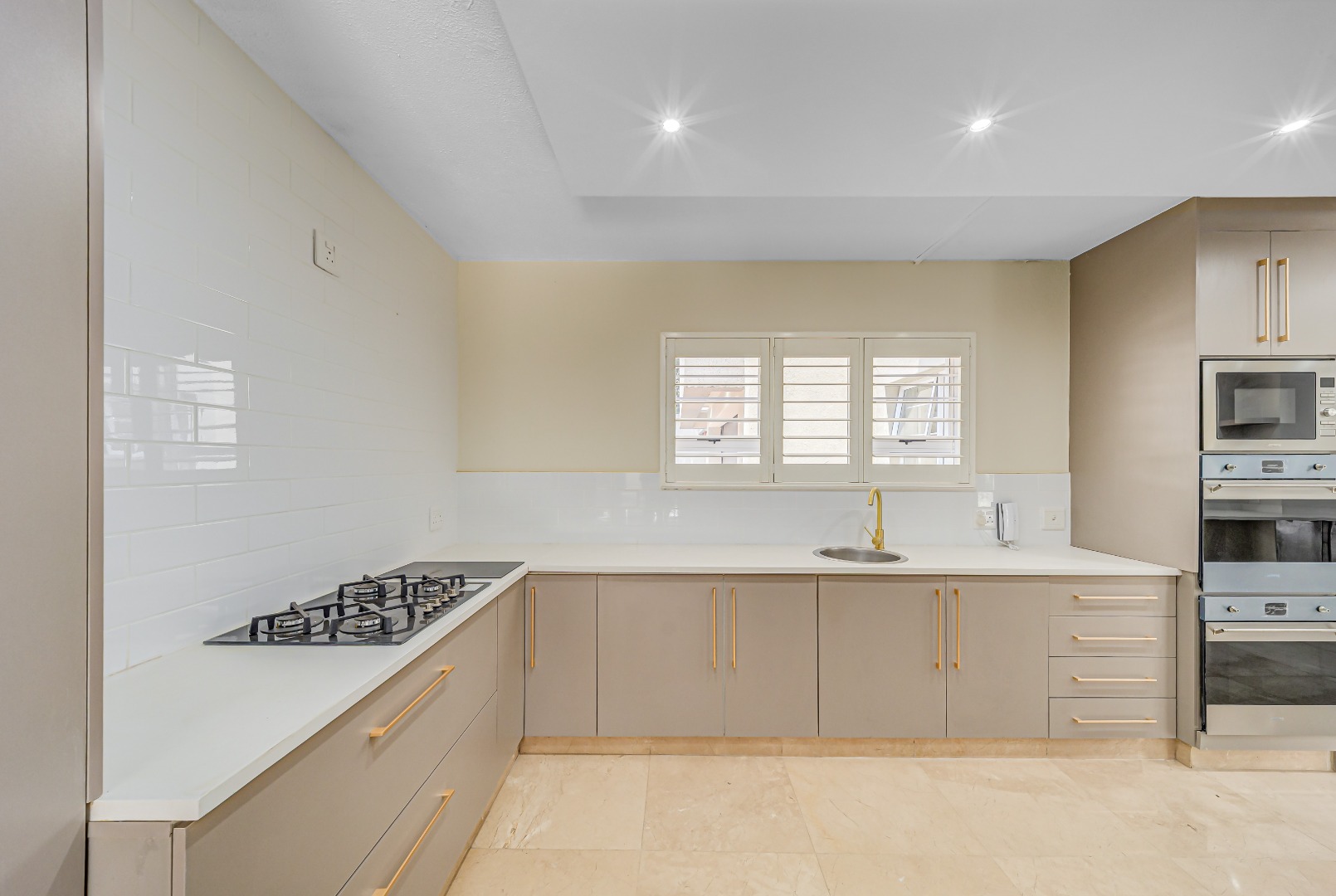 The kitchen? Clean lines, gold accents, chef-ready.