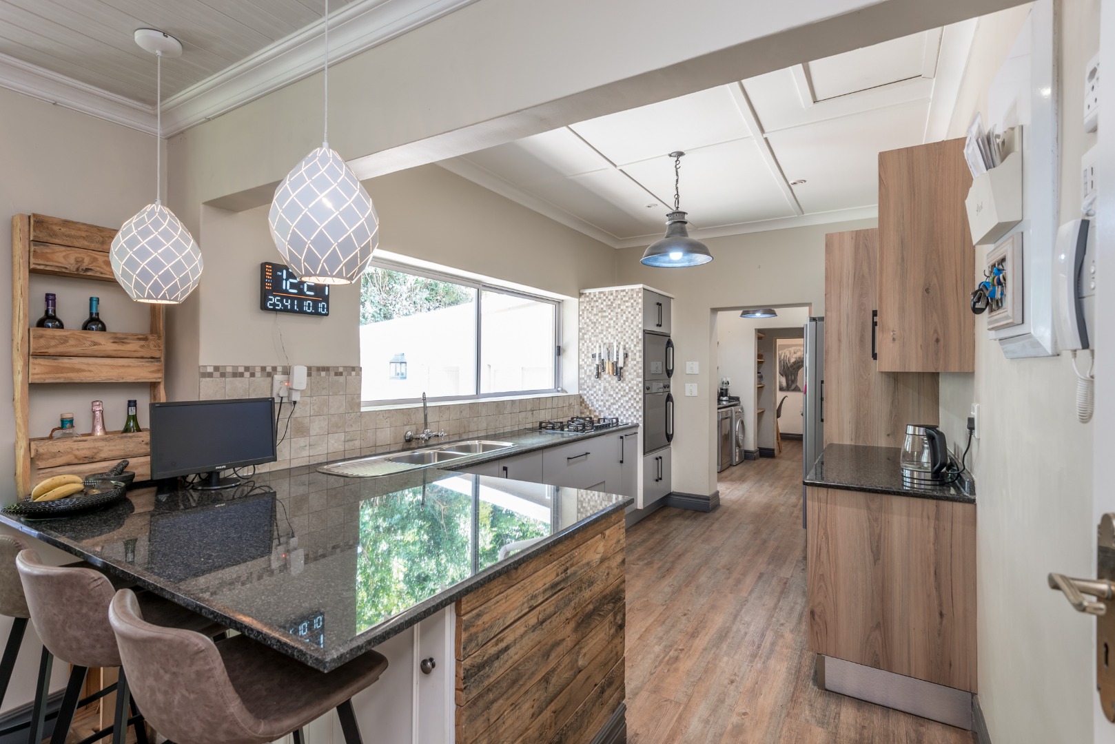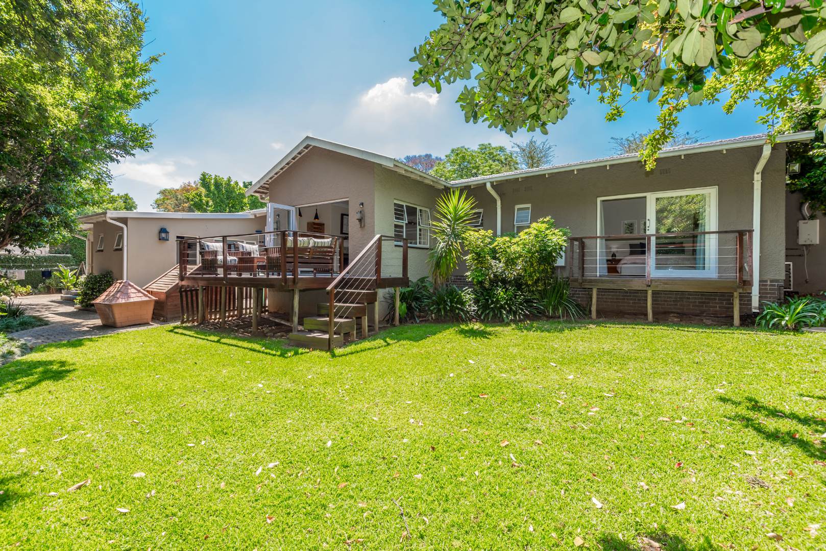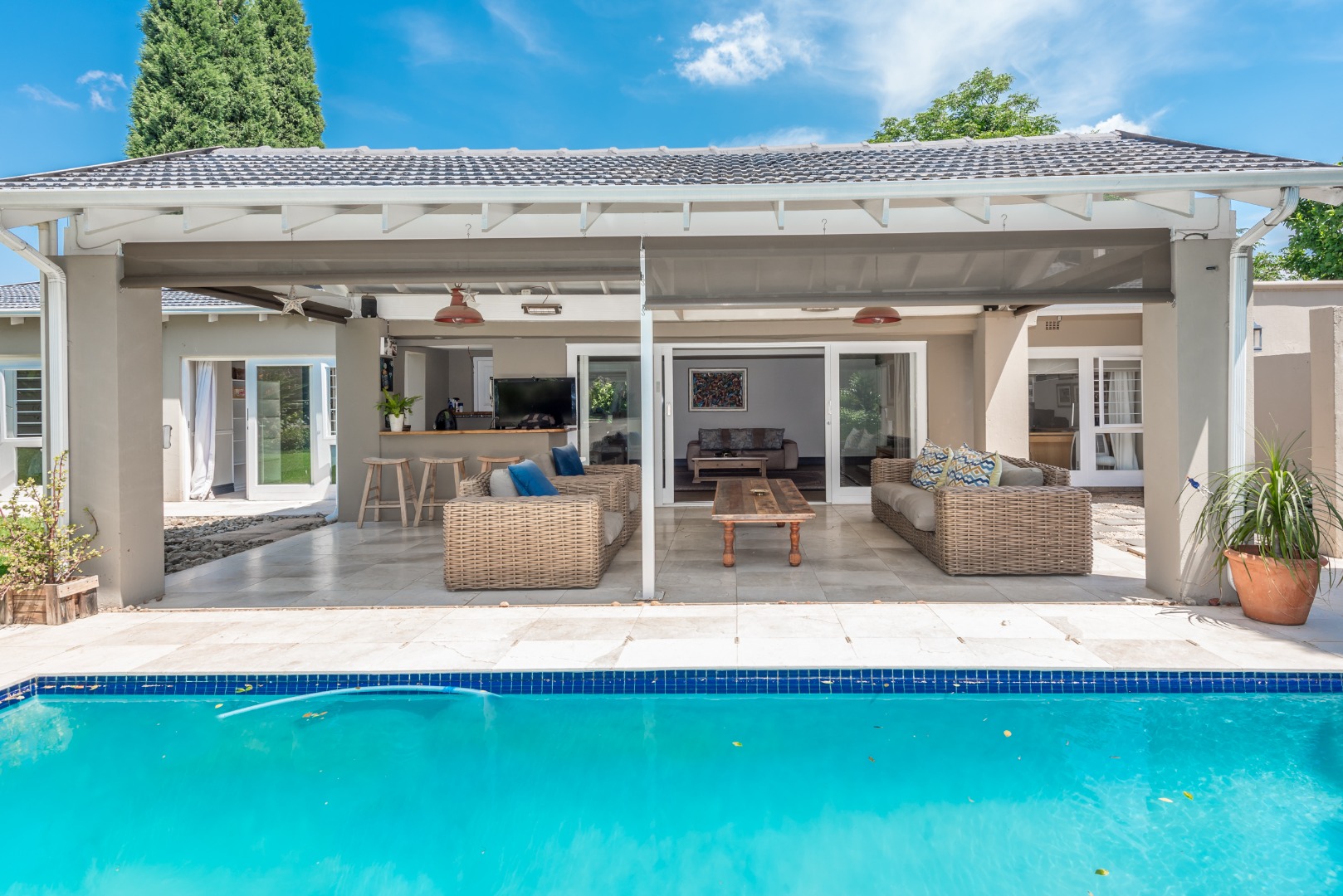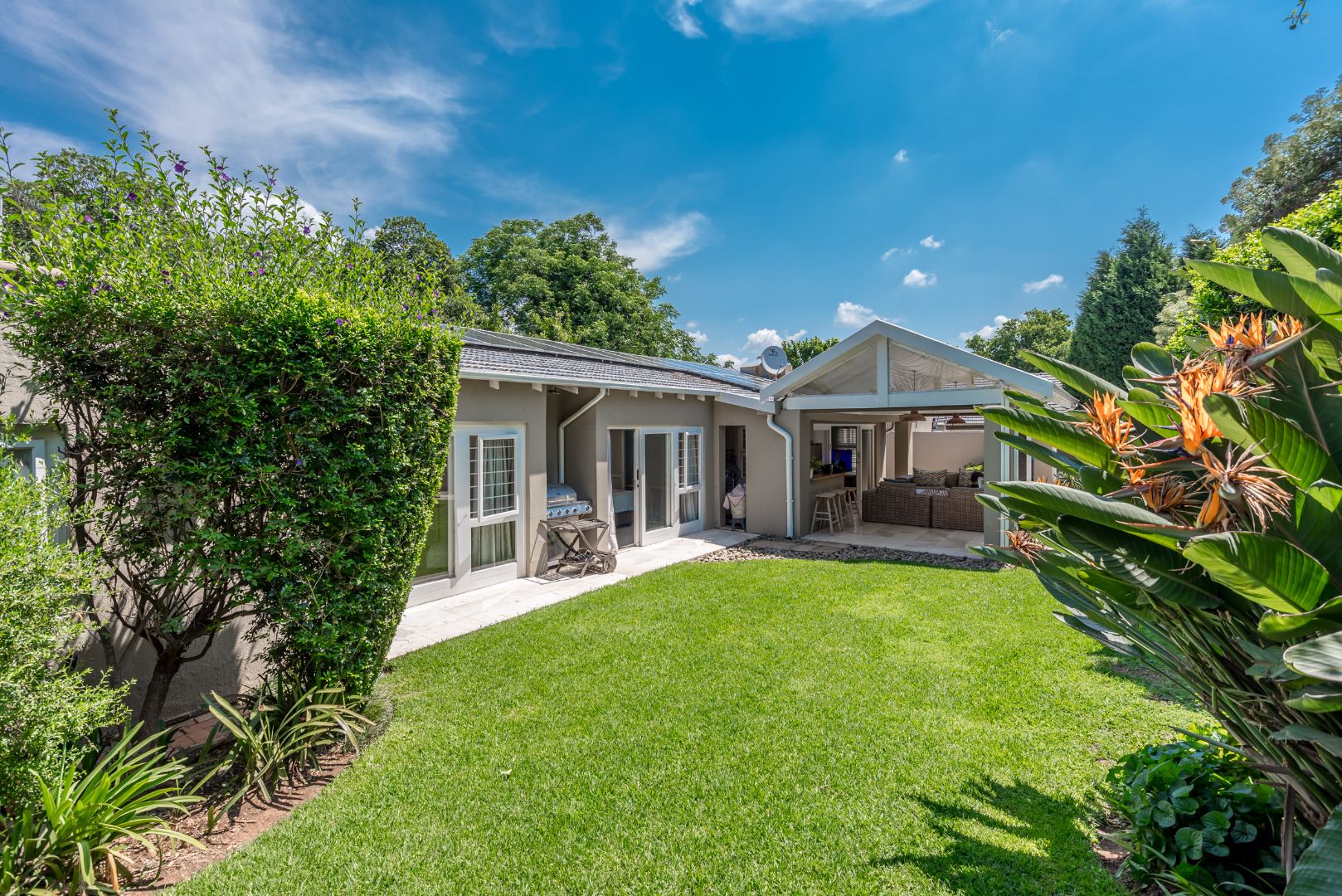 Security is a top priority here, with features like an access gate, alarm system, electric fencing, intercom, CCTV, burglar bars, and security gates, all within a totally walled property in a gated community and a boomed off area. You'll also appreciate the modern touches like air conditioning, a solar geyser, solar panels, a battery inverter for backup power, a generator and an irrigation system to keep your garden lush. Fibre internet connectivity ensures you stay connected.