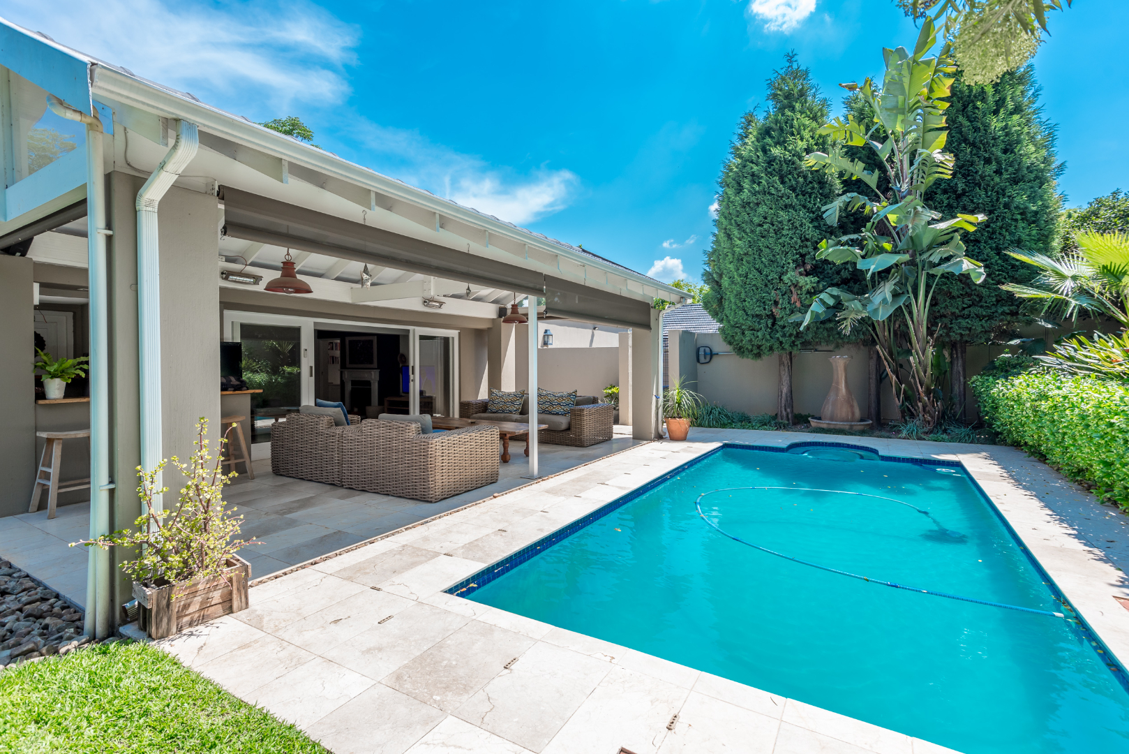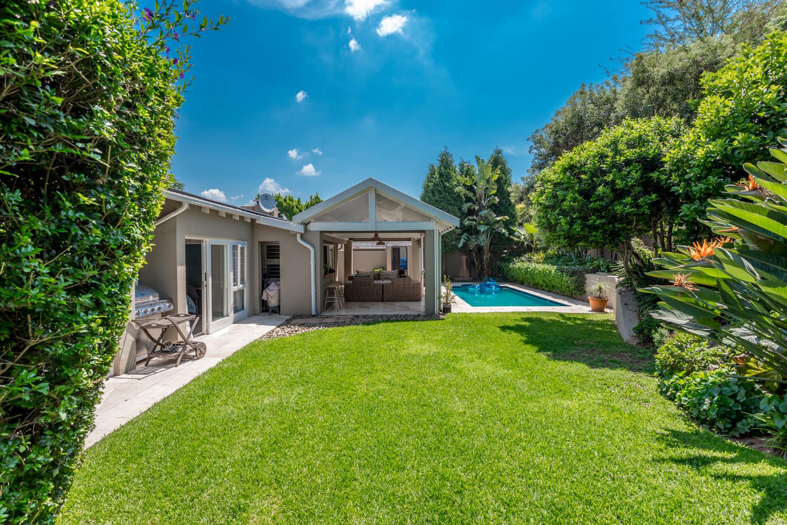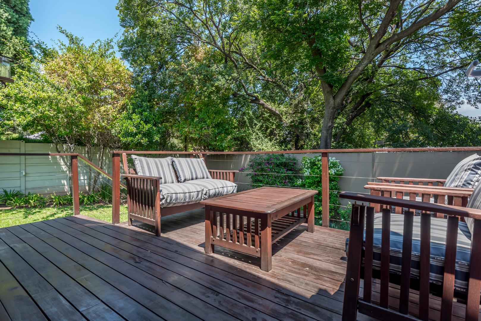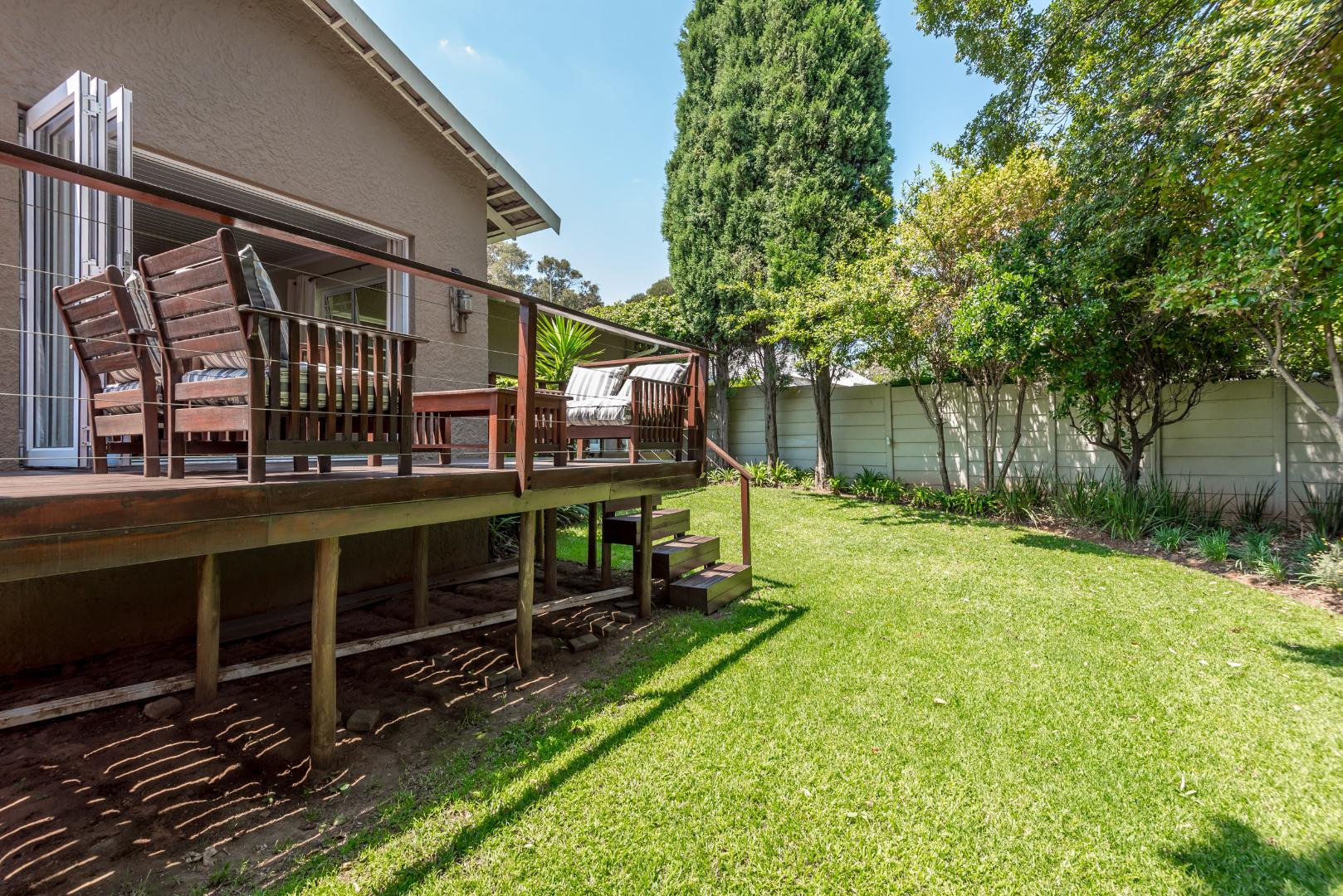 Come and discover this lovely family home with high ceilings, lots of natural light shinning throughout, nestled in a secure, gated community in the heart of Parkmore, Sandton. This suburban gem offers a relaxed lifestyle with plenty of space for everyone. As you step inside, you'll find a welcoming open-plan layout that connects the living areas seamlessly. The home features a comfortable lounge with a cozy fireplace for those cooler evenings, and a dedicated 12 to 14 seater dining room that also is blessed with a gas fireplace overlooking an outside decked area and garden that connects the indoor and outdoor spaces beautifully, perfect for family meals or entertaining friends. You'll also love the built-in bar, ideal for mixing your favourite drinks whilst watching all the favourable sports your heart desires on TV . A massive covered patio that overlooks a sparkling swimming pool and a well kept manicured garden The kitchen is well-equipped with a pantry a breakfast nook and a scullery, making meal prep a breeze, and there's even a dedicated study for when you need to focus.