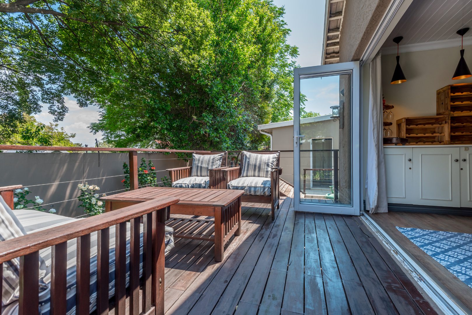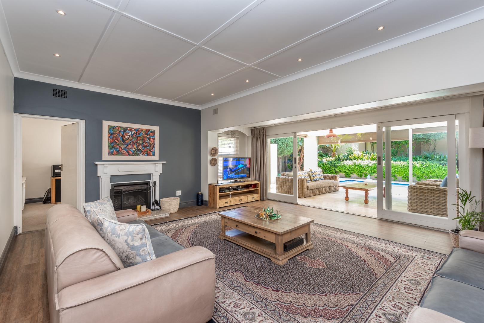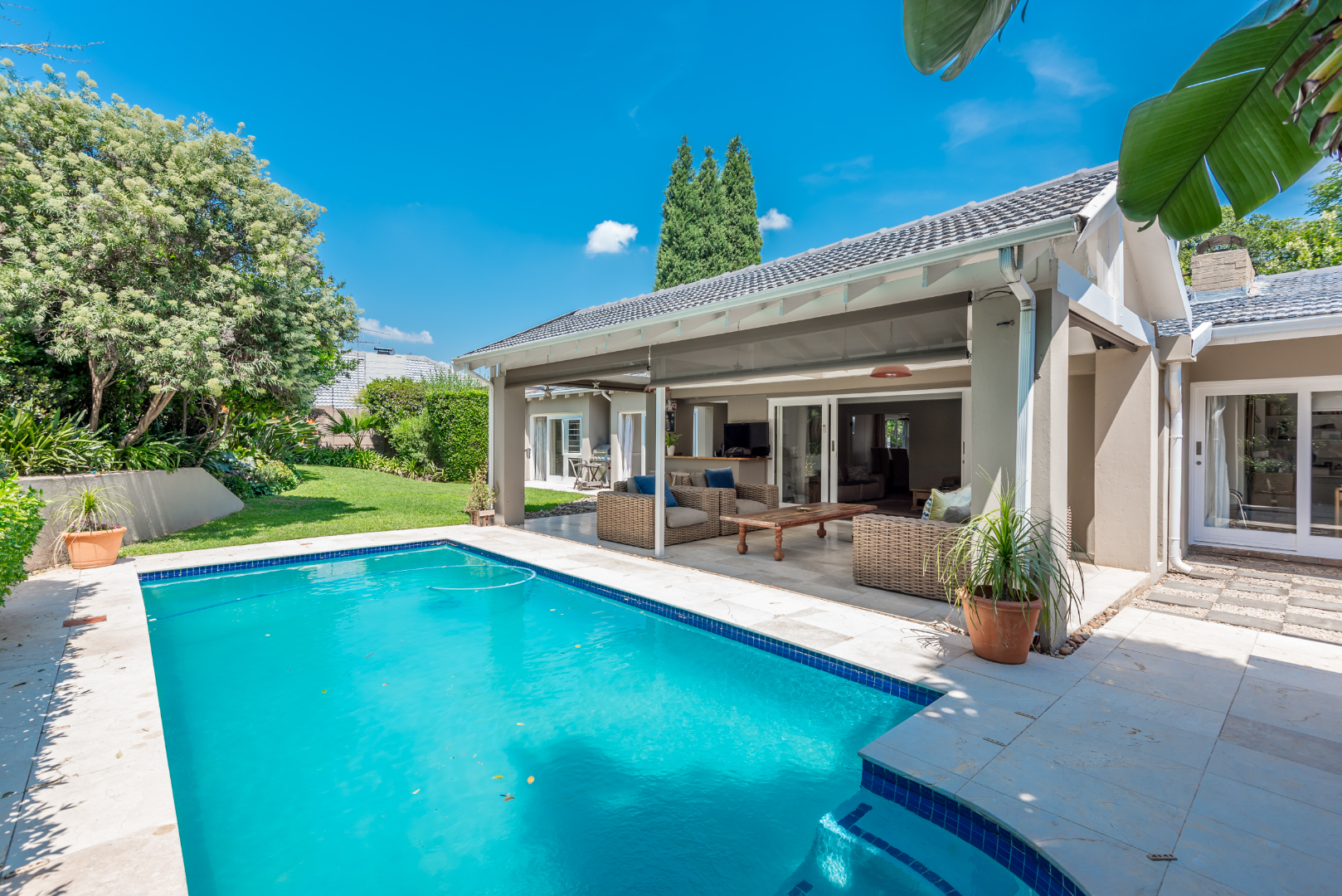 Come and discover this lovely family home with high ceilings, lots of natural light shinning throughout, nestled in a secure, gated community in the heart of Parkmore, Sandton. This suburban gem offers a relaxed lifestyle with plenty of space for everyone. As you step inside, you'll find a welcoming open-plan layout that connects the living areas seamlessly. The home features a comfortable lounge with a cozy fireplace for those cooler evenings, and a dedicated 12 to 14 seater dining room that also is blessed with a gas fireplace overlooking an outside decked area and garden that connects the indoor and outdoor spaces beautifully, perfect for family meals or entertaining friends. You'll also love the built-in bar, ideal for mixing your favourite drinks whilst watching all the favourable sports your heart desires on TV . A massive covered patio that overlooks a sparkling swimming pool and a well kept manicured garden The kitchen is well-equipped with a pantry a breakfast nook and a scullery, making meal prep a breeze, and there's even a dedicated study for when you need to focus.