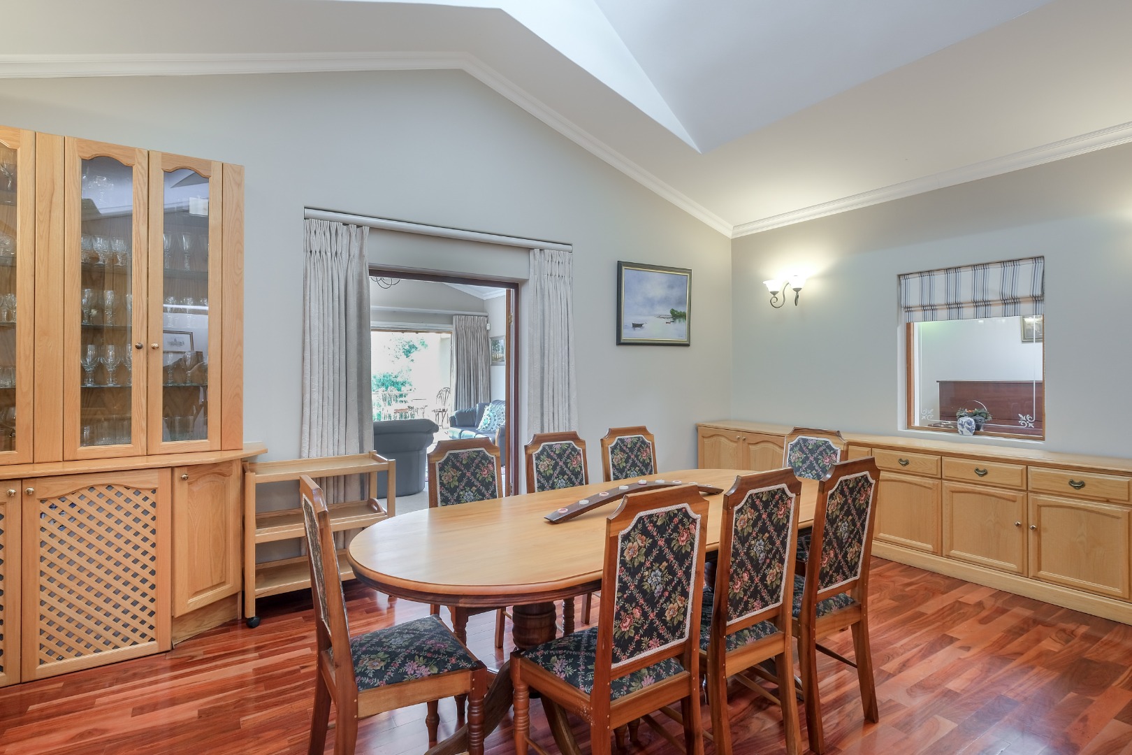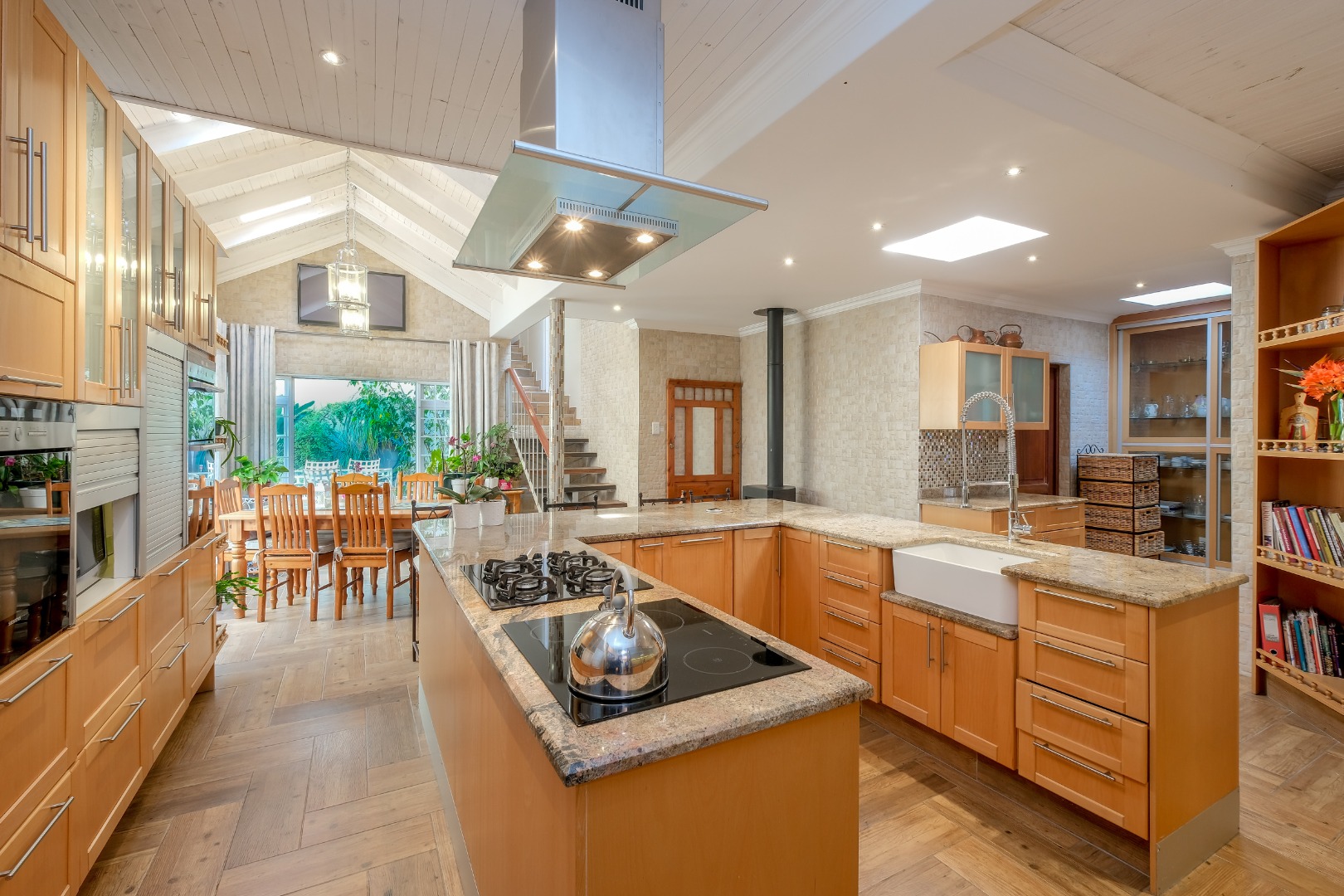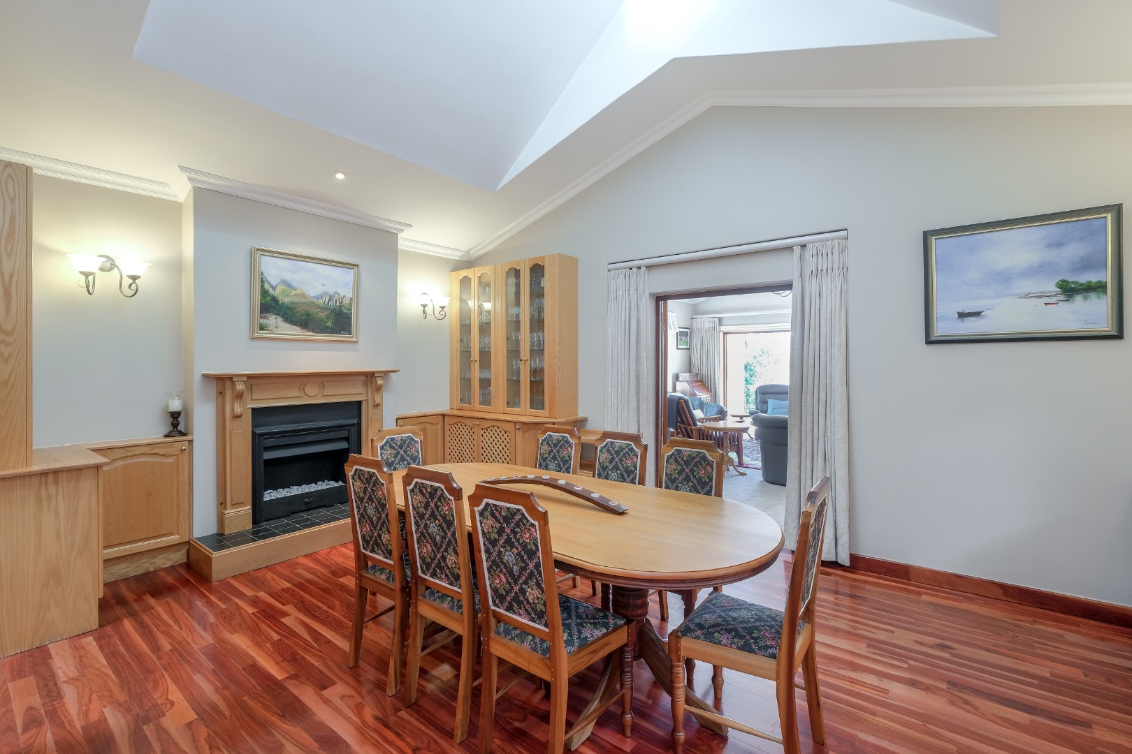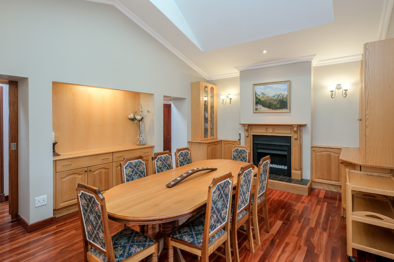 Expansive 12 seater dining room with gas fireplace, skylight, built-in cabinets – perfect for family gatherings