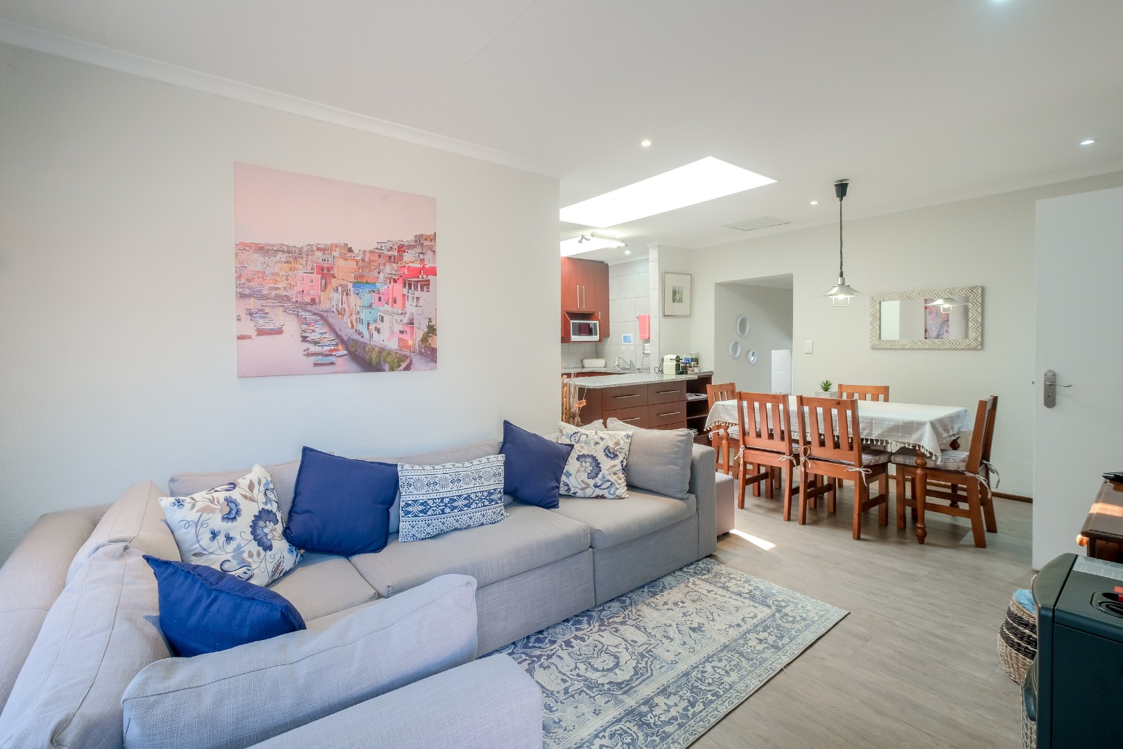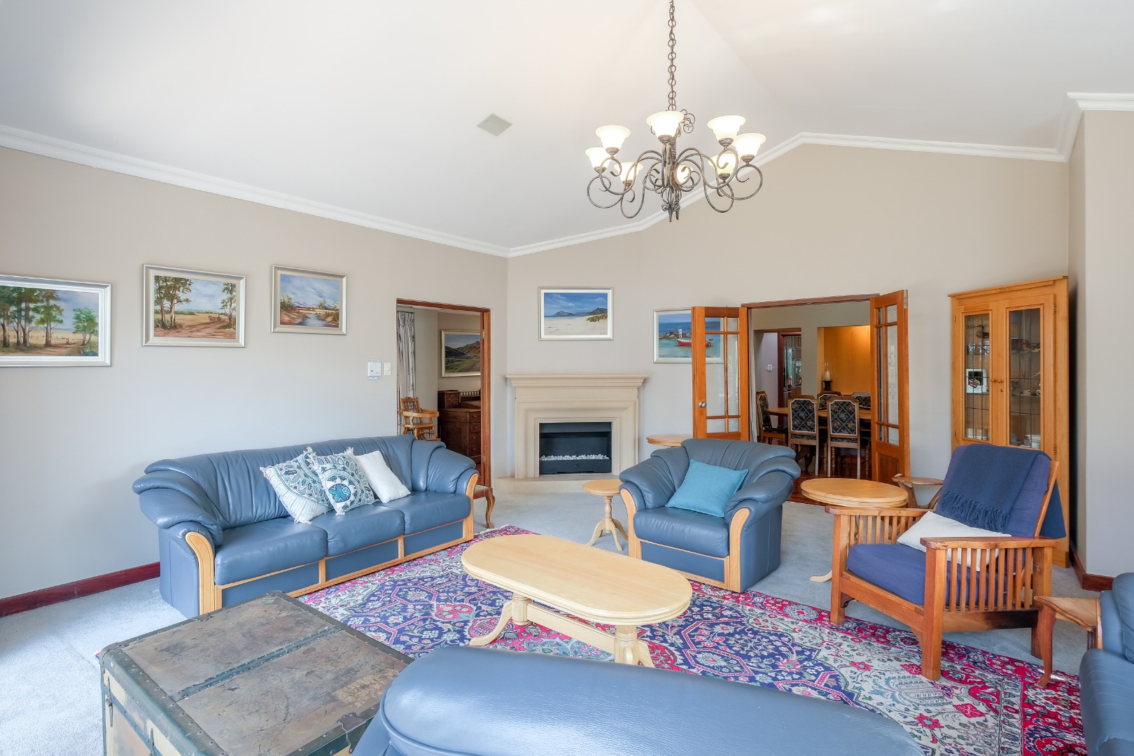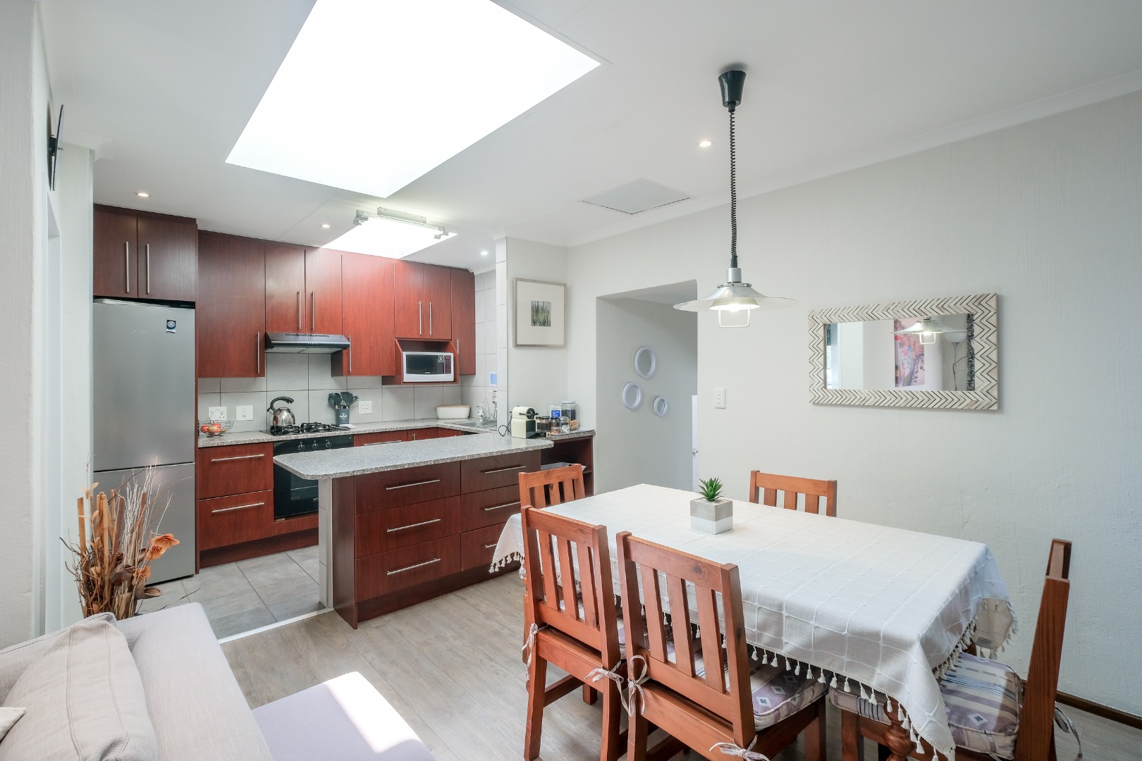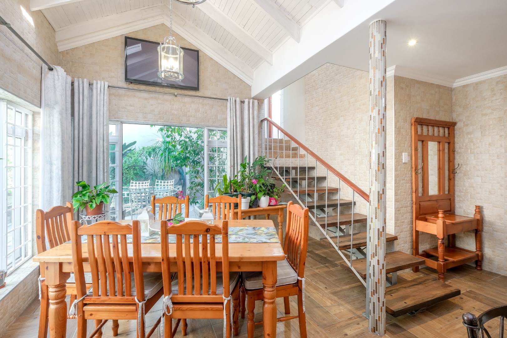 Expansive 12 seater dining room with gas fireplace, skylight, built-in cabinets – perfect for family gatherings