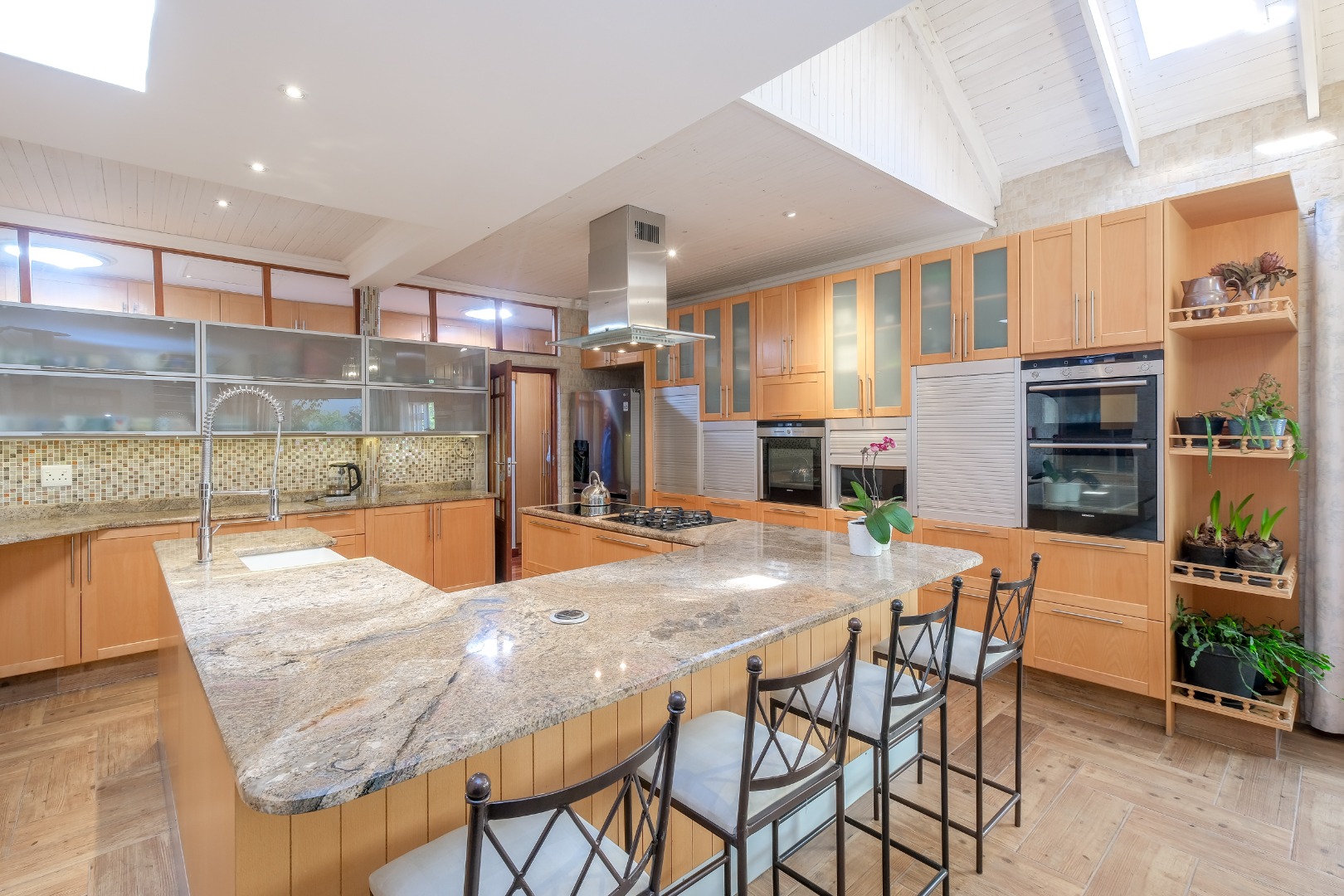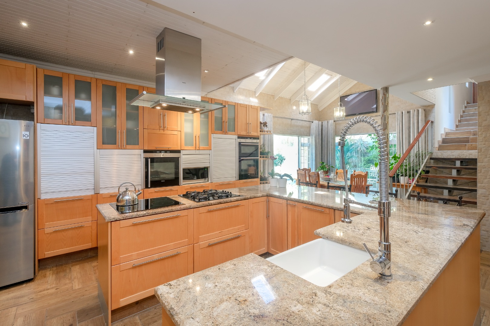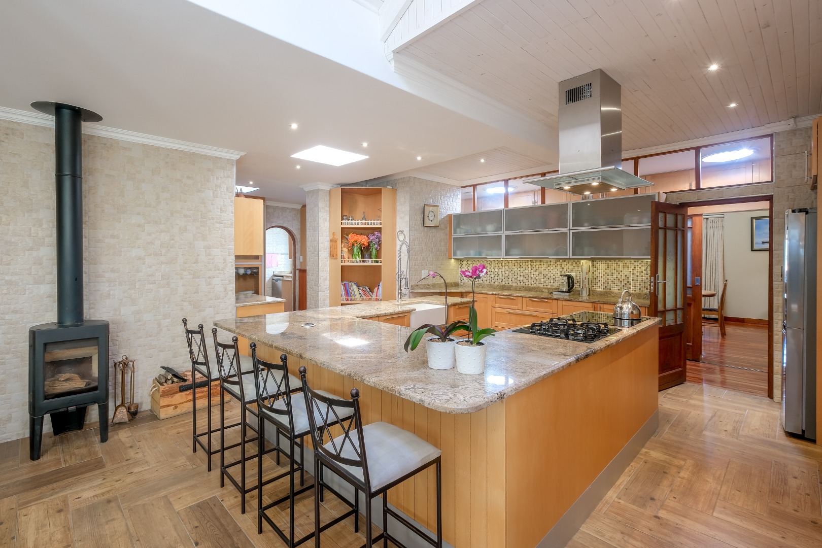 Exceptional Gourmet Kitchen with massive centre island, breakfast table, closed cumbustion fireplace & Courtyard