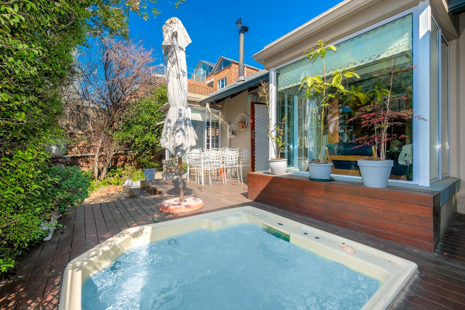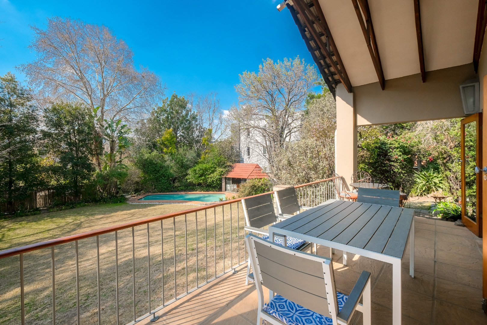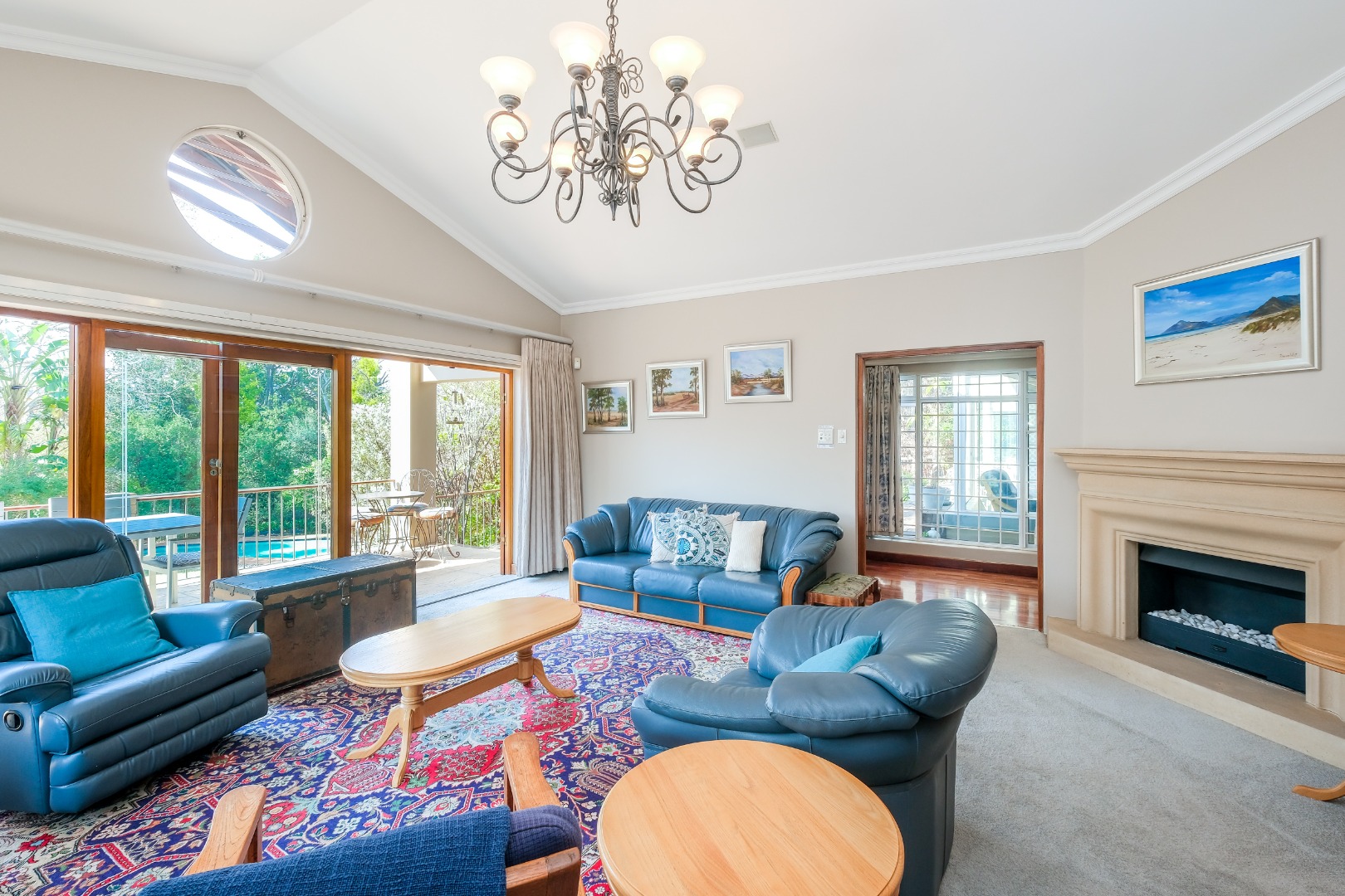 Elegant Living Spaces with gas fireplace leading out onto a covered patio overlooking a tranquil garden, swimming pool and tall lush trees lots of greenery and blue skies