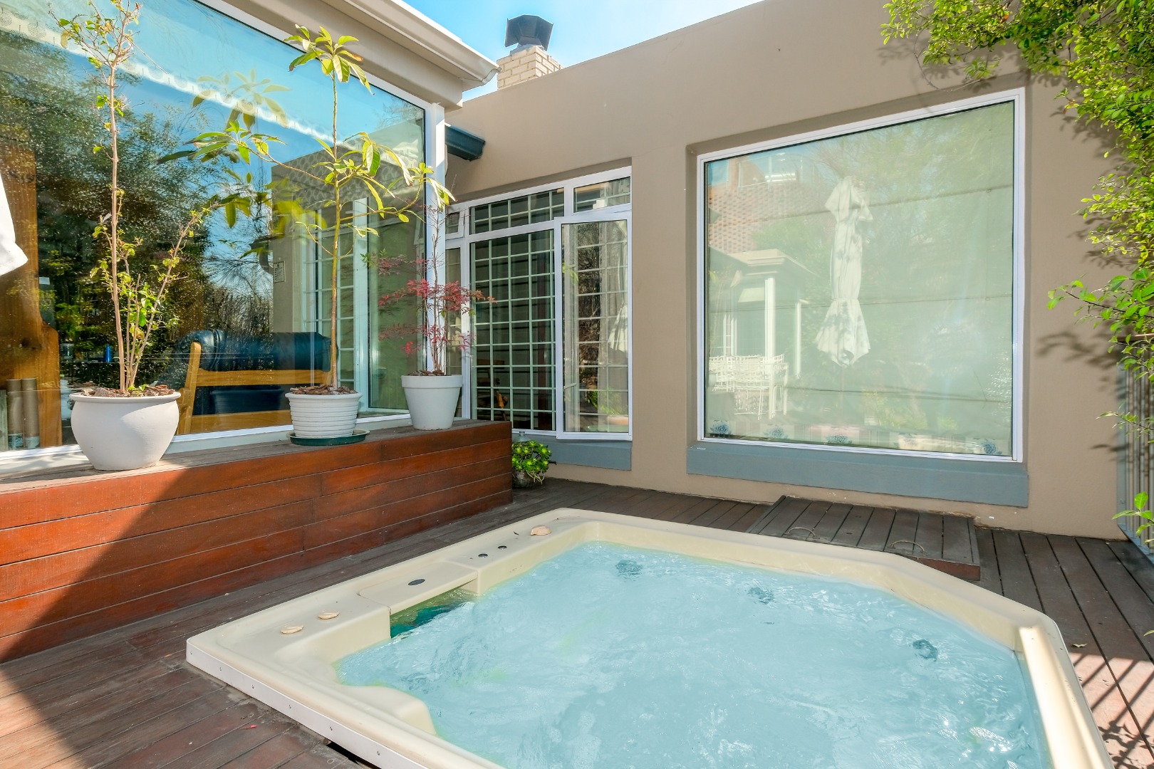 Master Bedroom en-suite with spa bath, double shower, walk-in closet, closed combustion fireplace, private study that all lead out onto a patio with a jacuzzi on wooden deck overlooking the well manicured garden