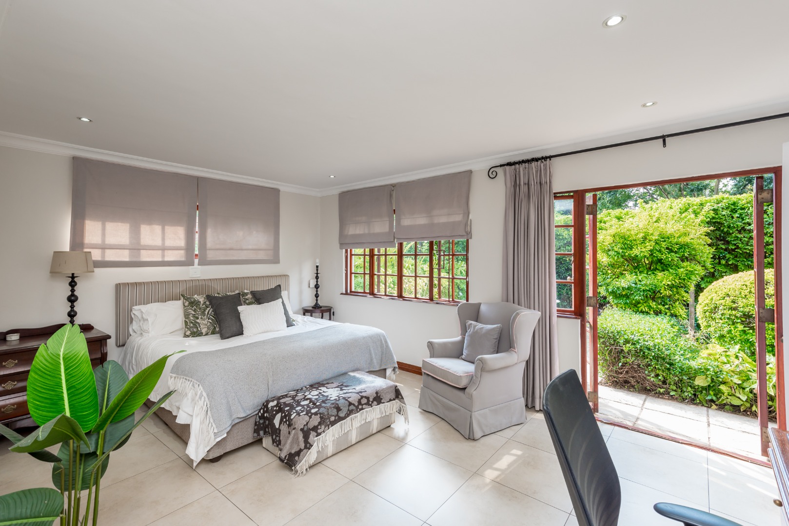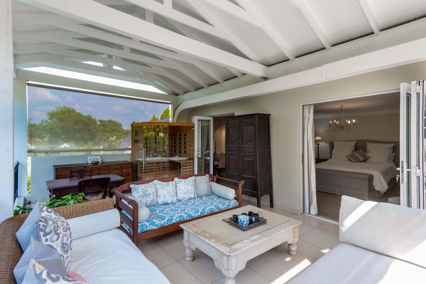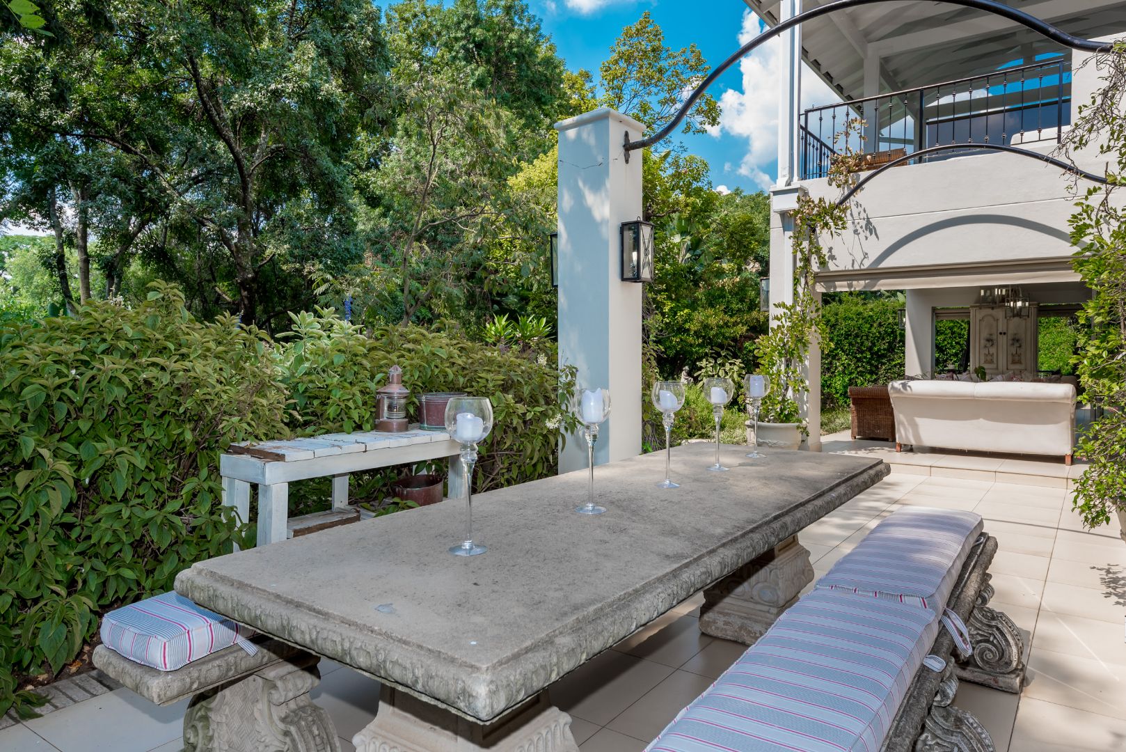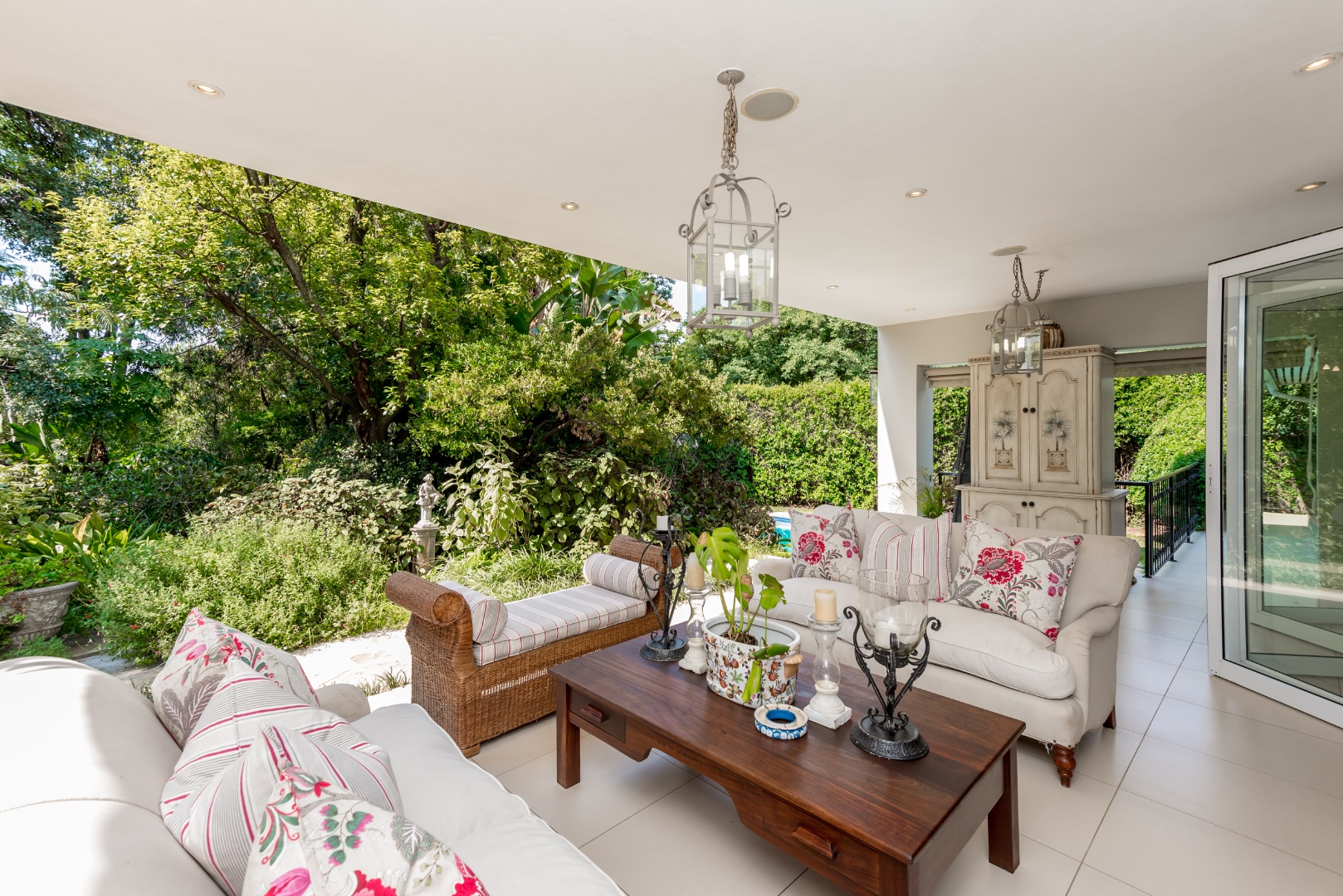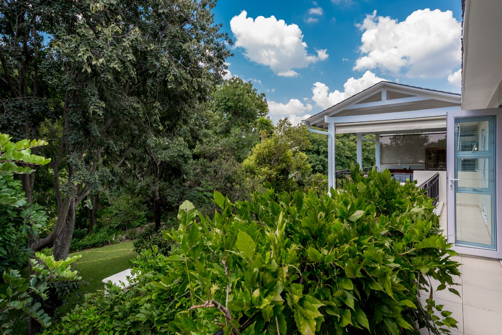 Surrounded by tall lush trees, and rolling greenery, the home enjoys beautiful views of blue skies and tranquil garden vistas. the sparkling pool the Boma, the trampoline are all situated in an awesome manicured garden, ideal for invites long evenings of entertainment under the stars or children playing freely in a secure and expansive setting.