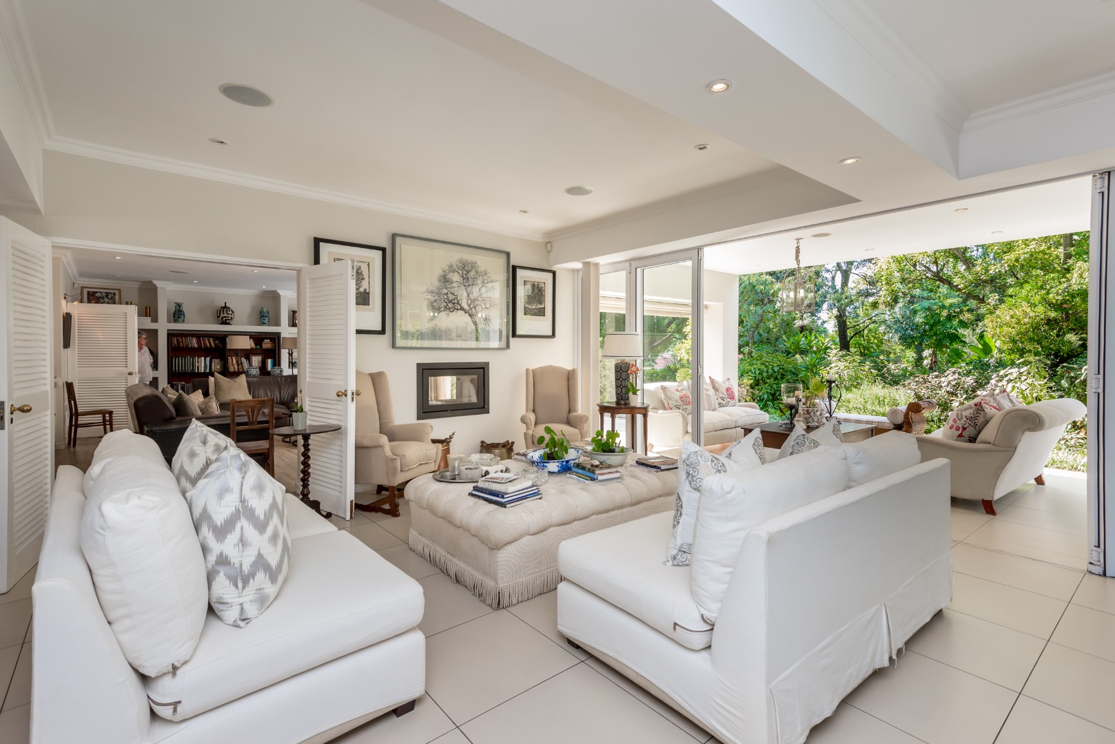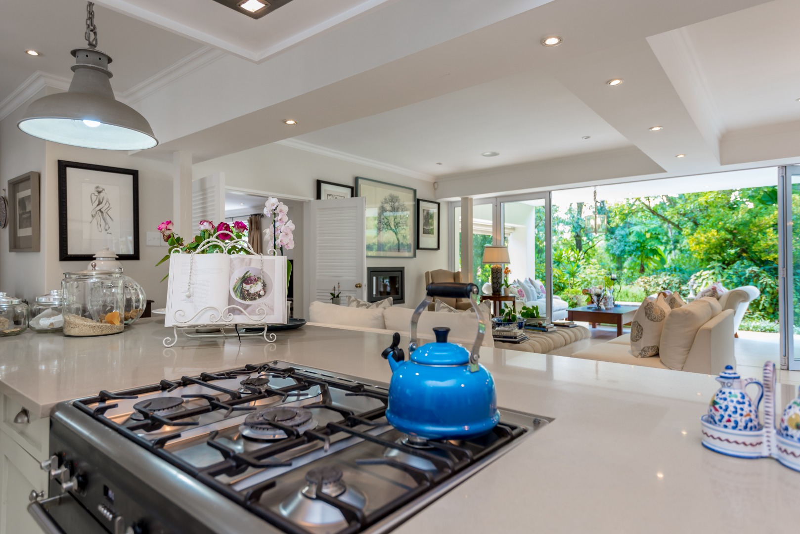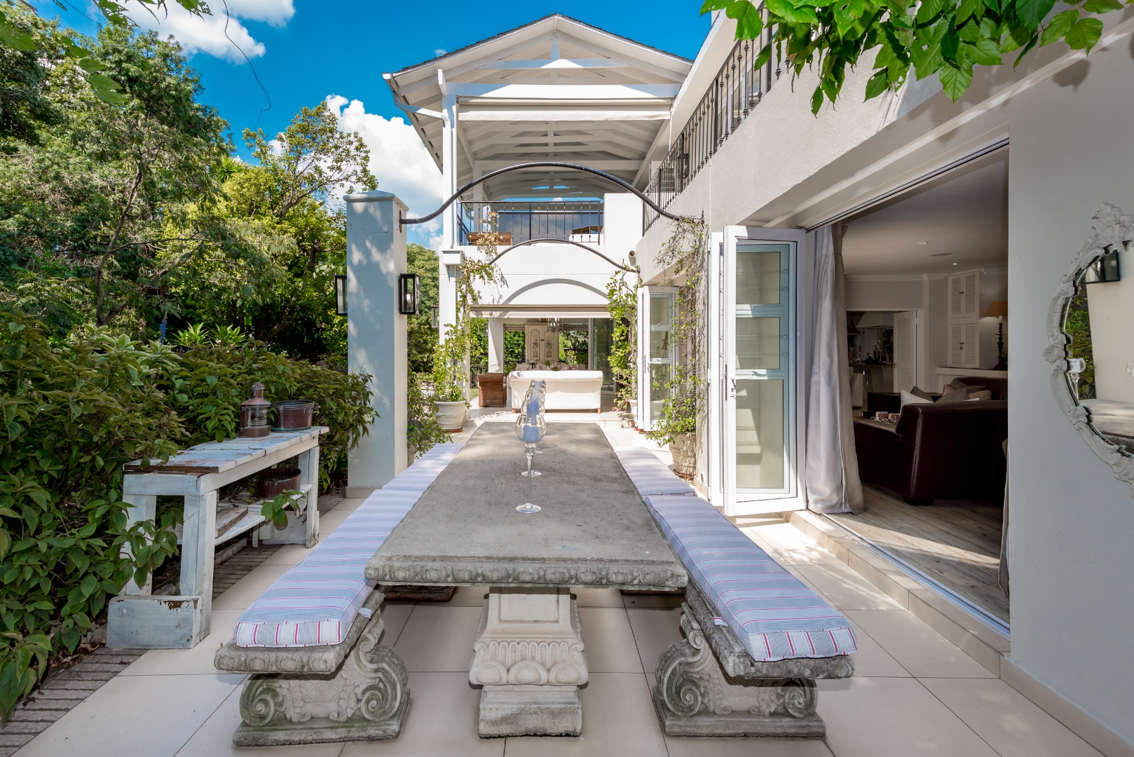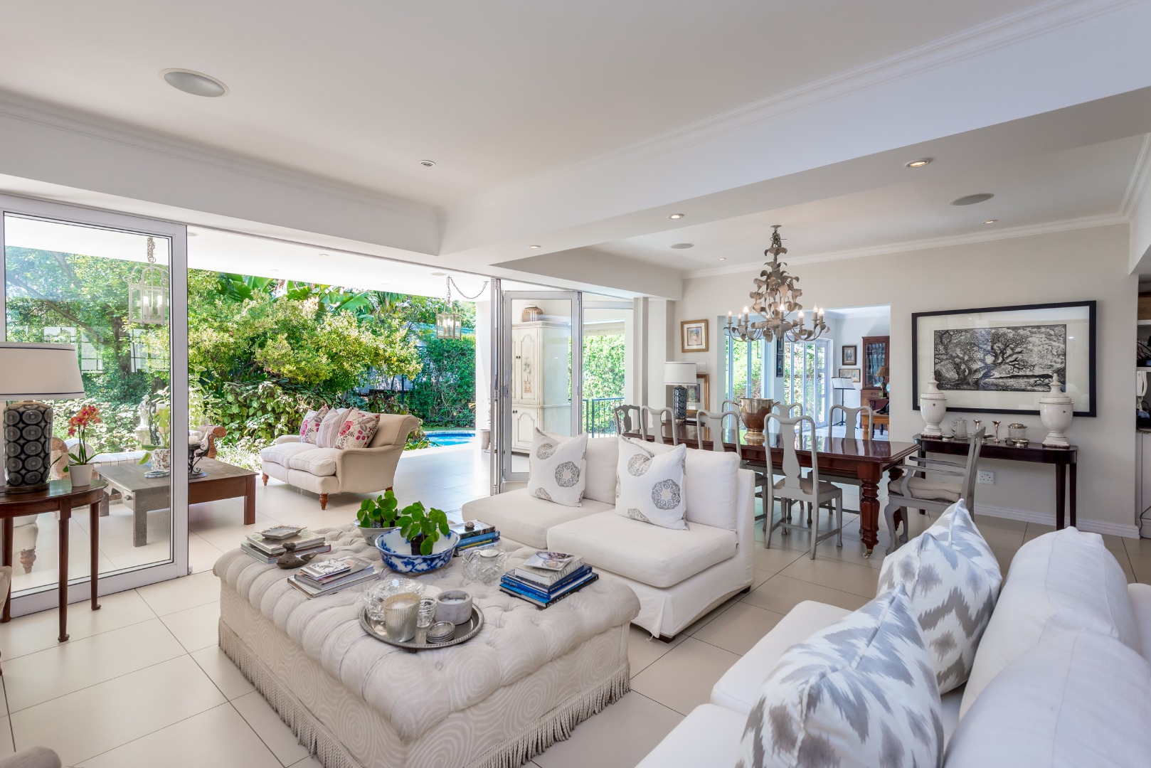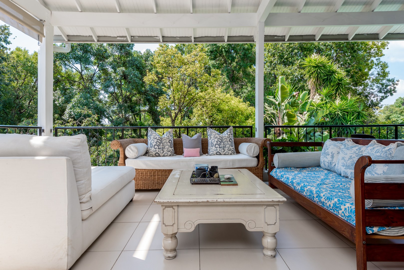 Surrounded by tall lush trees, and rolling greenery, the home enjoys beautiful views of blue skies and tranquil garden vistas. the sparkling pool the Boma, the trampoline are all situated in an awesome manicured garden, ideal for invites long evenings of entertainment under the stars or children playing freely in a secure and expansive setting.