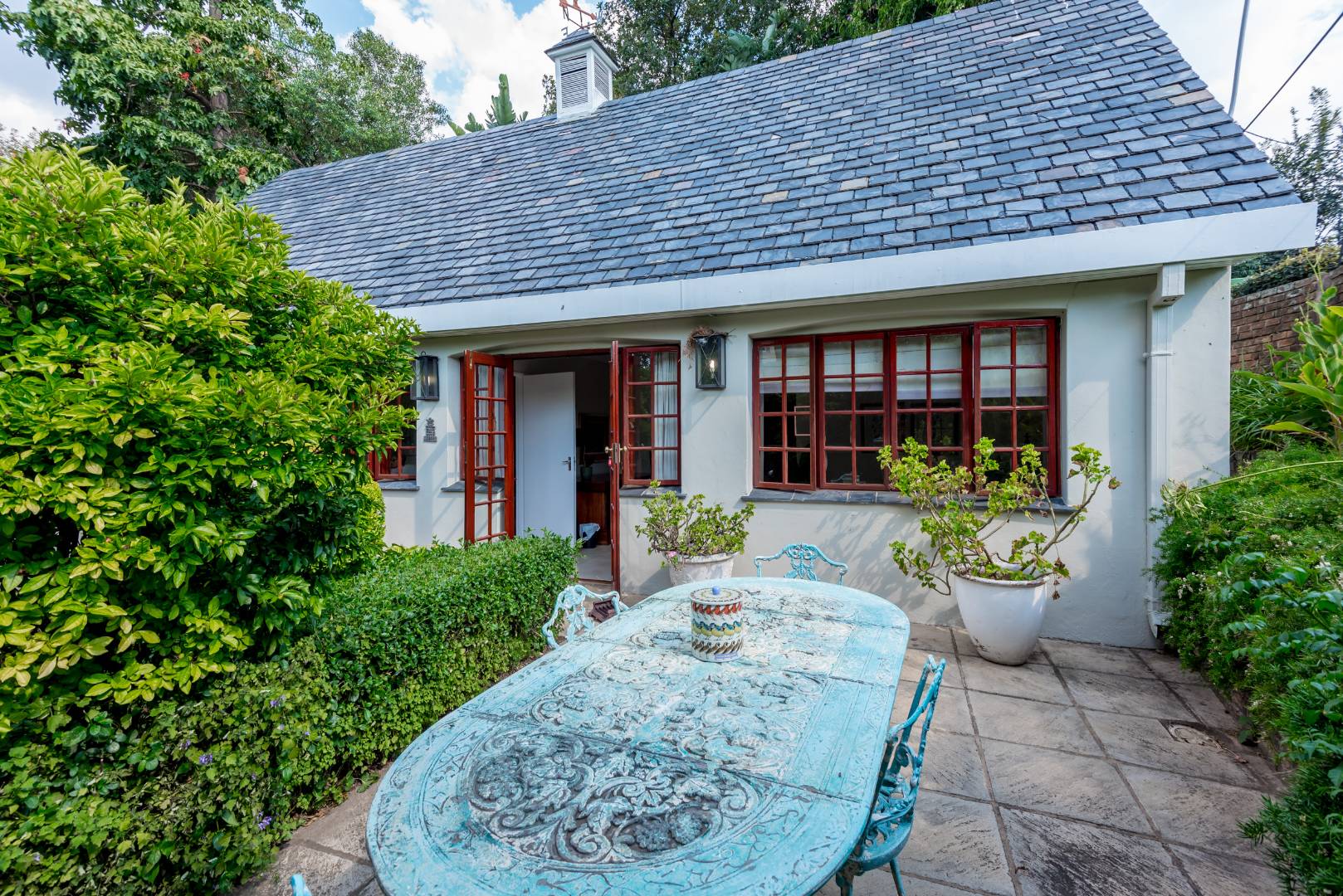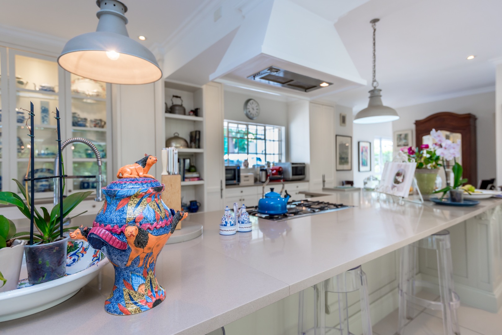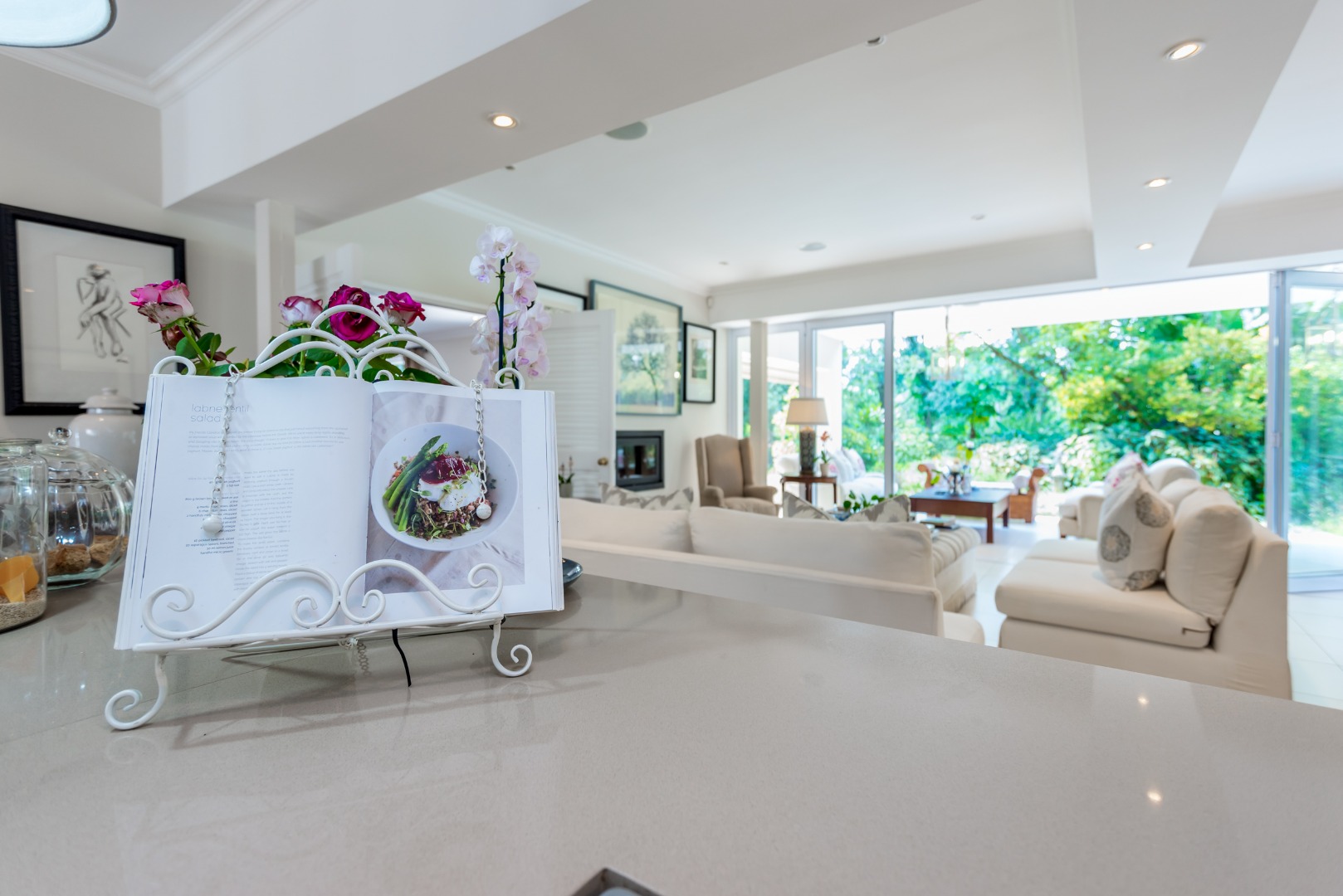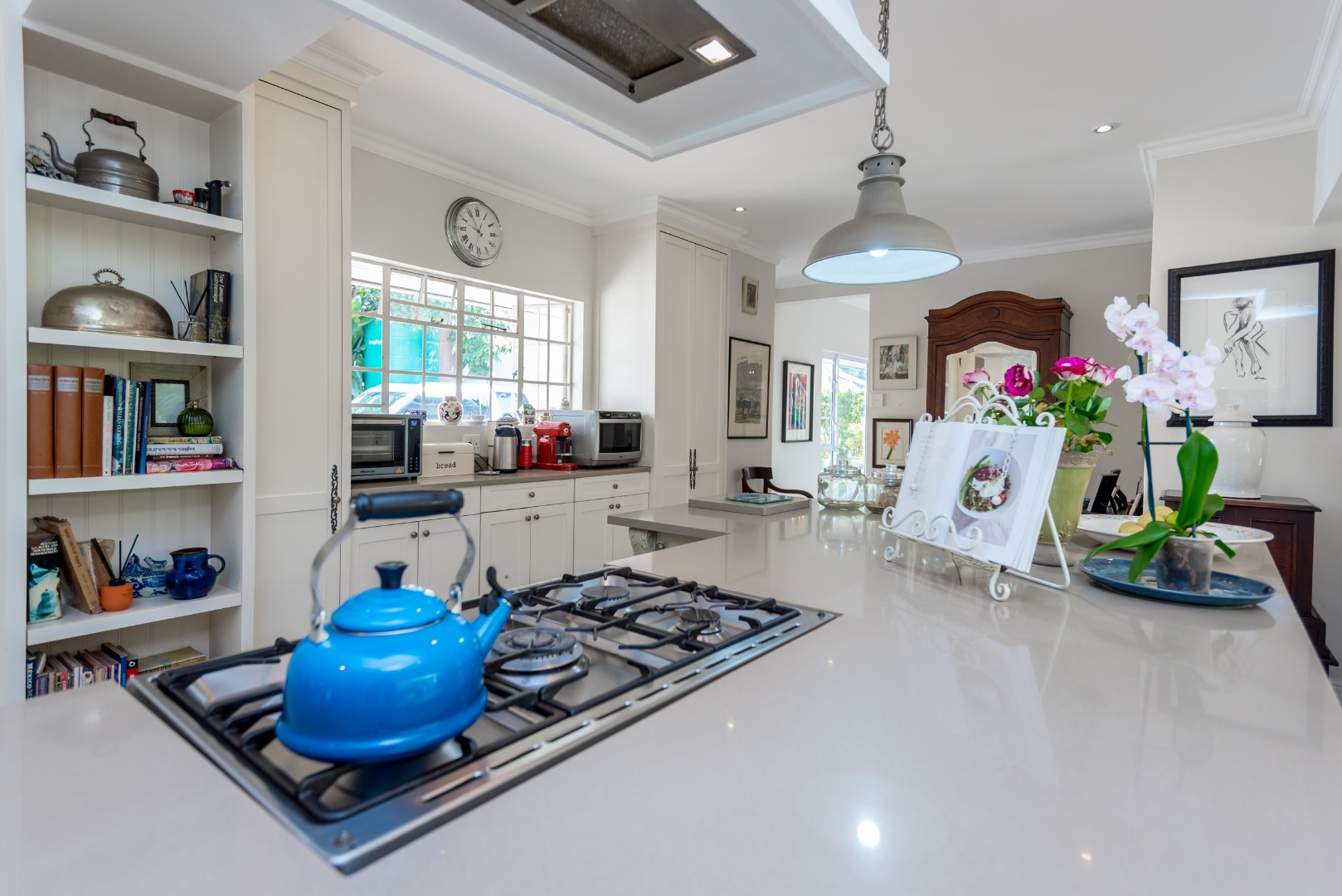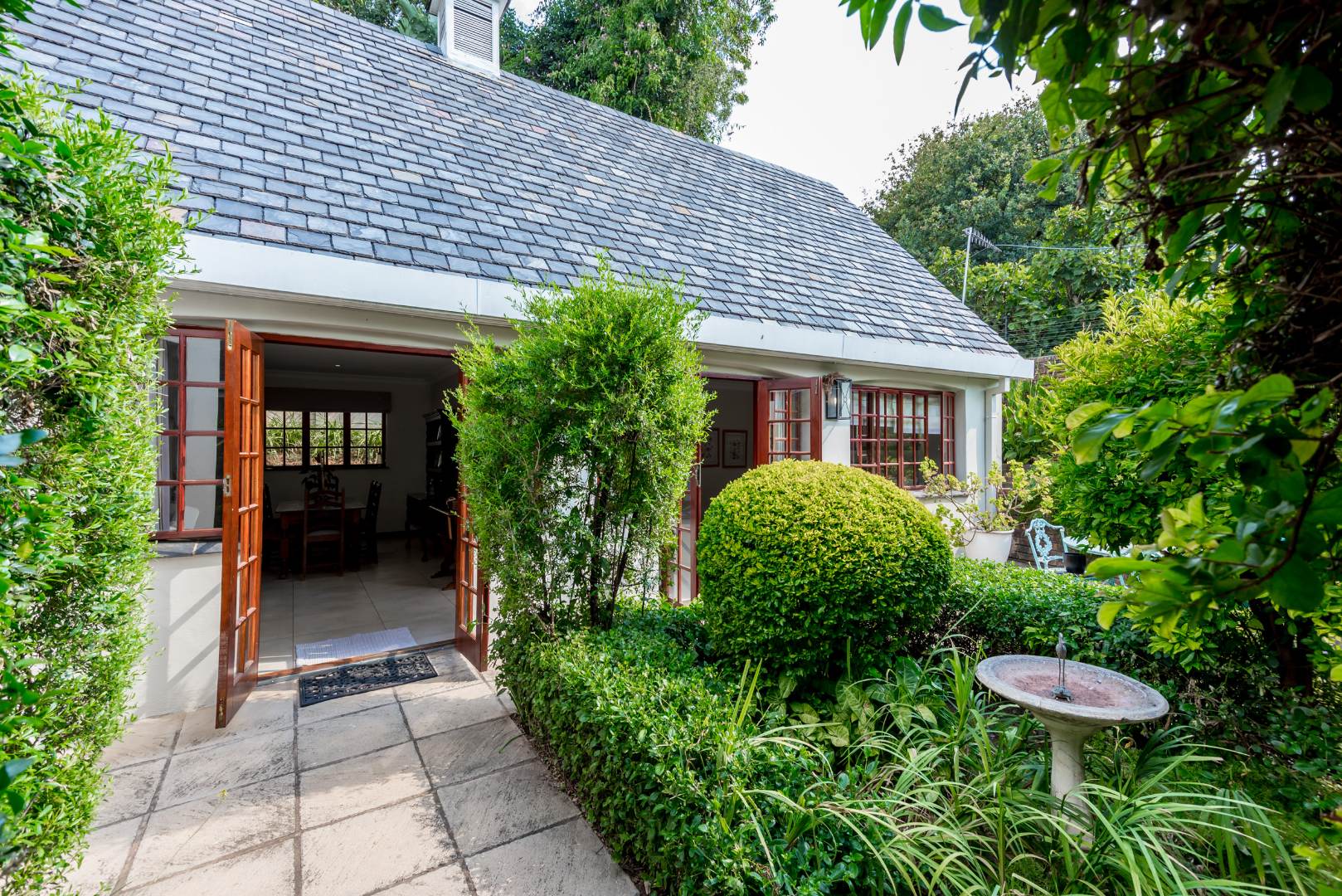Surrounded by tall lush trees, and rolling greenery, the home enjoys beautiful views of blue skies and tranquil garden vistas. the sparkling pool the Boma, the trampoline are all situated in an awesome manicured garden, ideal for invites long evenings of entertainment under the stars or children playing freely in a secure and expansive setting.