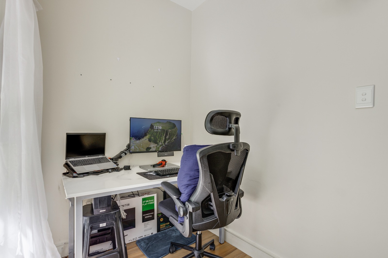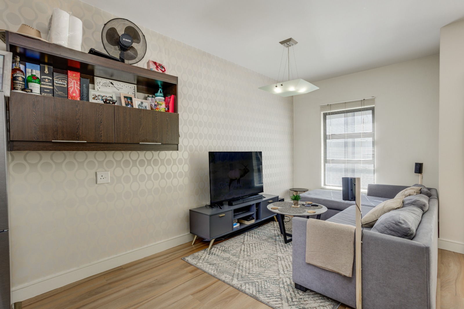 The unit offers an open-plan living area, a functional kitchen, and a comfortable bedroom with built-in cupboards. The bathroom is neat and modern.