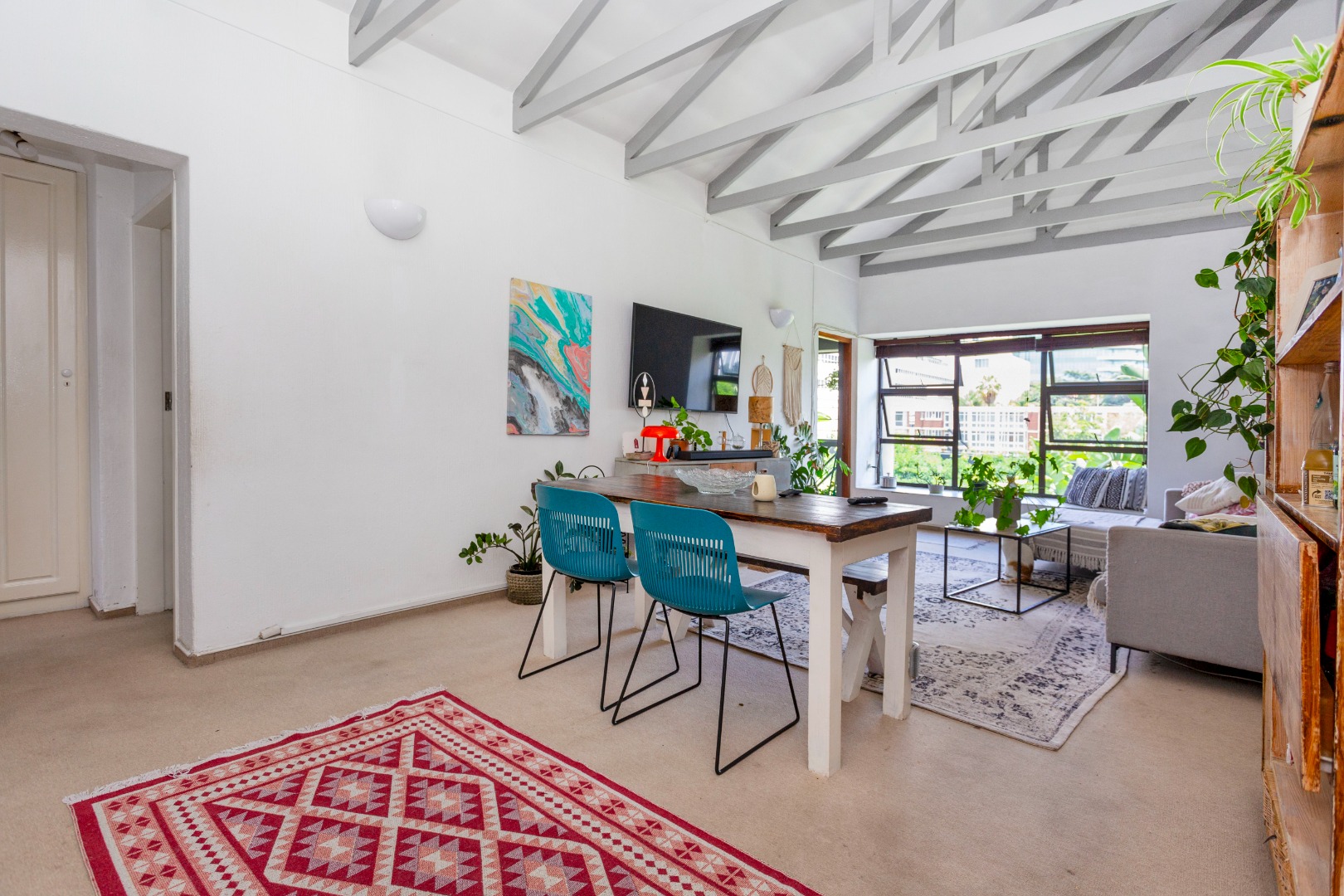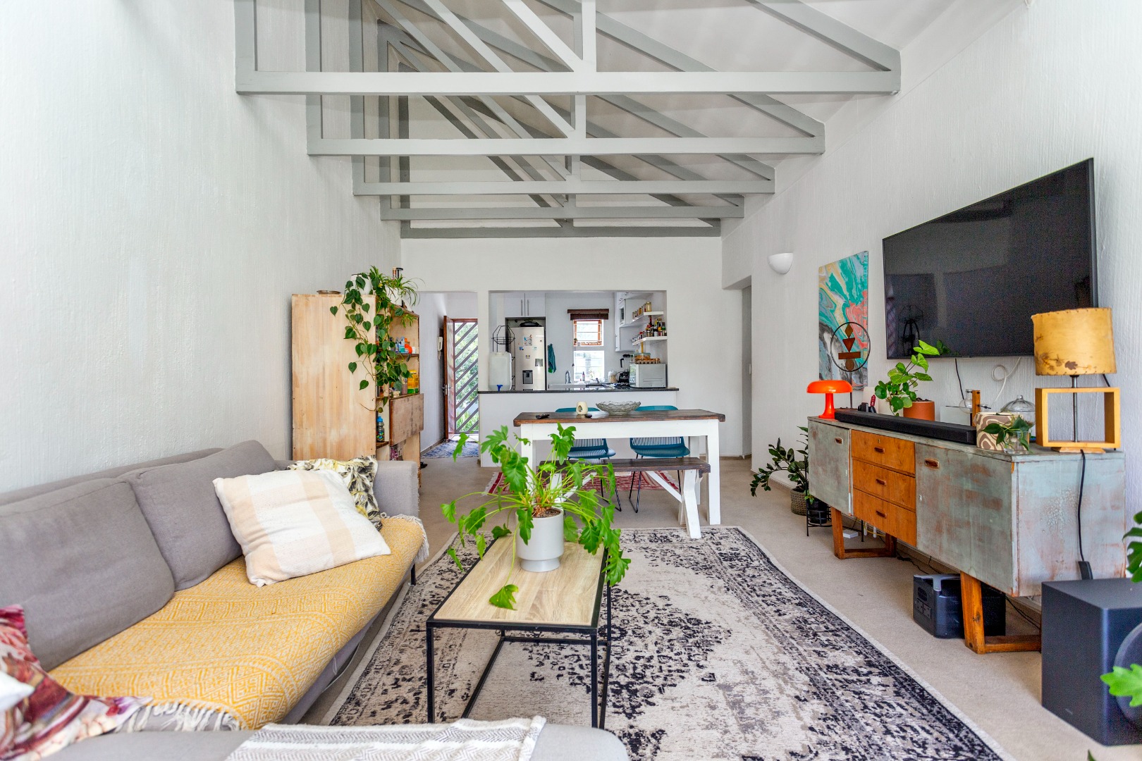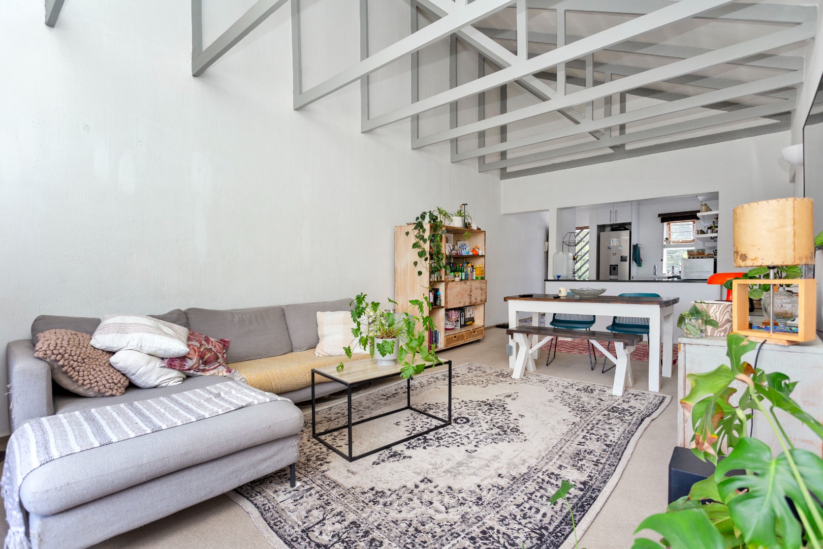 * Open-plan living with exposed beams