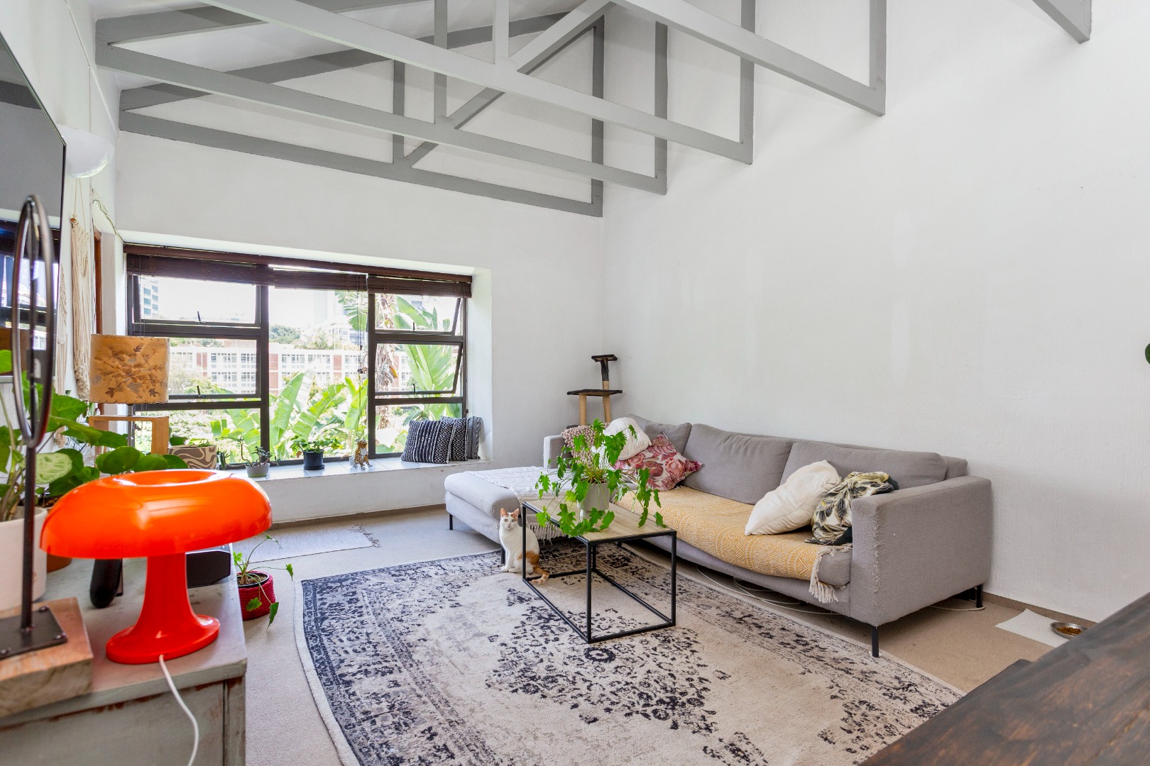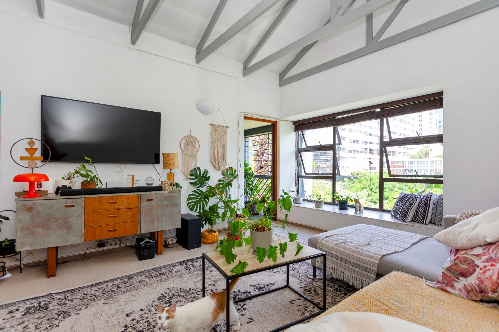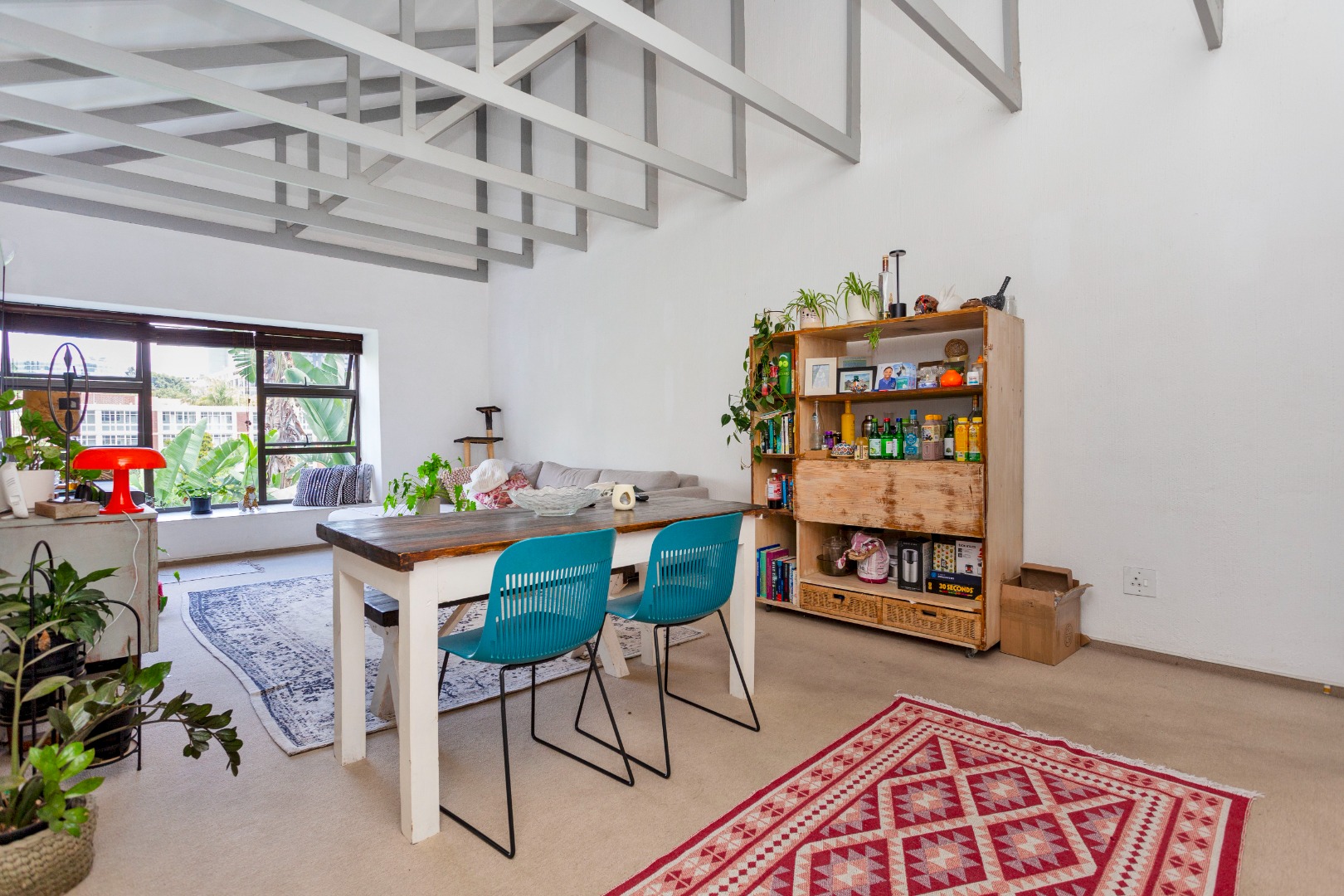 * Open-plan living with exposed beams
