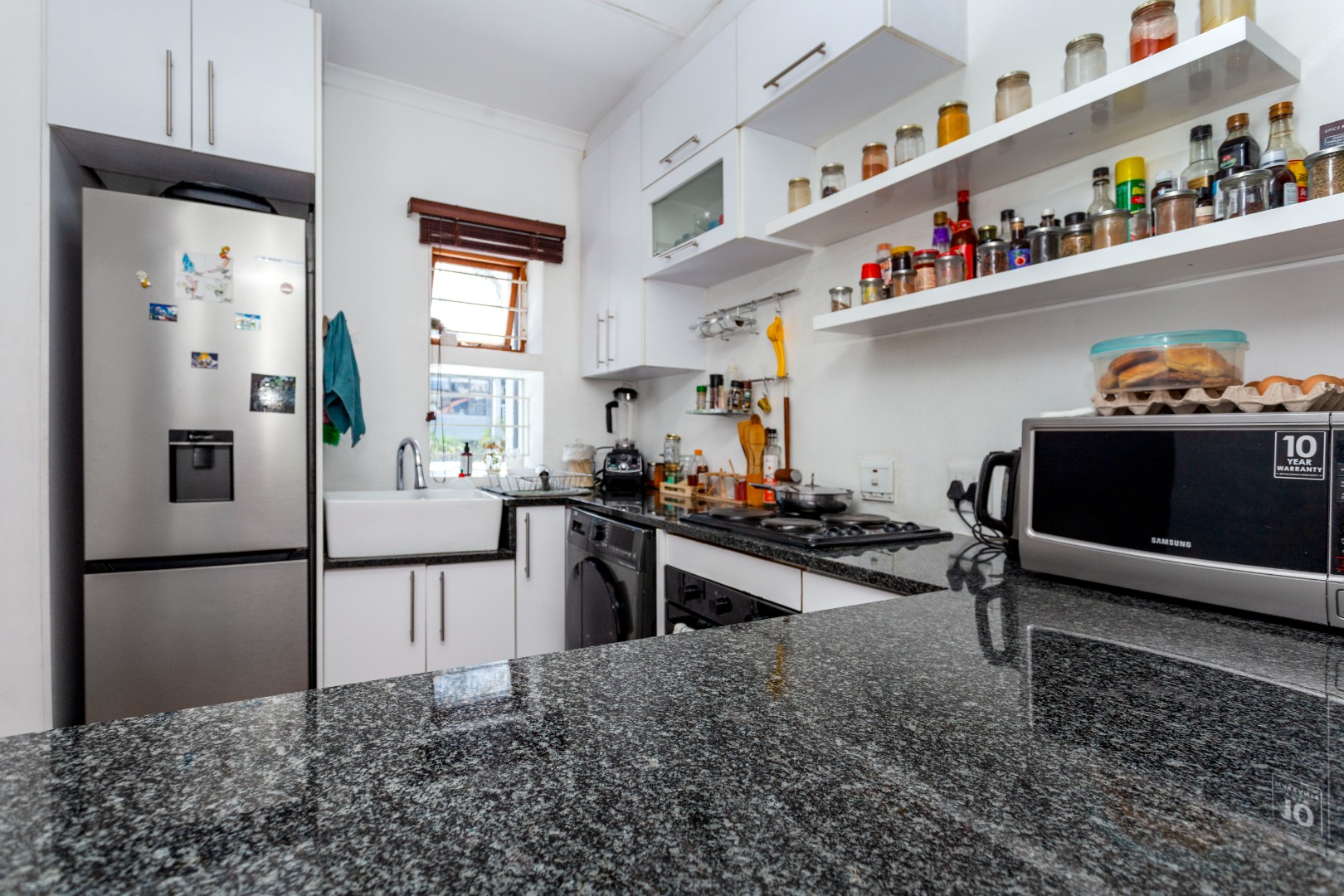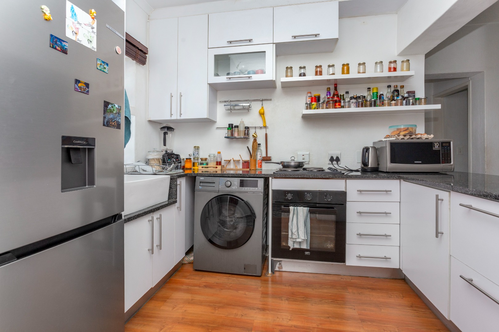 Discover contemporary living in this inviting 88 sqm unit, perfectly situated within a secure complex in Sandown, Sandton. The residence features an open-plan living and dining area, distinguished by high ceilings with exposed beams that enhance the sense of space and character. Abundant natural light floods the interior through large windows, creating a bright and airy atmosphere. The modern kitchen is a highlight, equipped with sleek white cabinetry, granite countertops, built-in oven all complemented by a stylish farmer's sink and warm wood-look flooring.