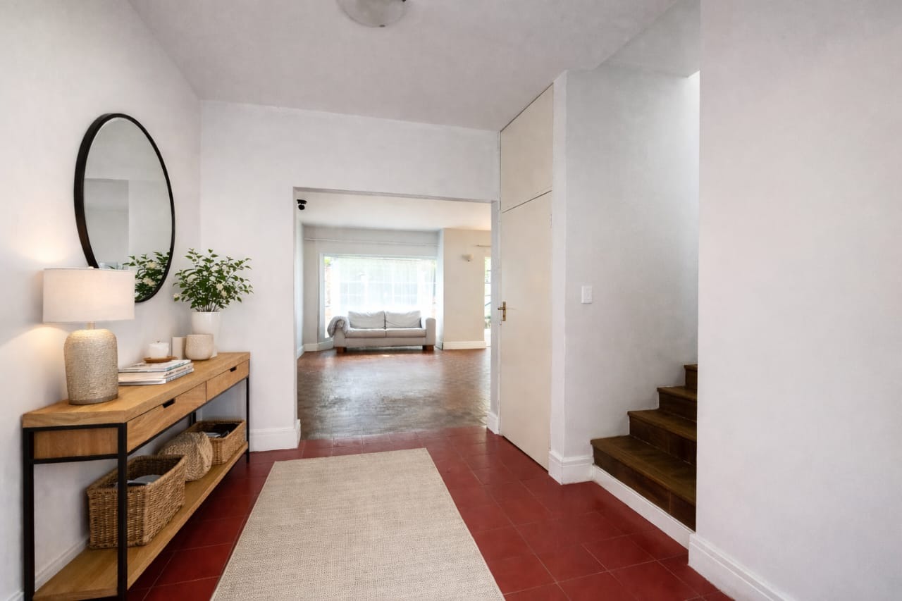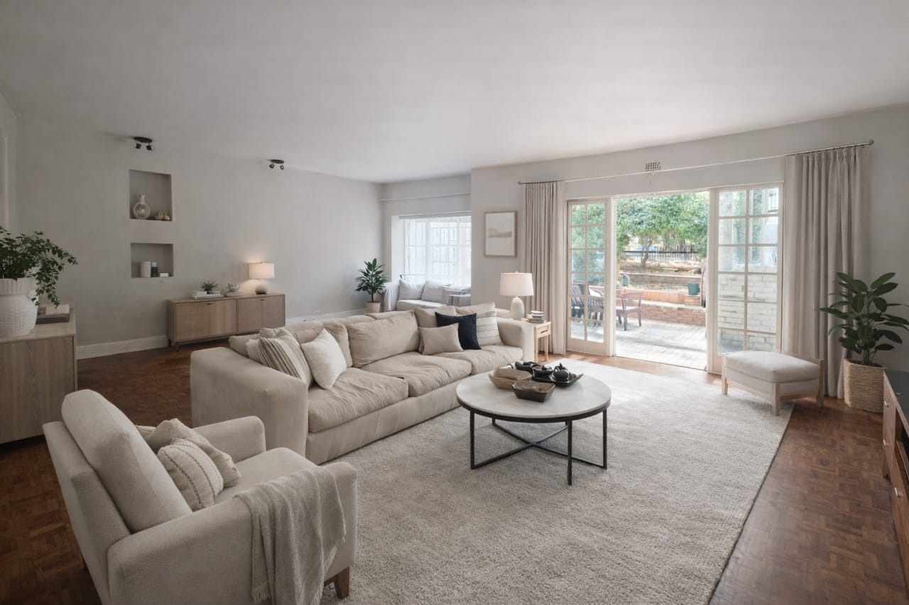 Downstairs you walk into a generous open-plan lounge and dining room, drenched in natural light, with those beautiful parquet floors carrying right through. The French doors open onto a private patio and not a postage stamp patio —> a real one.