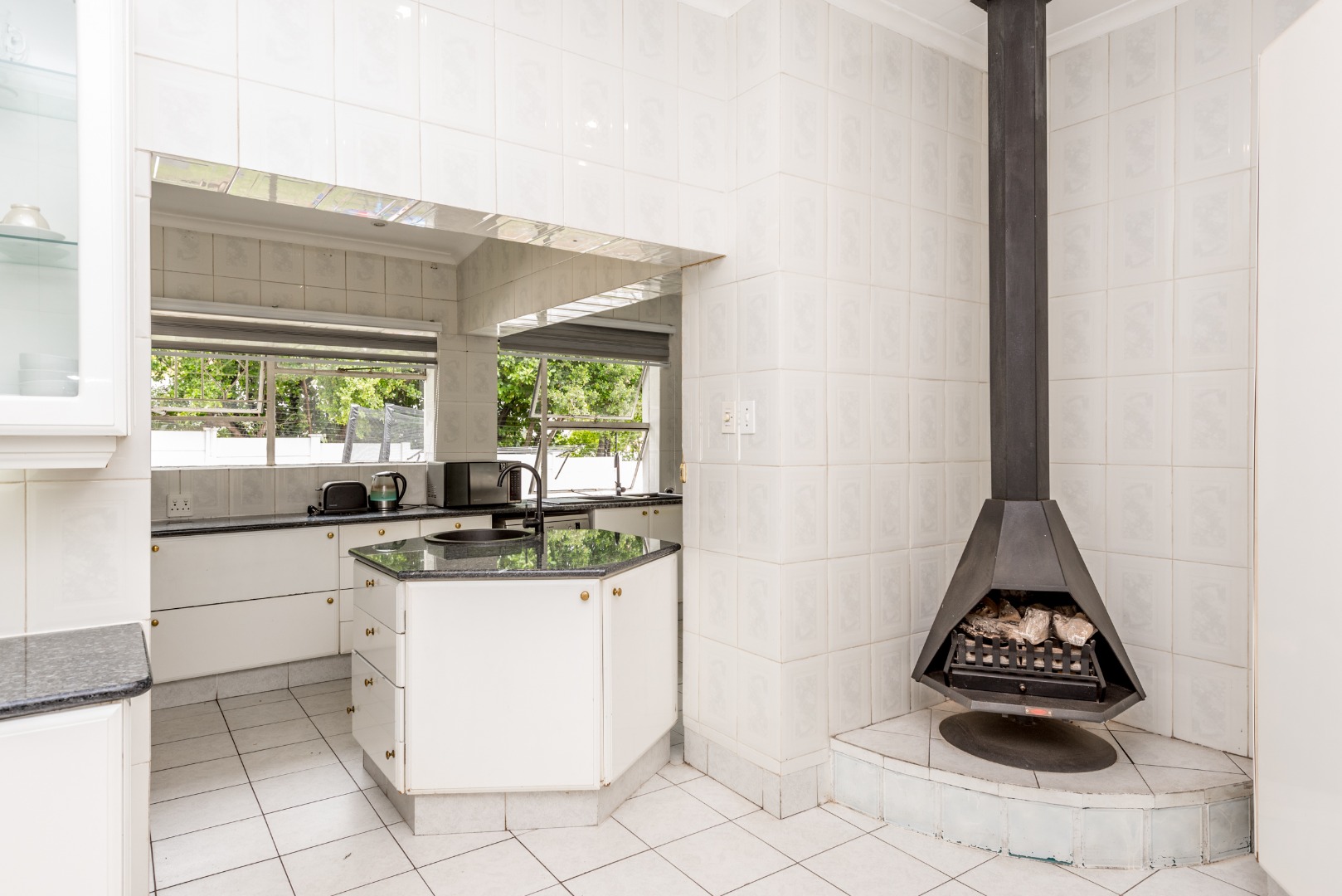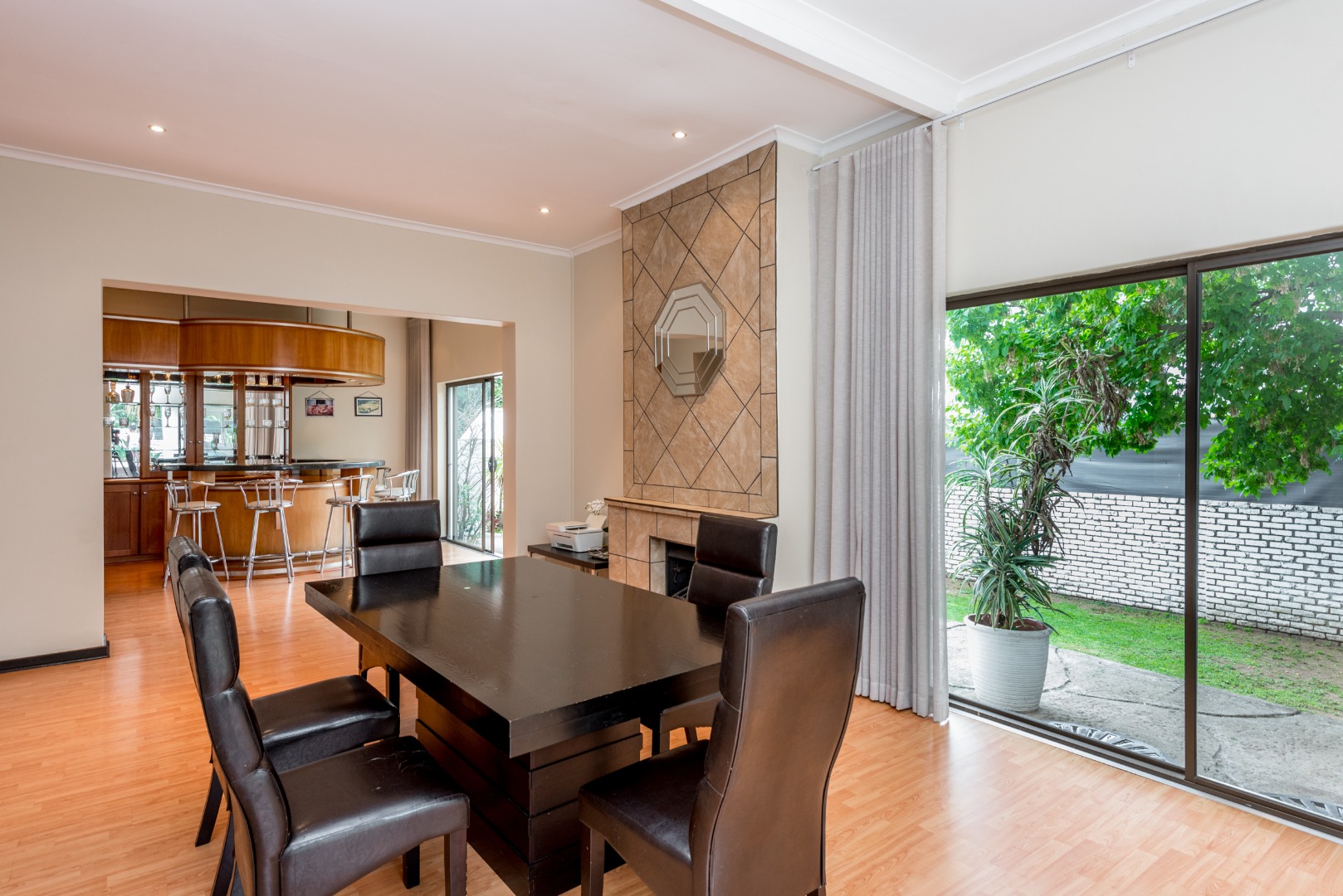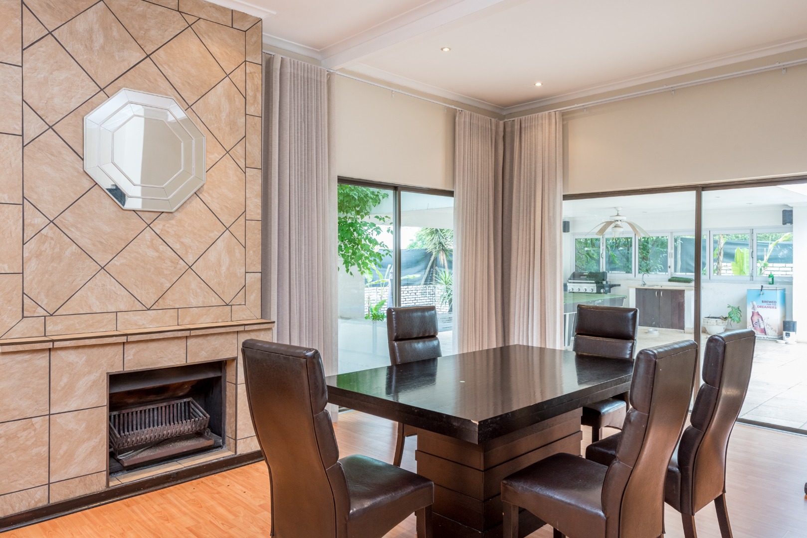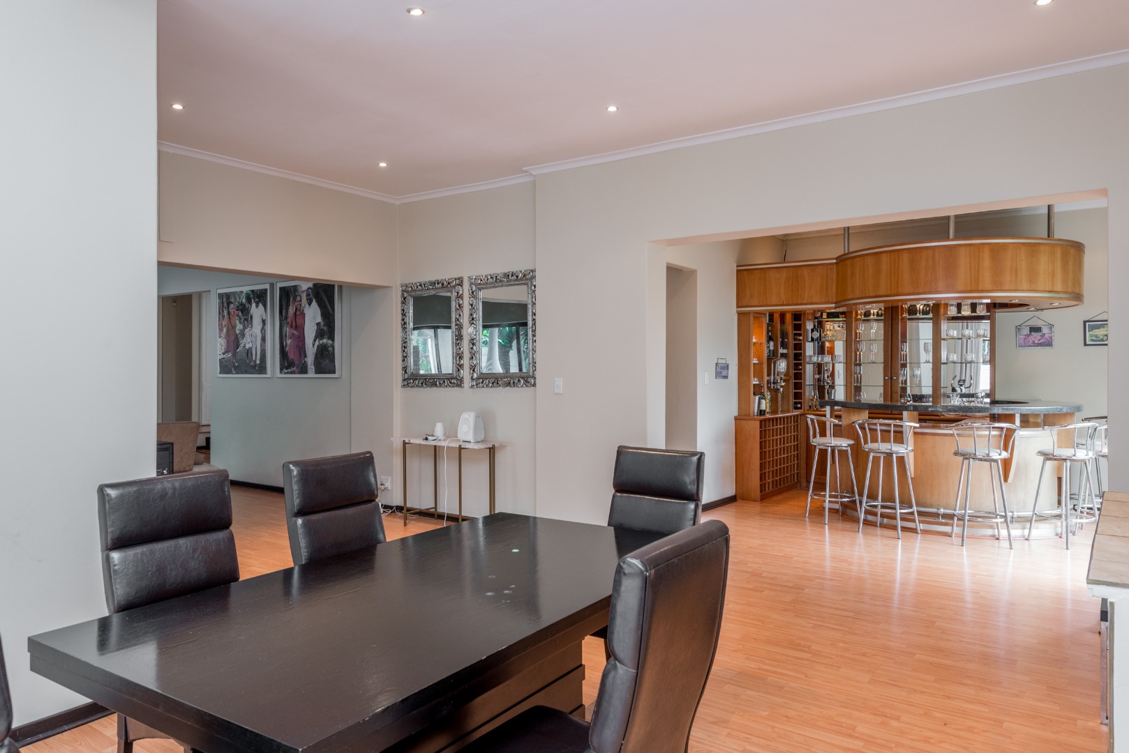 A dedicated 12 to 14 seater dining room that opens out onto the two covered patios as abovementioned, a romantic fire place and a Built in Bar area that also opens out onto a uncovered patio that overlooks the Sandton skyscrapers. Ideal for a family that enjoys and loves entertaining through-out the year with friends and guests.