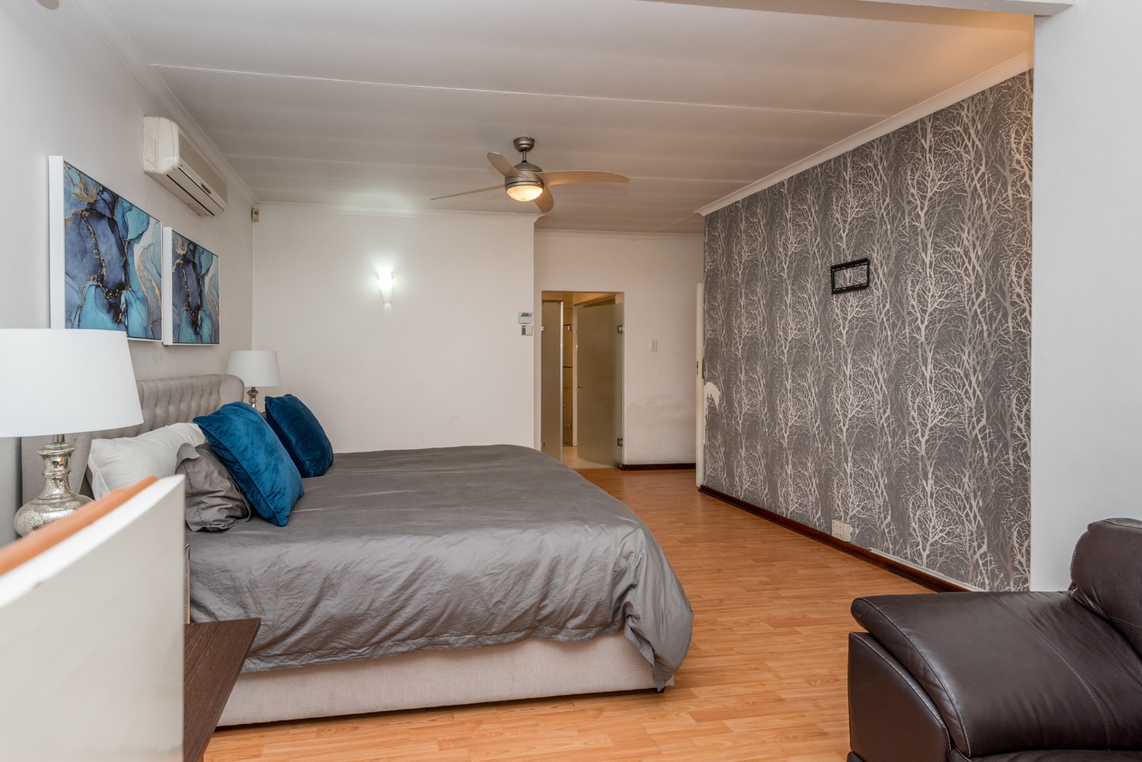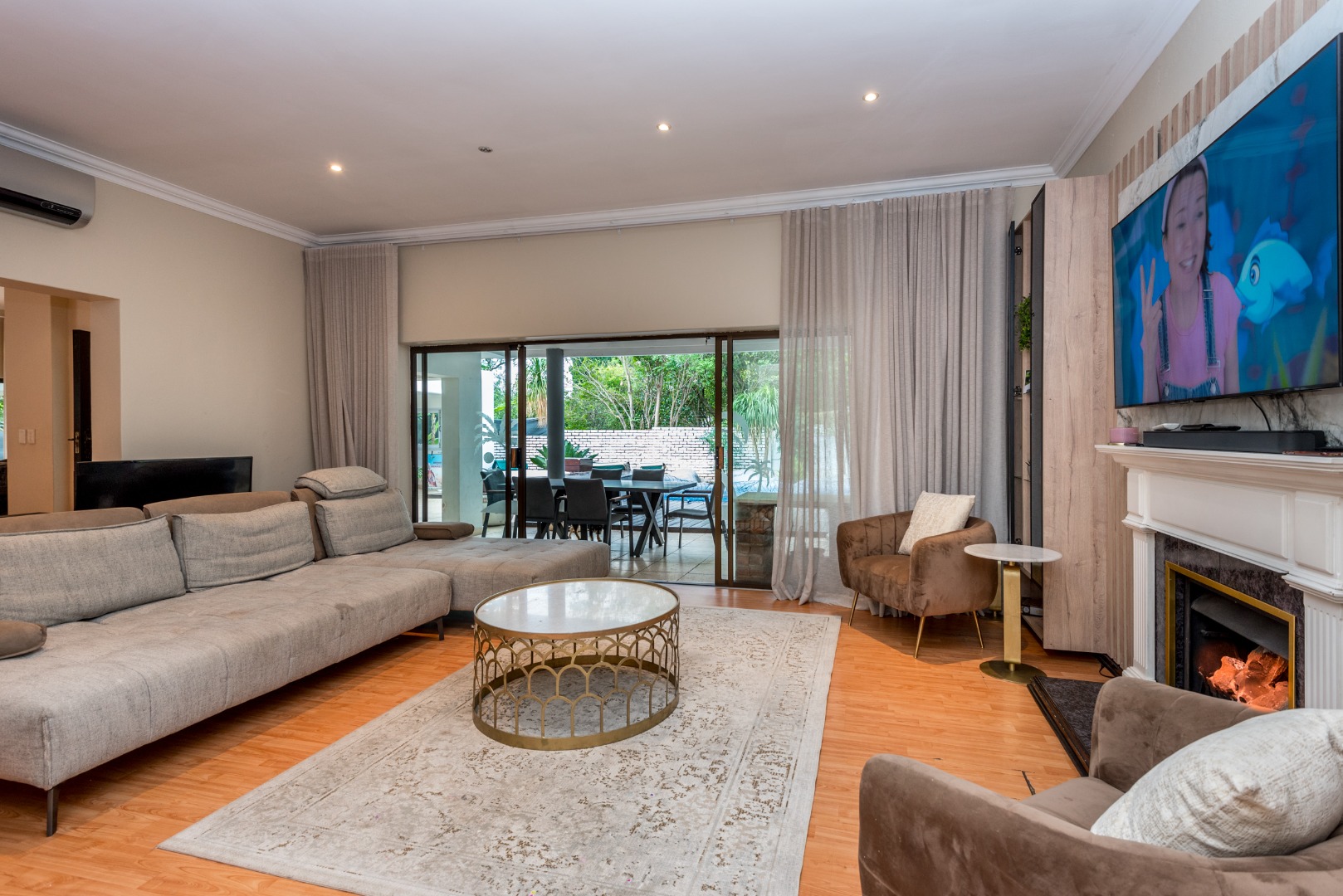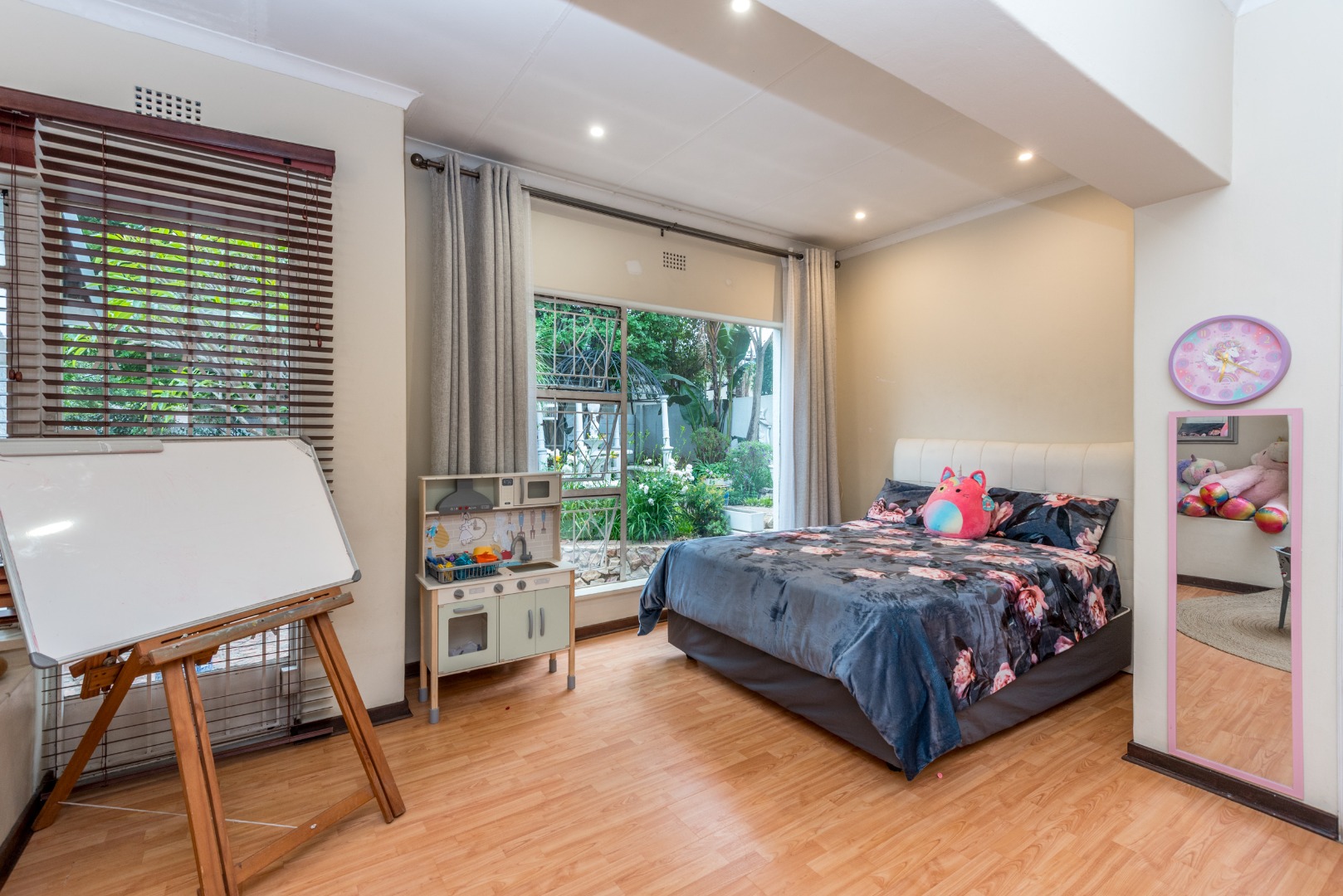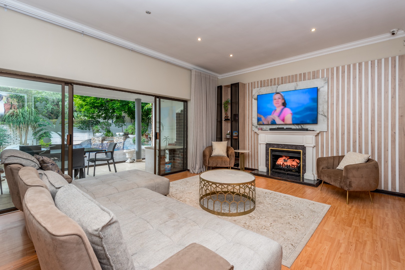 A dedicated 12 to 14 seater dining room that opens out onto the two covered patios as abovementioned, a romantic fire place and a Built in Bar area that also opens out onto a uncovered patio that overlooks the Sandton skyscrapers. Ideal for a family that enjoys and loves entertaining through-out the year with friends and guests.