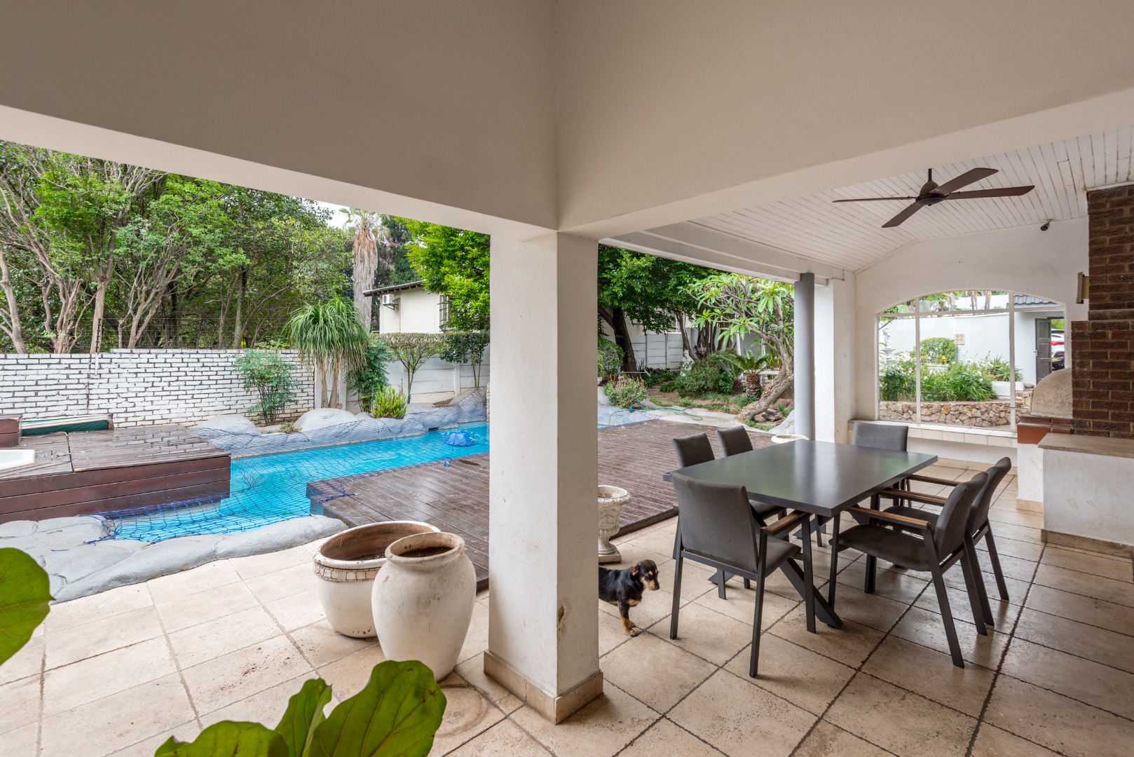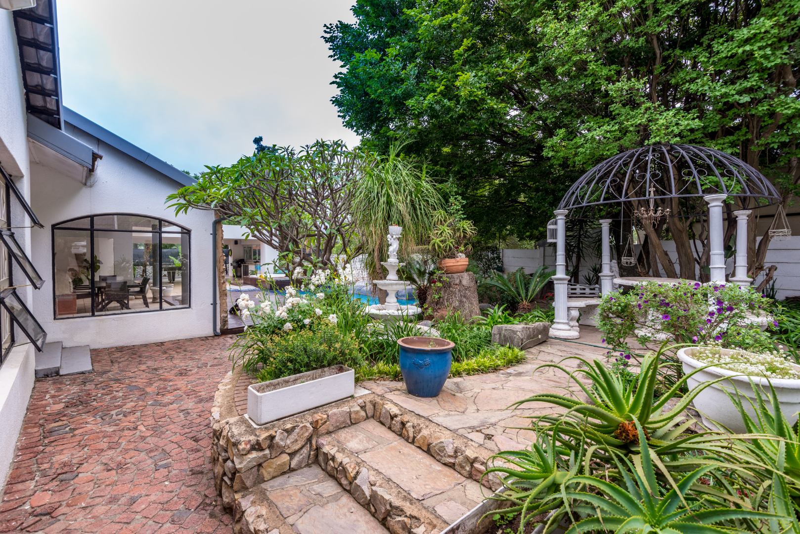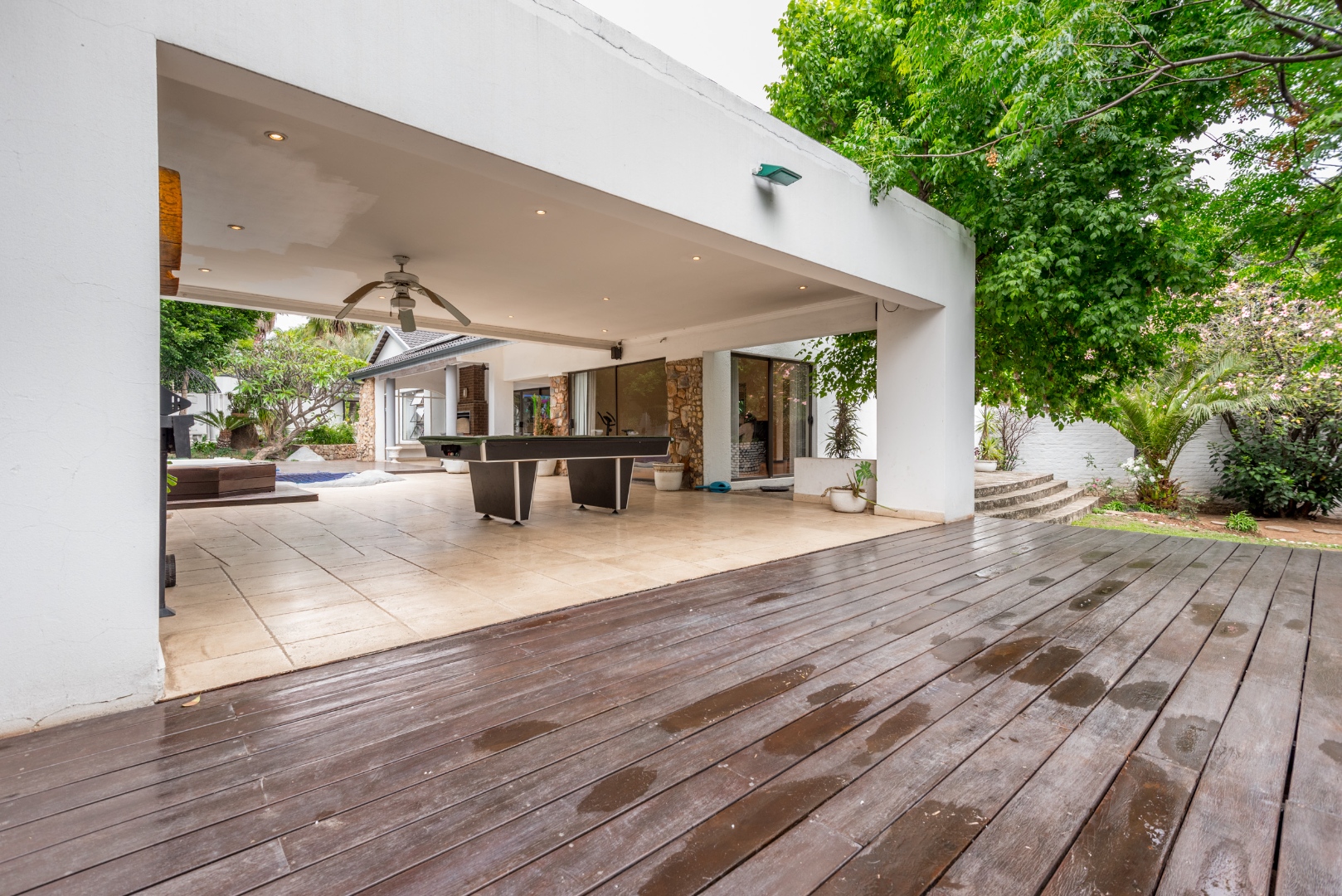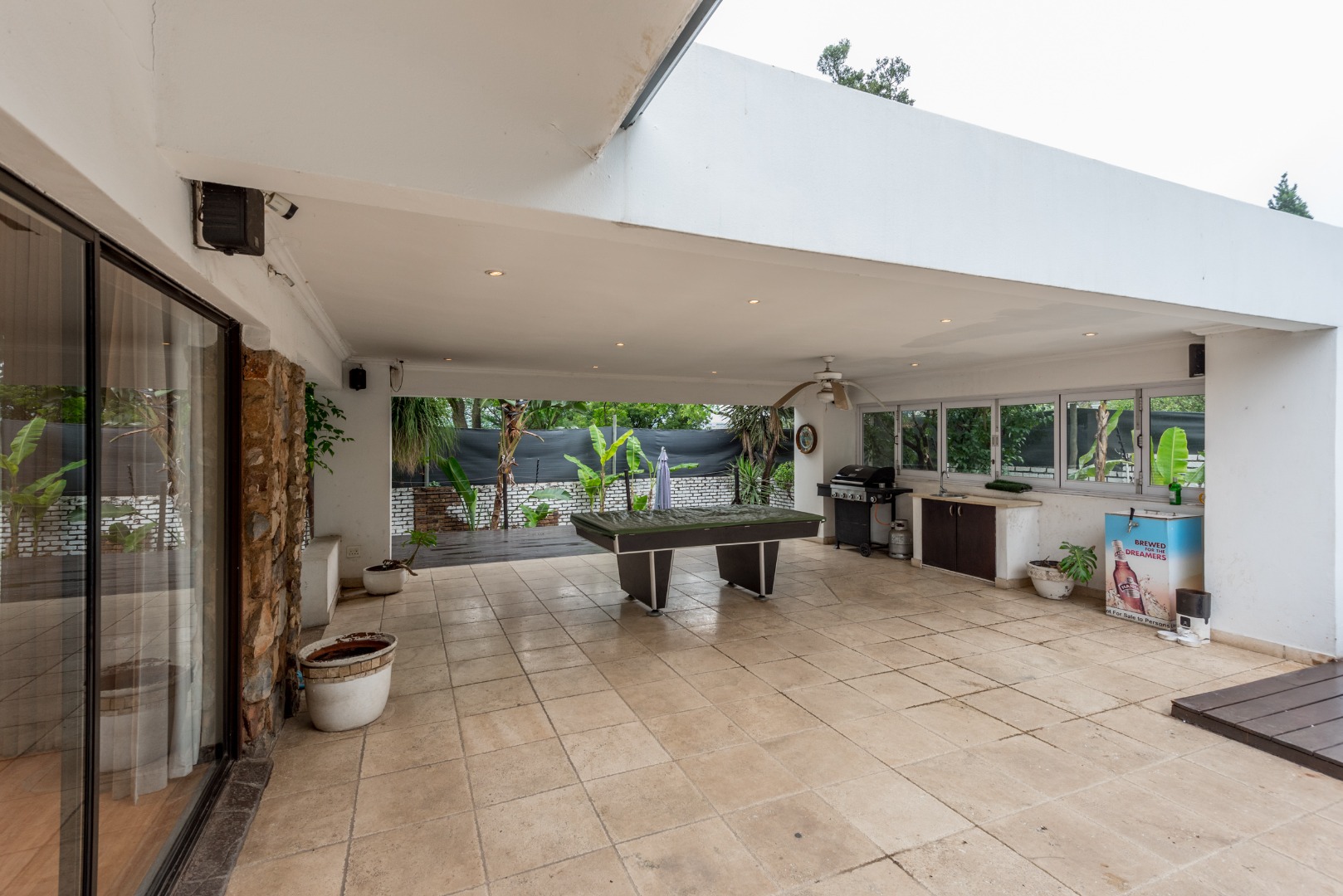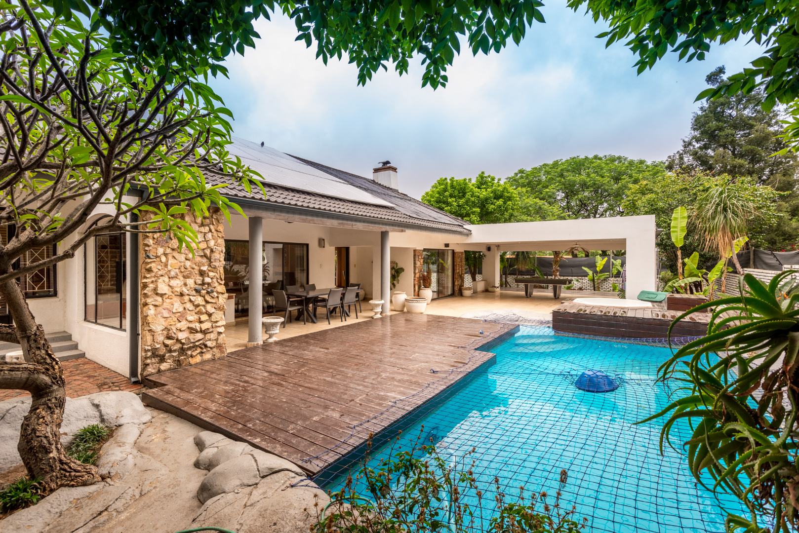 The outdoor oasis is an entertainer's dream, featuring two sprawling covered patio, a sun-drenched deck, and a sparkling swimming pool complemented by a luxurious jacuzzi, a braai area a built in pizza oven overlooks a well kept garden, sustained by an irrigation system.. Practical amenities include staff quarters with outside toilets, ample storage, and a pet-friendly environment.