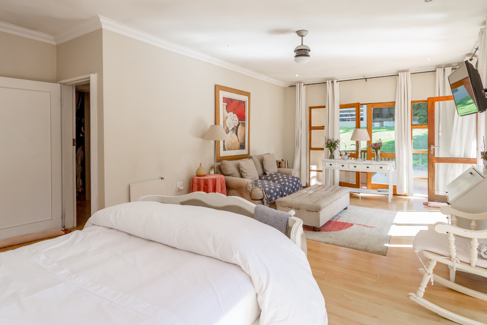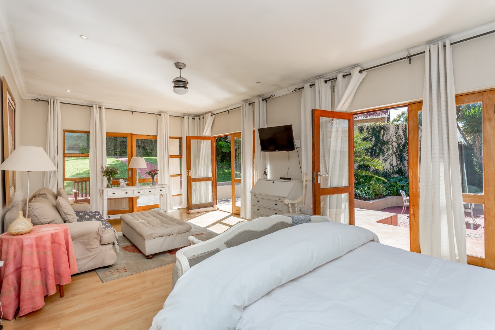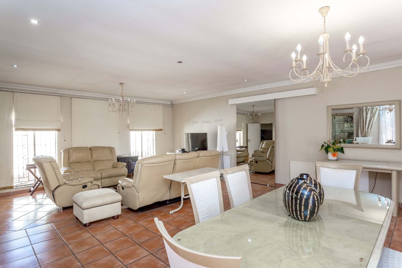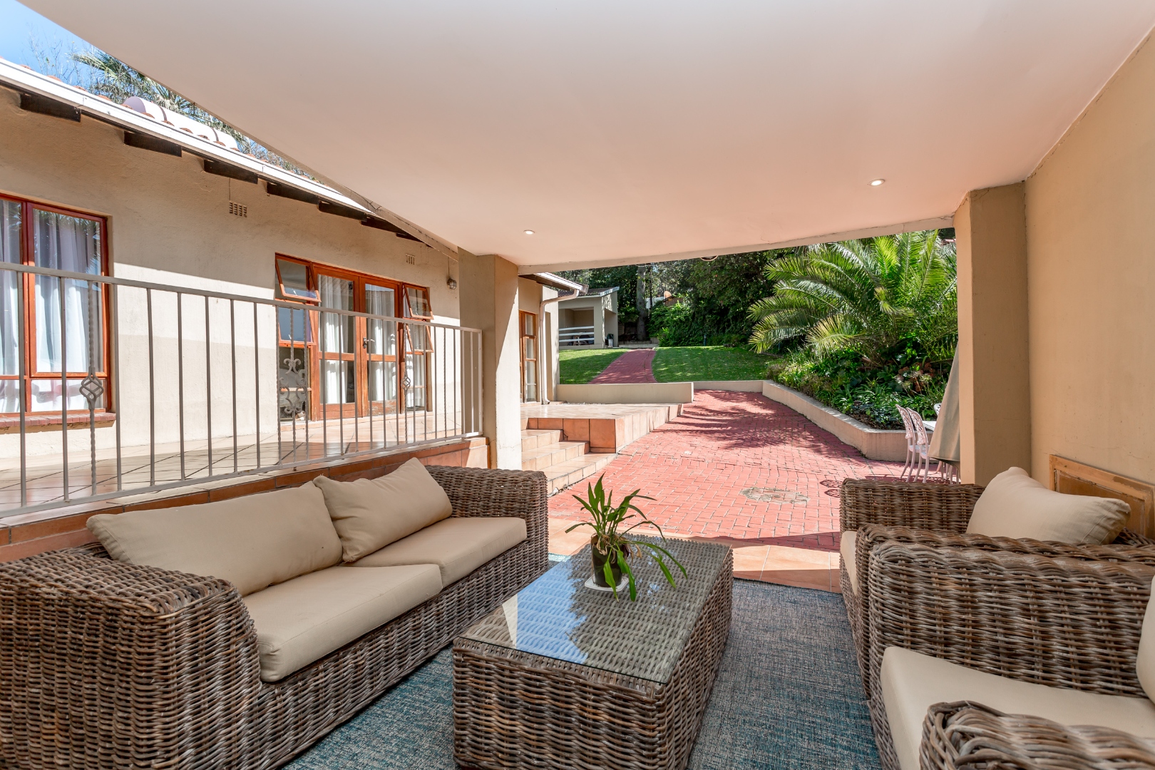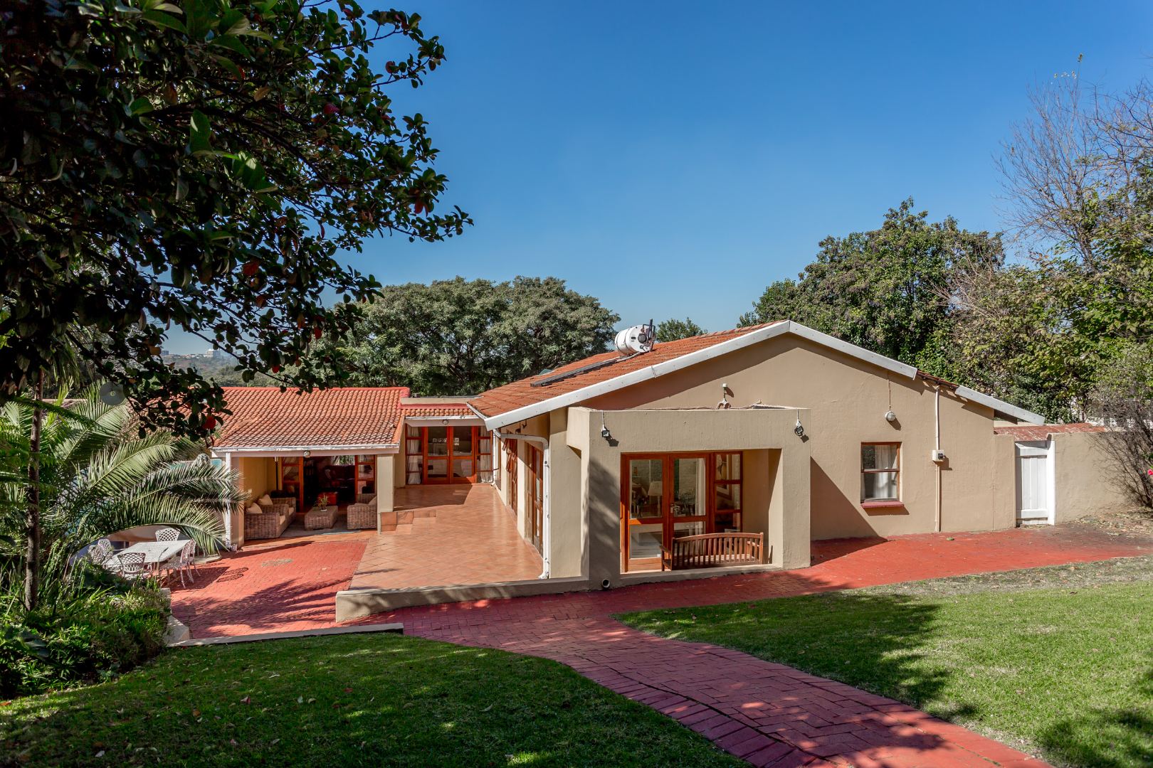 This solidly built home features 4 generously sized bedrooms 2 en-suite and 2 share a full bathroom, The Master bedroom is massive that has surrounding wooden doors that open out onto a well manicured garden and swimming pool. Its is light and airy and allows the natural sun shine throughout, and multiple living areas formal and informal lounges ideal for family living.