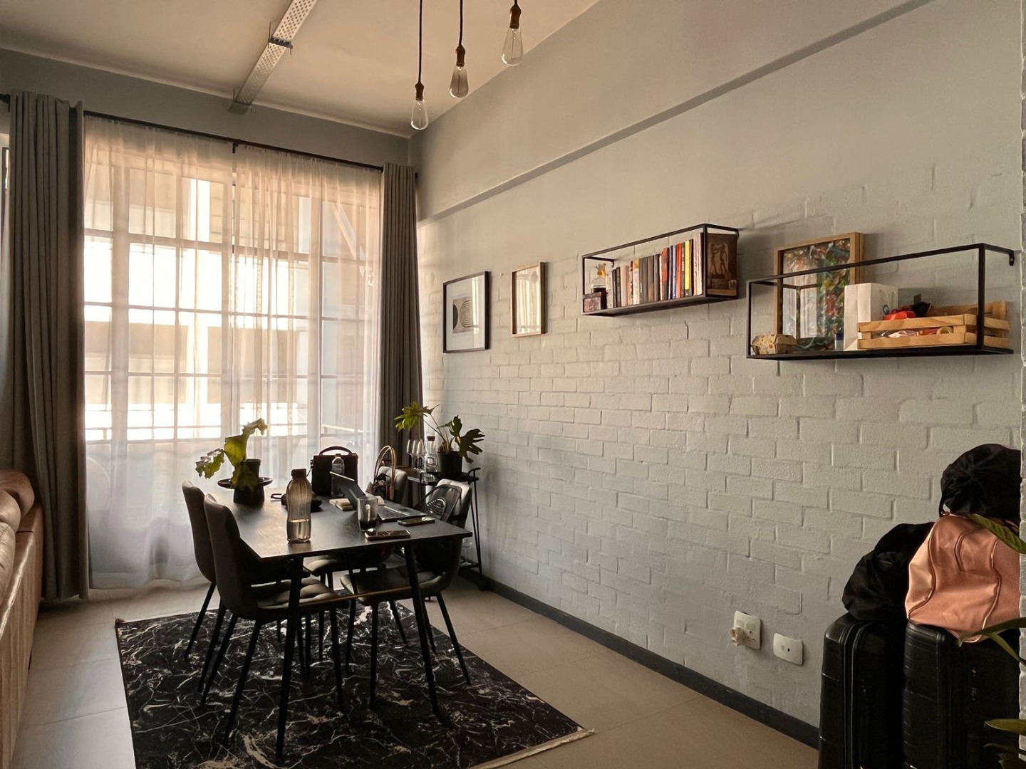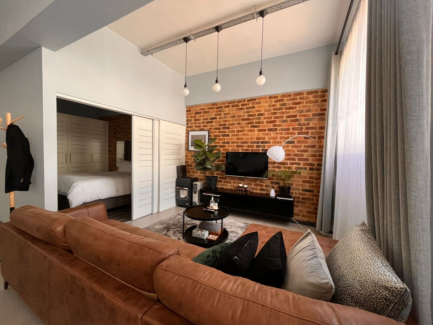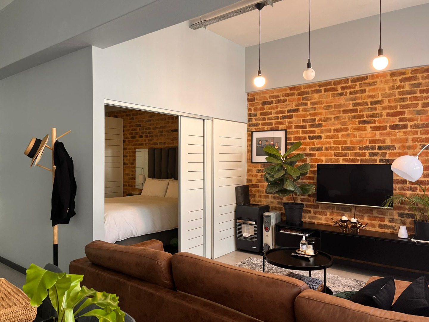* Industrial-chic design with exposed brick accents