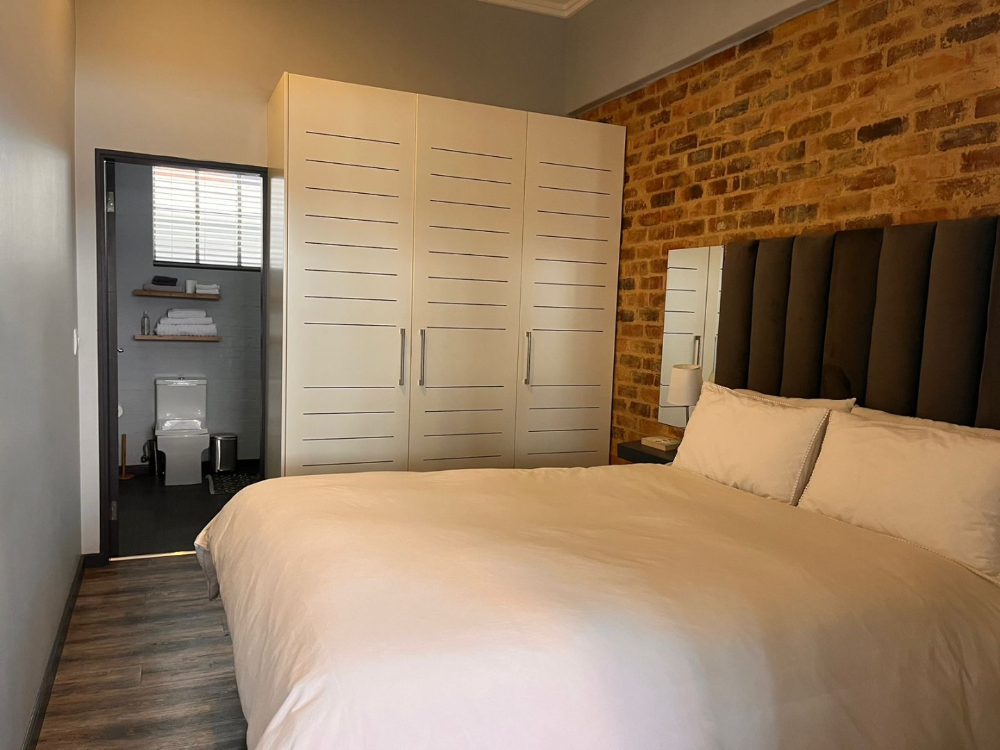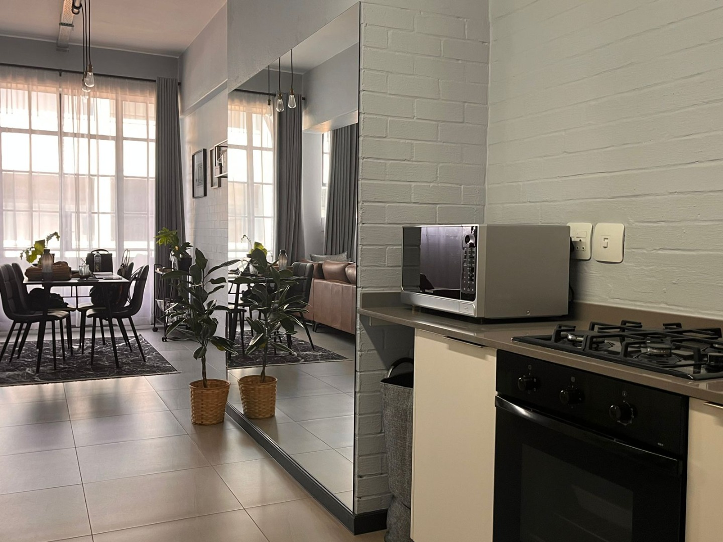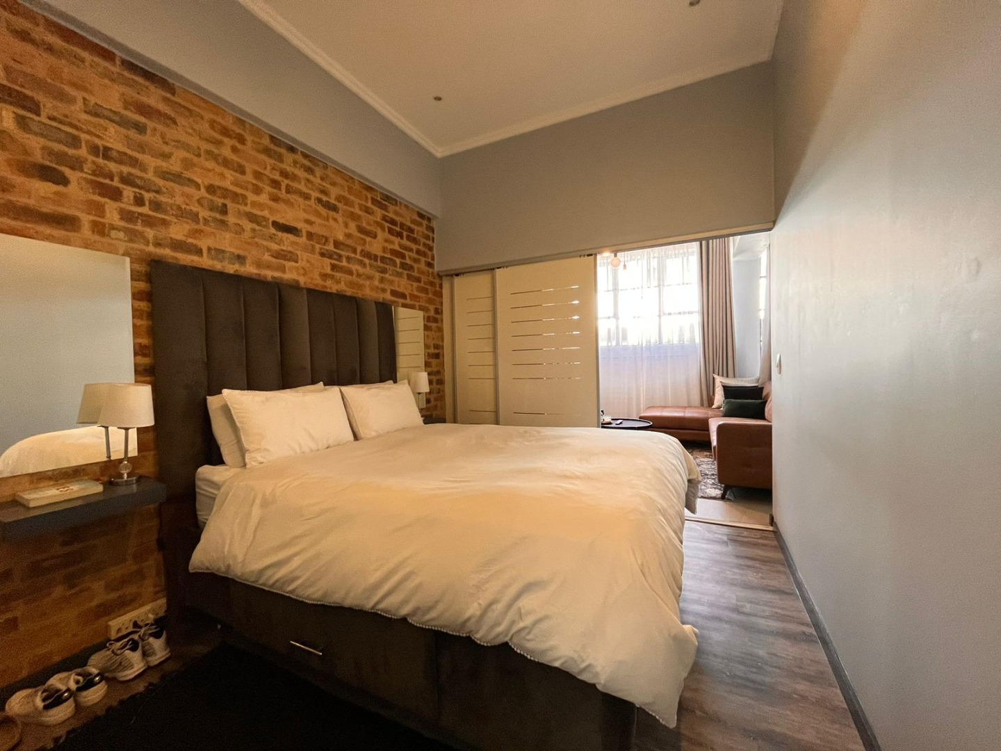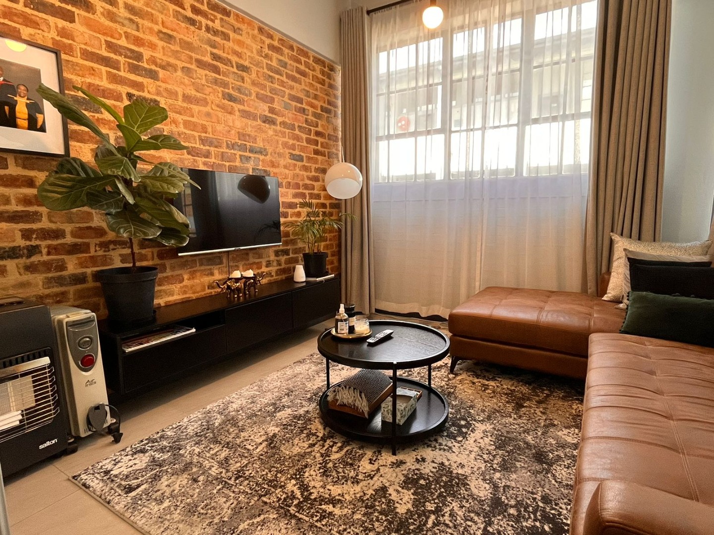 * Industrial-chic design with exposed brick accents
