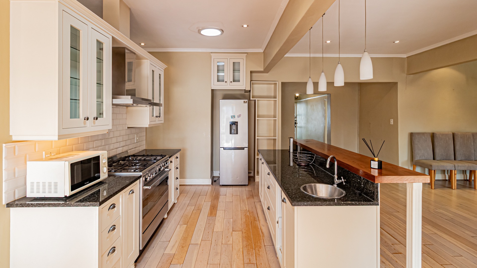 The heart of the home is an open-plan lounge, kitchen, and dining area—bathed in natural light and styled with sleek black granite countertops, white cabinetry, and warm wood flooring. It’s a space that invites connection, whether you're hosting friends or enjoying a quiet evening in.