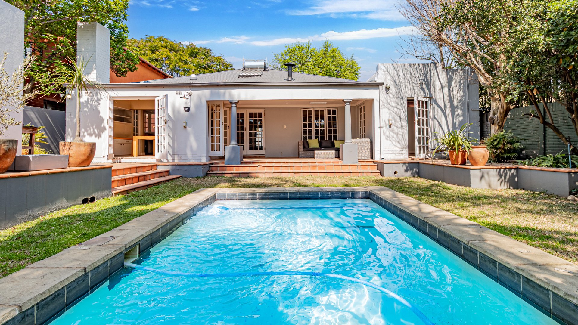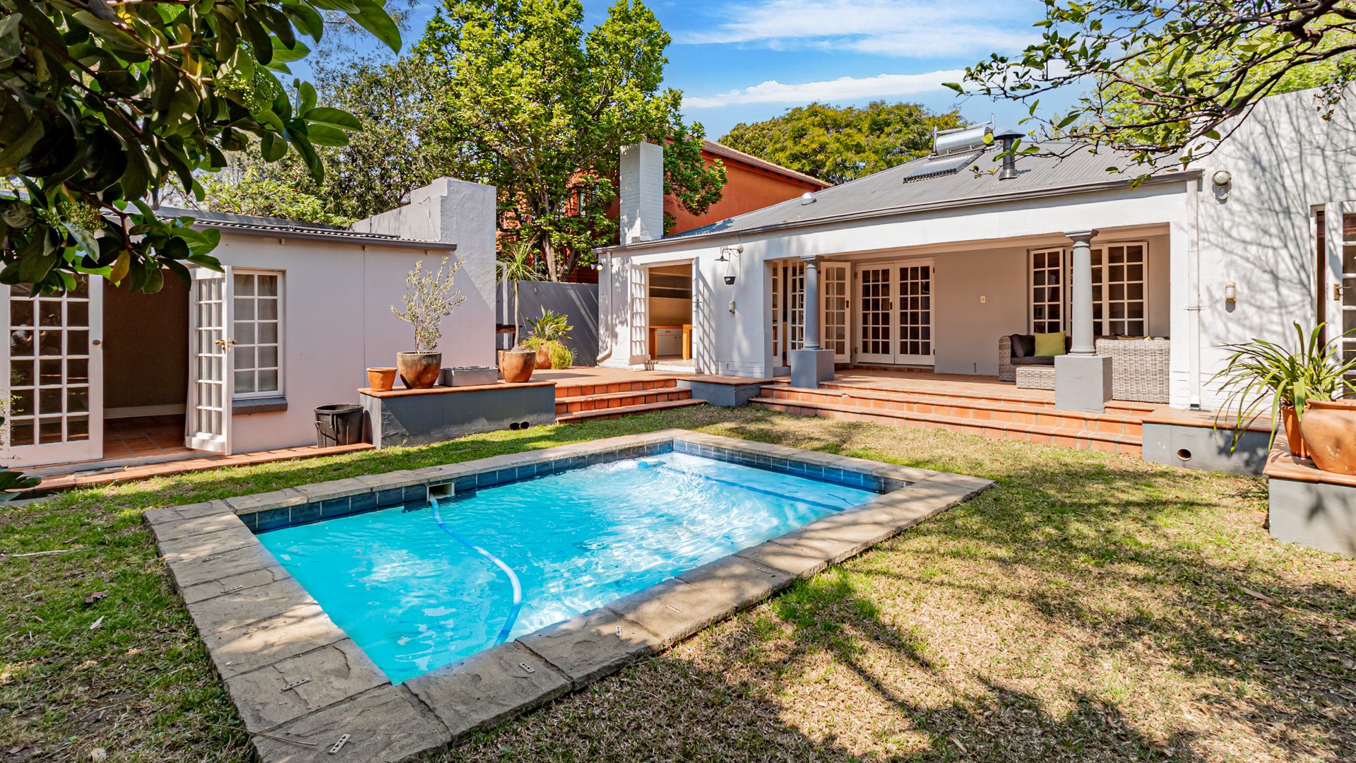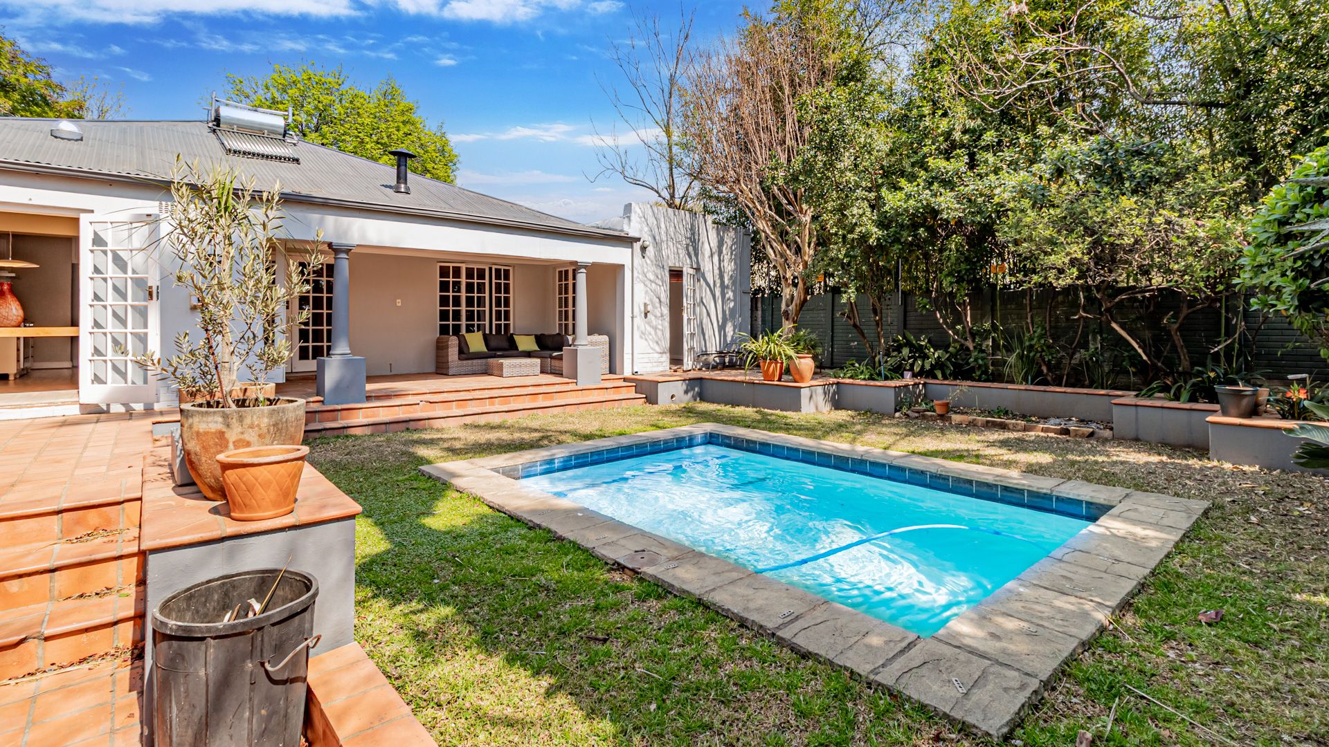 The garden is designed for both relaxation and entertainment. A sparkling pool is framed by stone tiles and lush greenery, while the terracotta patio and French doors create a seamless indoor-outdoor experience. A separate cottage could serve as a domestic room, guest room, pool house, or studio space.