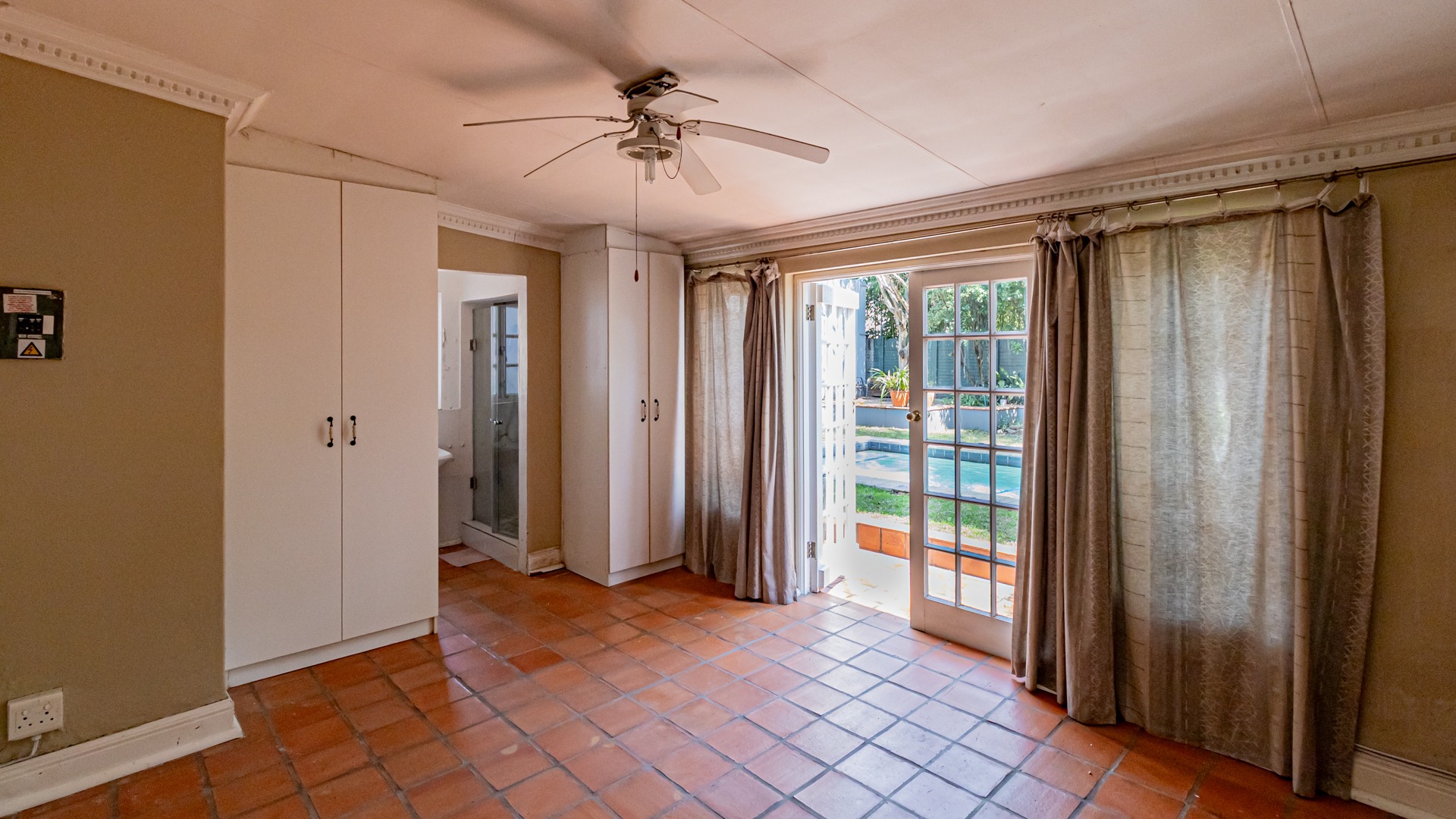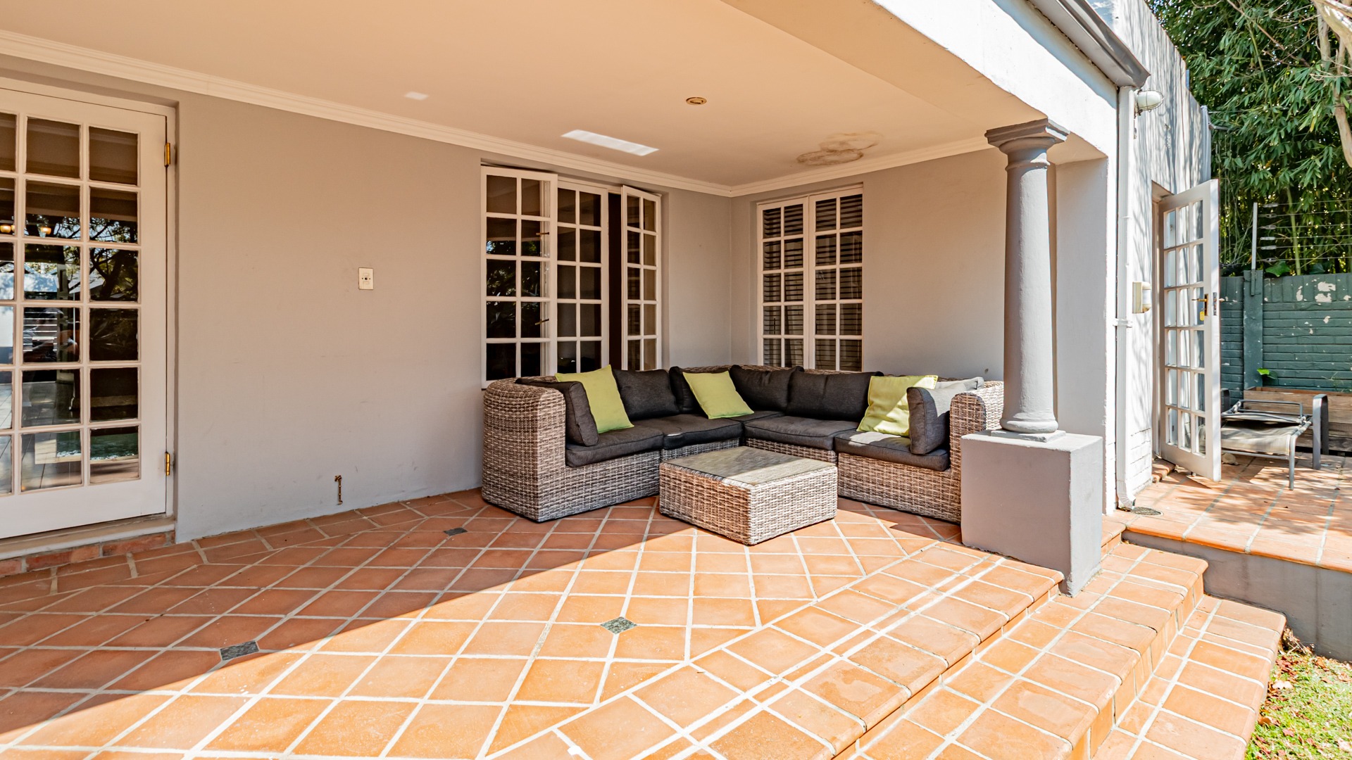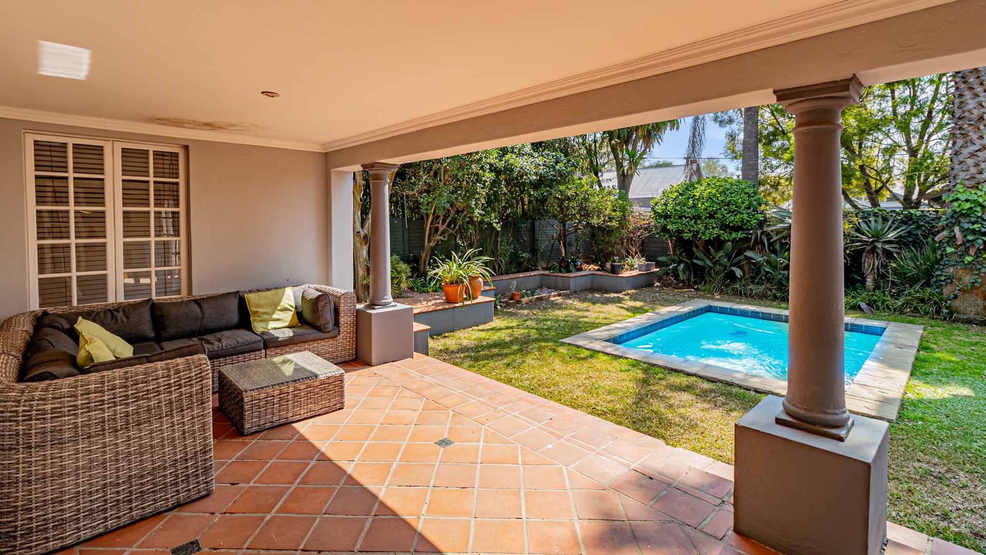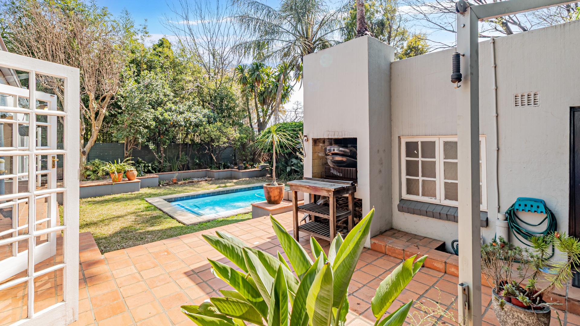 The garden is designed for both relaxation and entertainment. A sparkling pool is framed by stone tiles and lush greenery, while the terracotta patio and French doors create a seamless indoor-outdoor experience. A separate cottage could serve as a domestic room, guest room, pool house, or studio space.