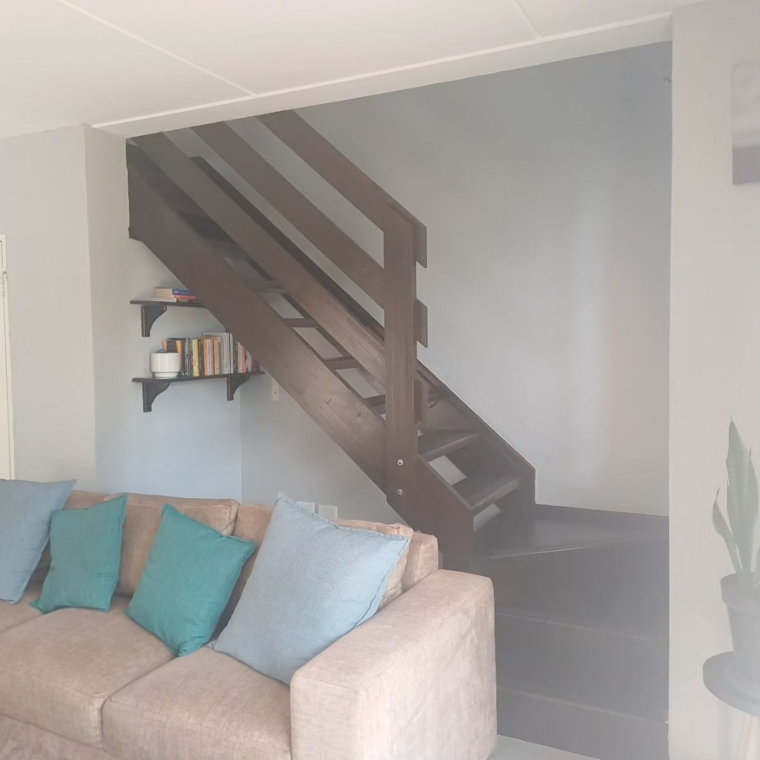 This inviting 2-bedroom, 1-bathroom townhouse offers a functional 71 sqm of living space, ideal for modern lifestyles. The open-plan layout seamlessly connects the lounge to a compact, well-appointed kitchen featuring modern white cabinetry, grey speckled countertops, an integrated stove and oven, and a double sink. Natural light floods the living area through large sliding glass doors, which also provide access to a private outdoor garden space. Practical storage under the staircase.