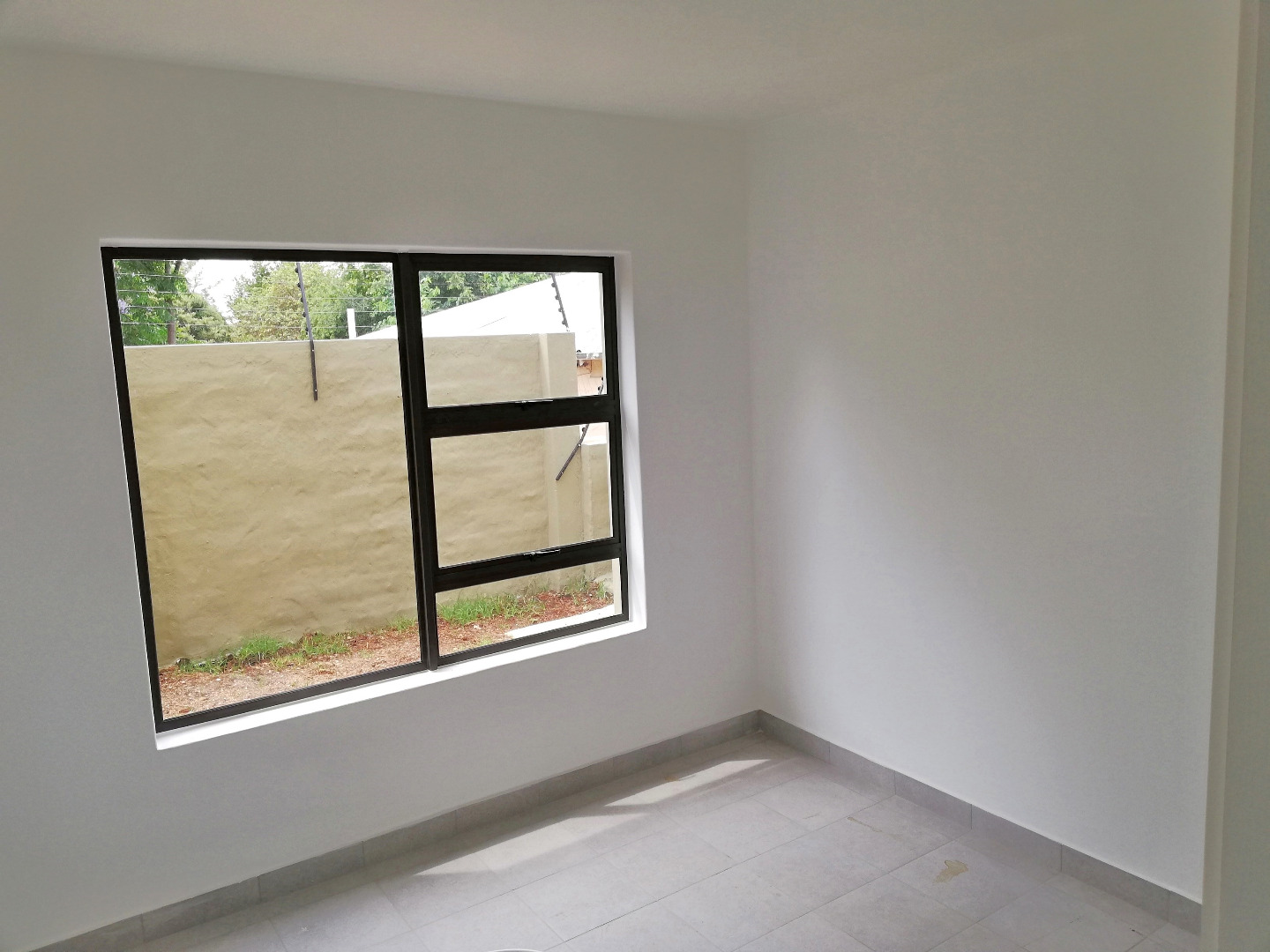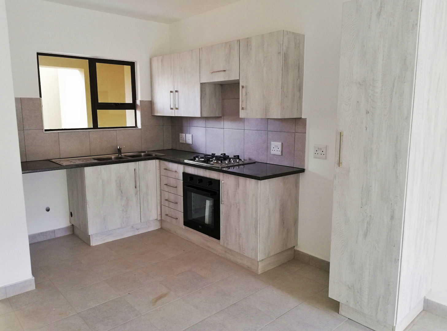 Contemporary open-plan living area opens out to a covered patio and private garden. Modern kitchen is equipped with sufficient cupboard space, granite tops, double sink, gas hob / electric oven and space for 1 water appliance and single door fridge. Tiled throughout with large windows that allow for abundant natural light. Passage to 2 bedrooms. Main with shower en-suite. 2nd bathroom with bath. Fibre-ready and unfortunately not pet friendly.