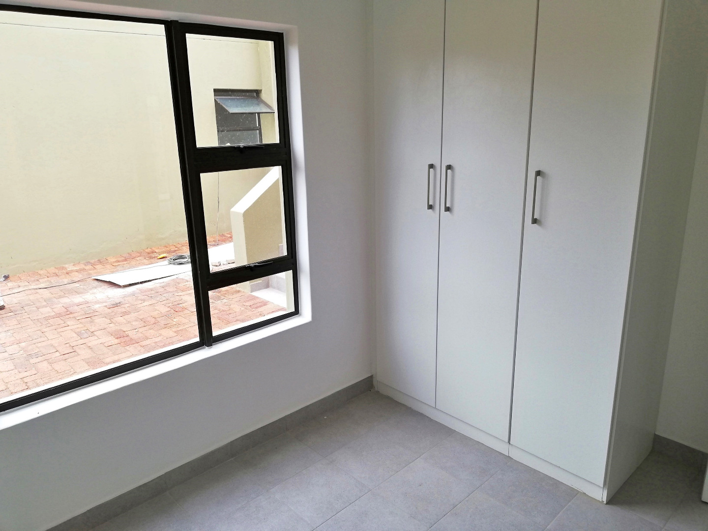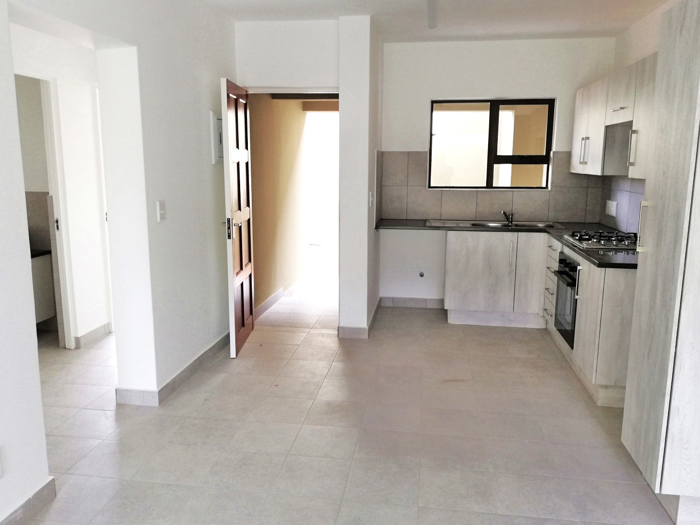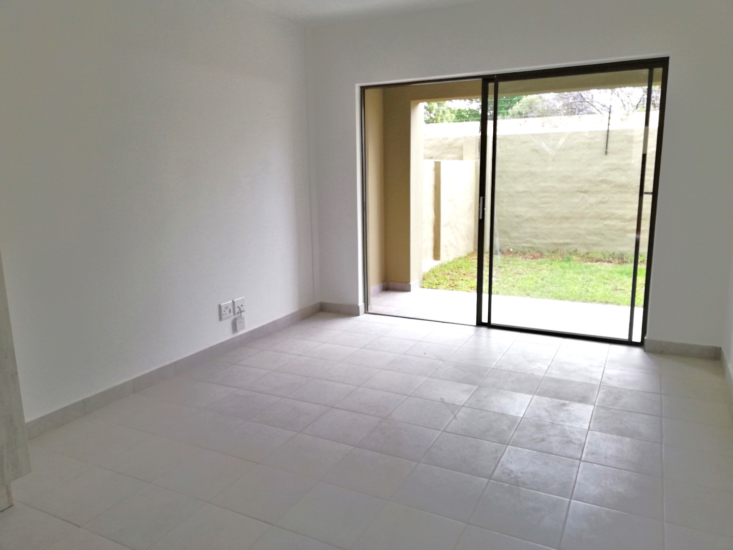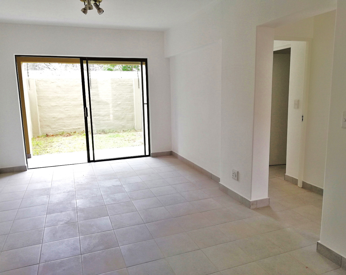 Contemporary open-plan living area opens out to a covered patio and private garden. Modern kitchen is equipped with sufficient cupboard space, granite tops, double sink, gas hob / electric oven and space for 1 water appliance and single door fridge. Tiled throughout with large windows that allow for abundant natural light. Passage to 2 bedrooms. Main with shower en-suite. 2nd bathroom with bath. Fibre-ready and unfortunately not pet friendly.