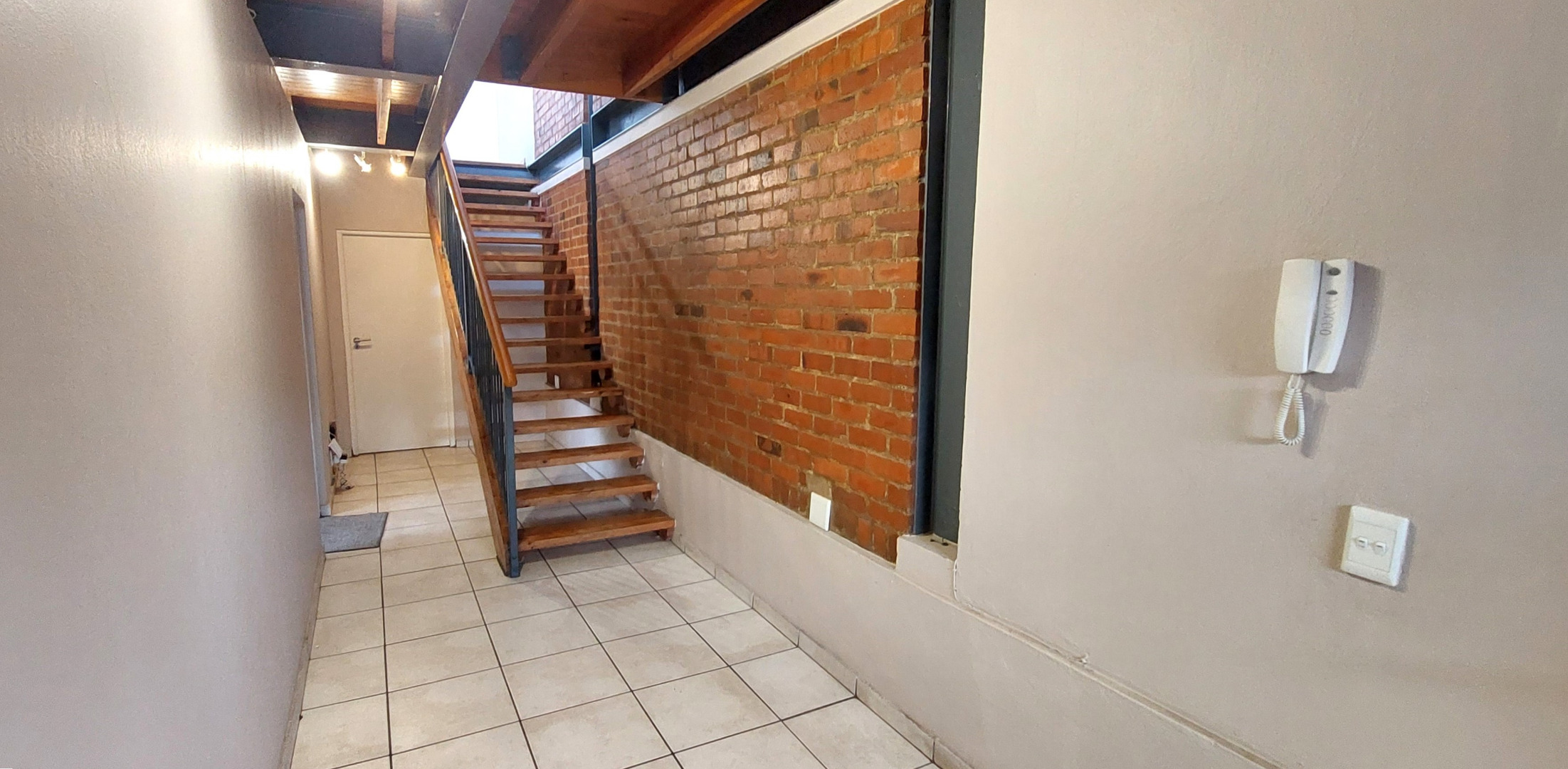 The unit features an open-plan layout and high ceilings and abundance of natural sunlight. Modern finishes include an eye-catching brick feature wall, durable floor tiles and wood-look laminate flooring throughout.
