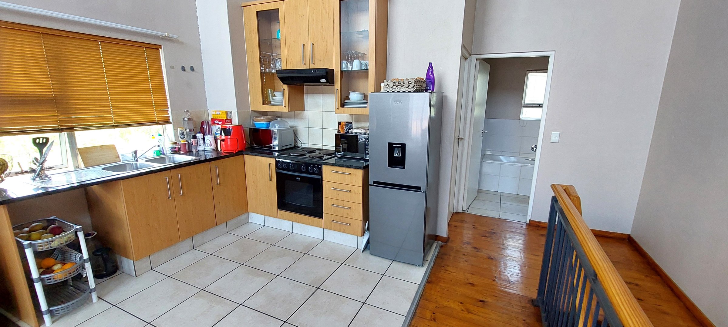 Downstairs entrance hall is spacious leading to the main bedroom with balcony and full en-suite bathroom plus 2nd bedroom and en-suite shower bathroom. Upstairs living area opens out to a large balcony with a lovely tree top view and includes a well-appointed kitchen with ample cupboard space and space for 1 water appliance and single door fridge. 3rd bedroom and separate bathroom with bath are also upstairs.