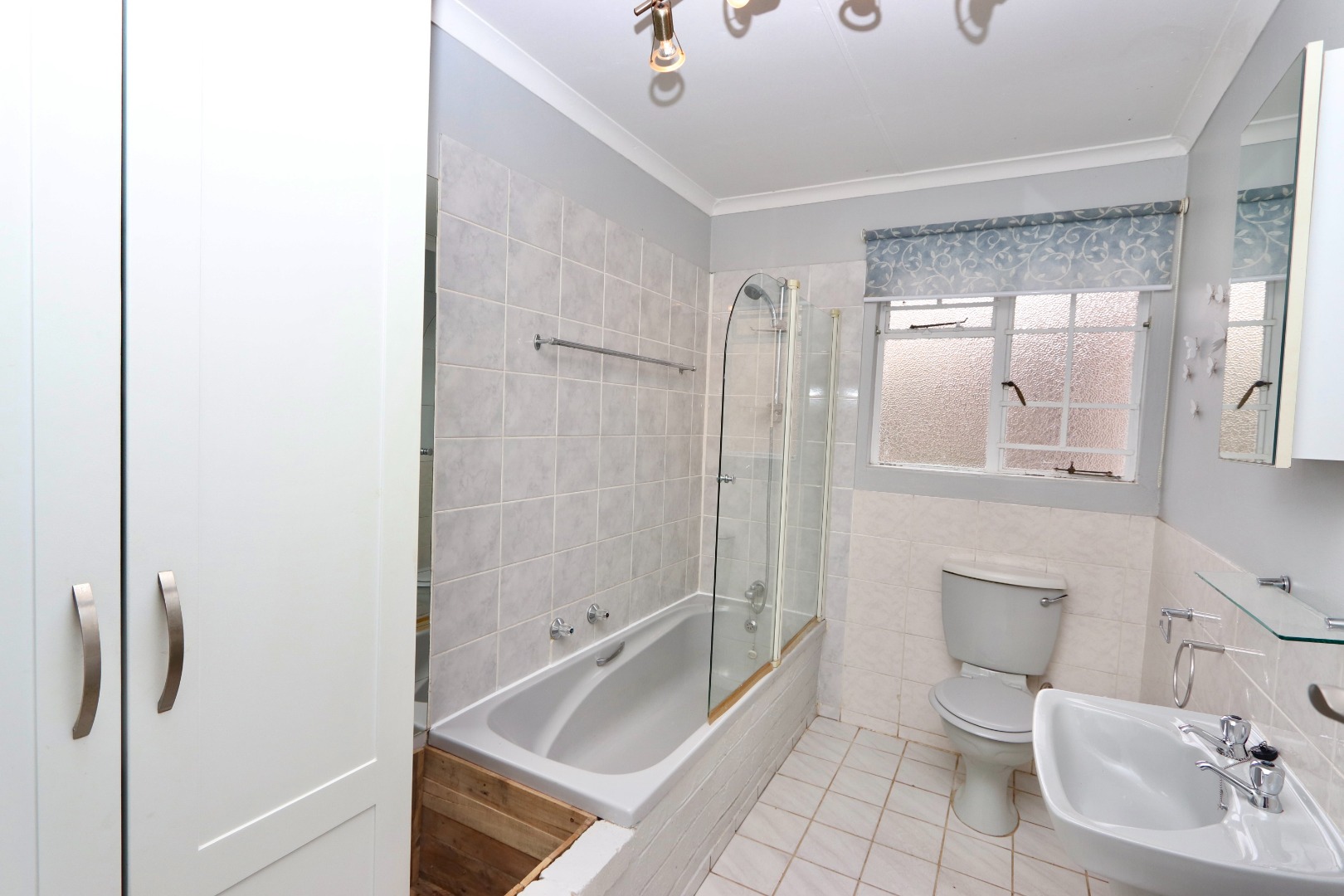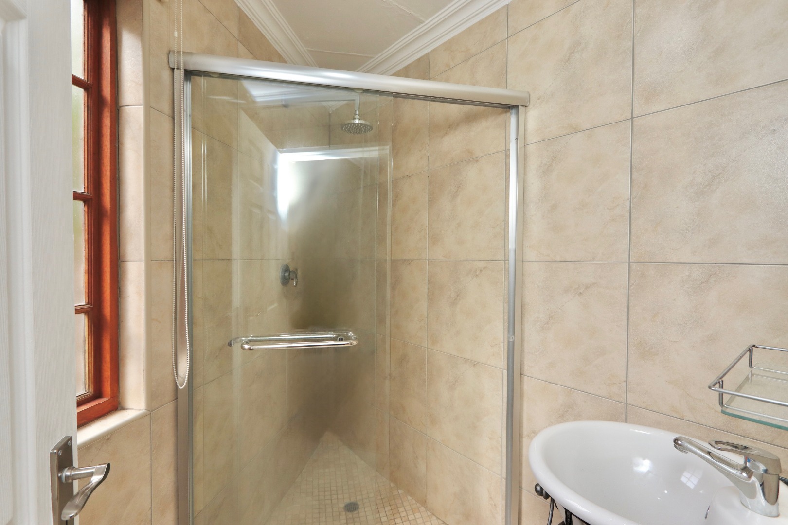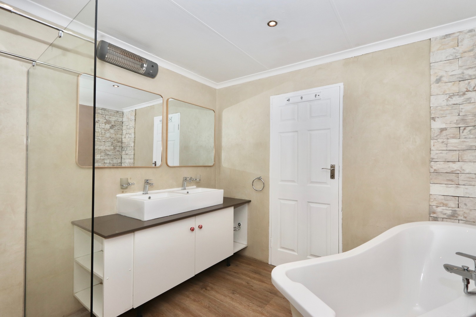 The main bedroom is a private retreat, complete with a full en-suite bathroom featuring a double vanity and a freestanding bathtub. A walk-in closet provides generous space for both his and hers storage. The second bedroom is exceptionally spacious, offering versatility to create a dual-purpose layout. It includes its own en-suite bathroom with a shower and direct access to the garden, enhancing privacy and convenience. The third bedroom is well-sized and fitted with blinds, serviced by a separate bathroom equipped with a bath, handheld shower, and additional storage.