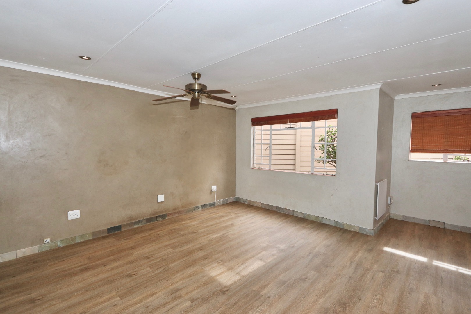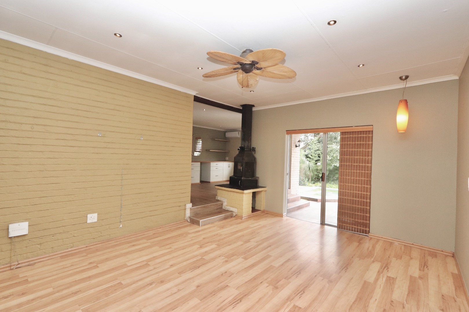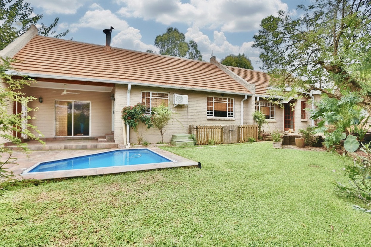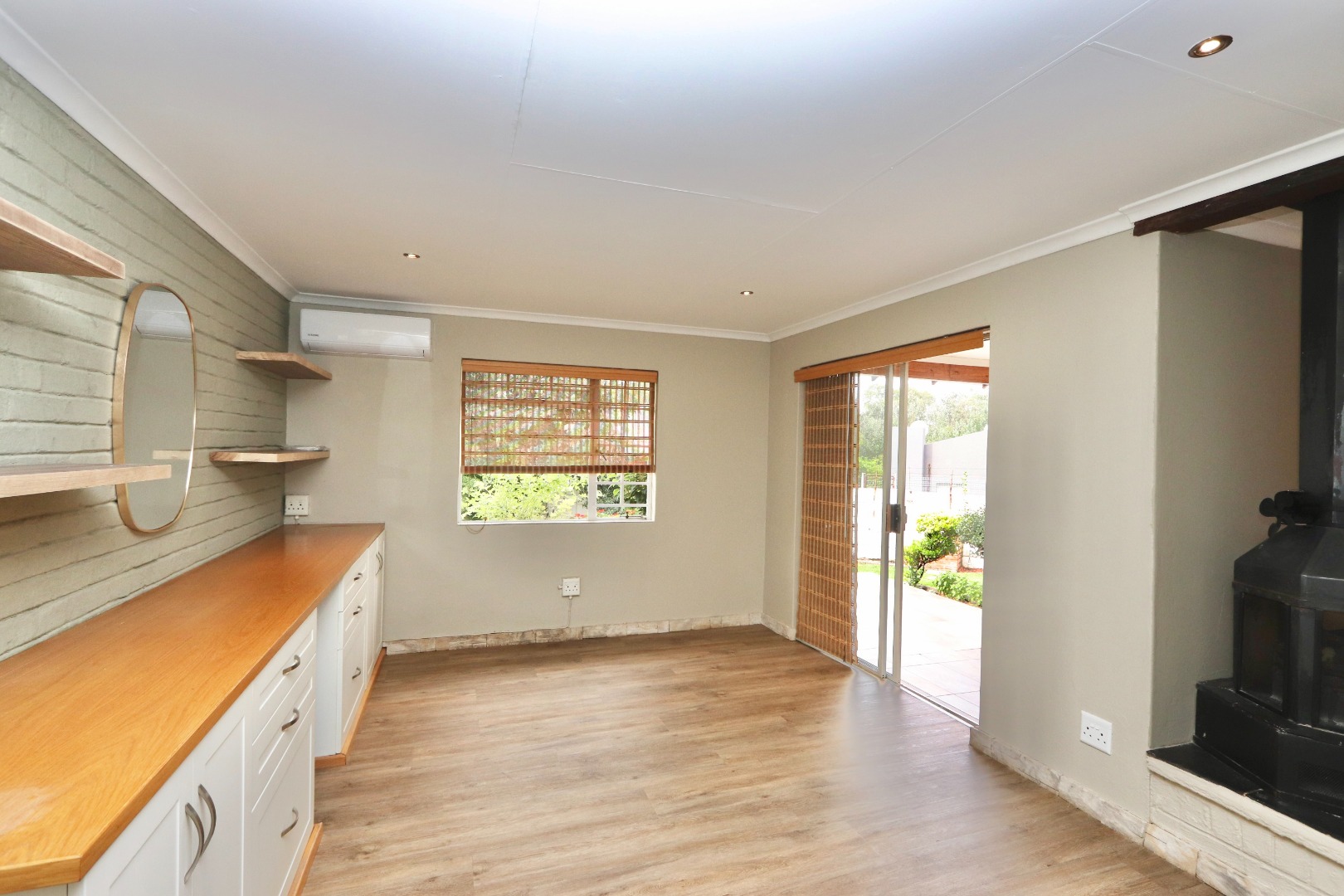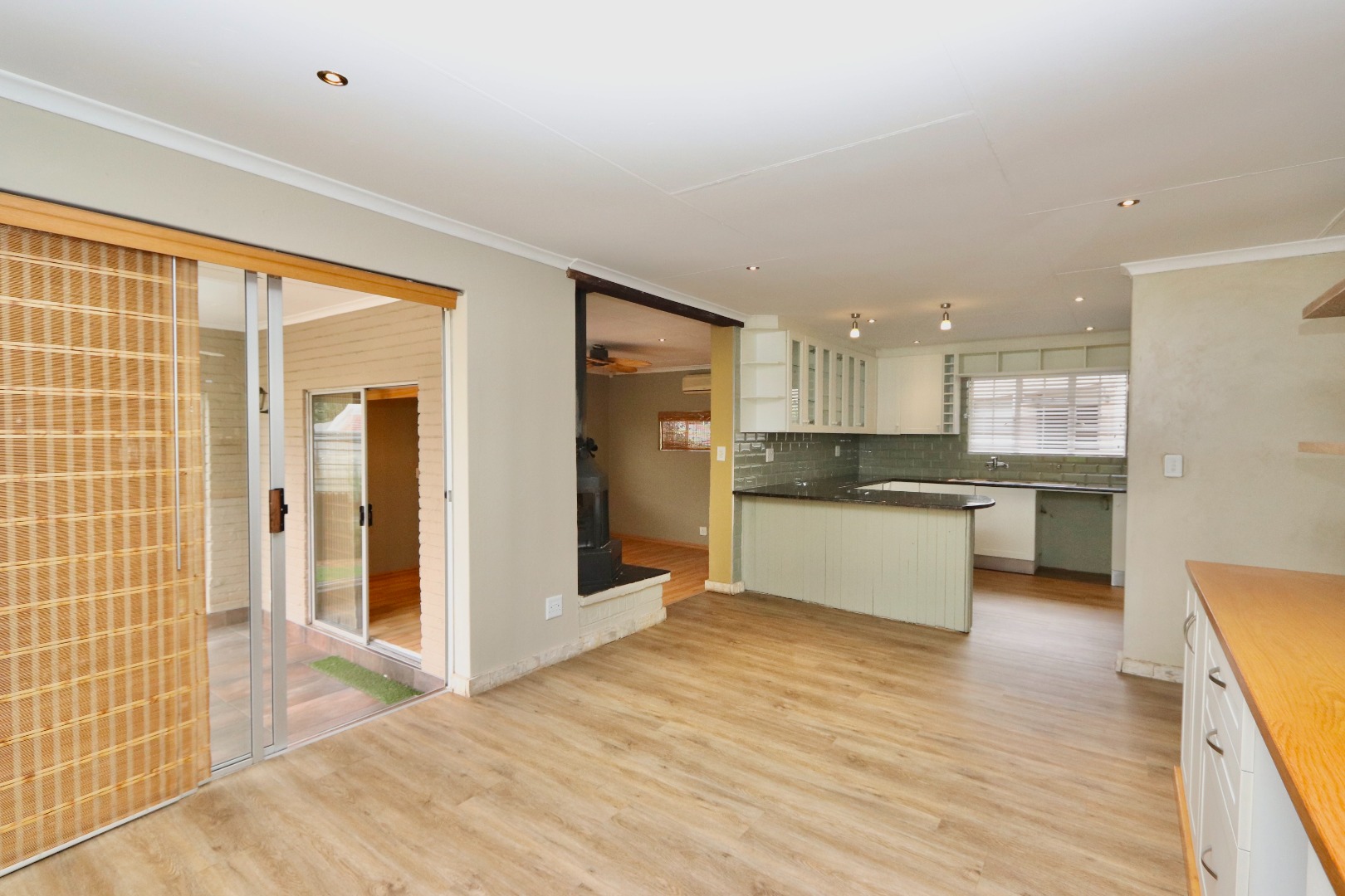 The well-appointed kitchen is both stylish and functional, featuring ample cupboard space, chic granite countertops, a gas stove and oven, space for an under-counter appliance, and room for a double-door fridge—ideal for modern family living. The dining area is enhanced with built-in cupboards, air conditioning, and fitted blinds, creating a comfortable space for everyday meals and entertaining. A cosy wood-burning fireplace adds character and warmth, while seamless flow leads out to a covered patio—perfect for year-round entertaining. The spacious lounge also opens onto the patio and is fitted with a ceiling fan, offering a relaxed and airy living environment.