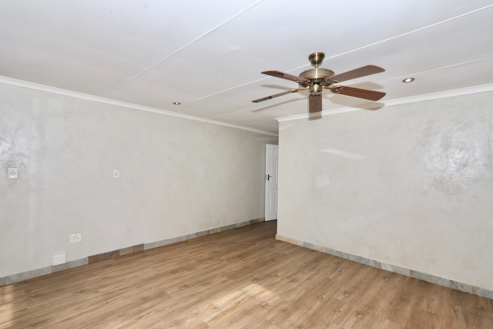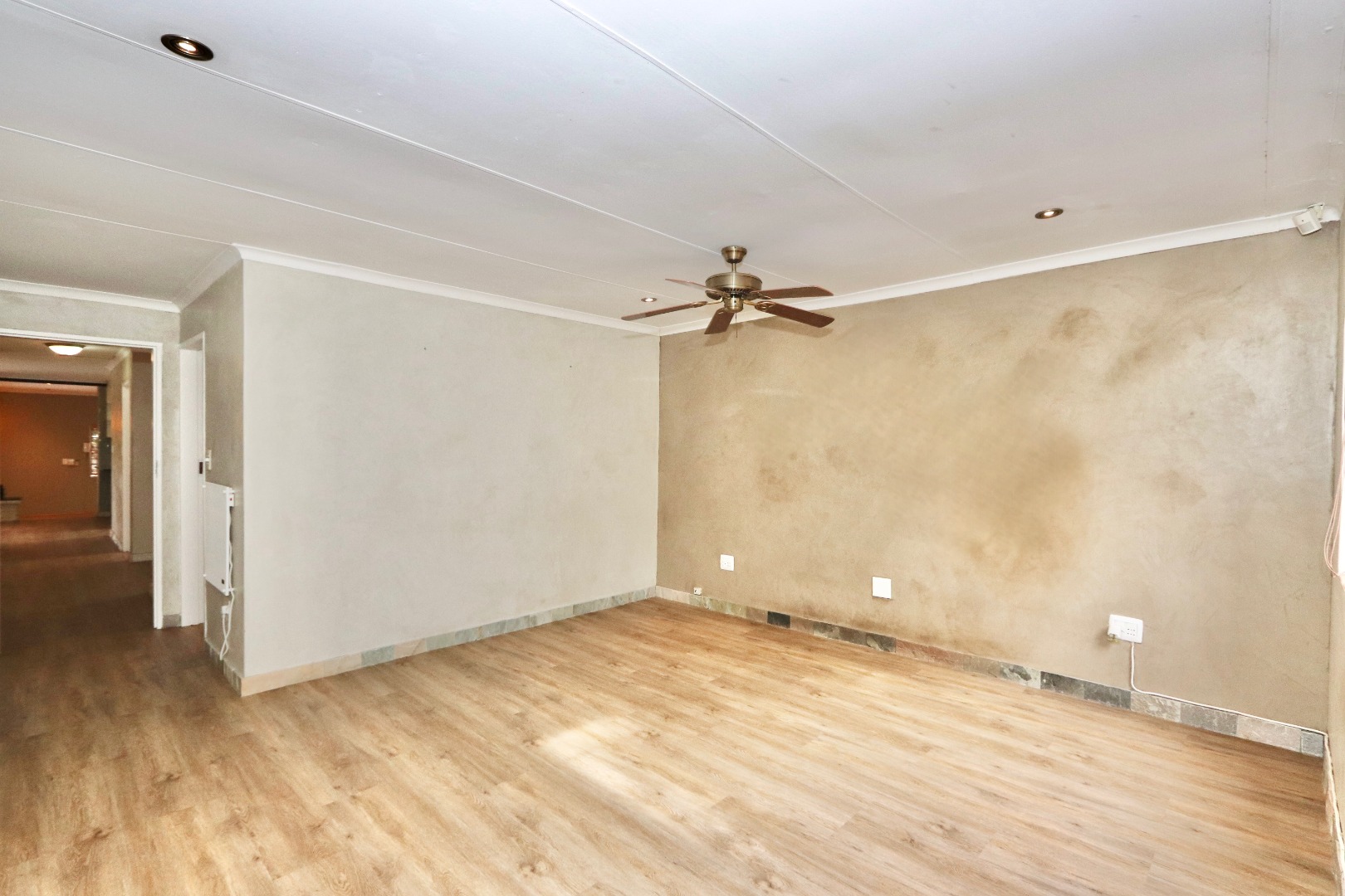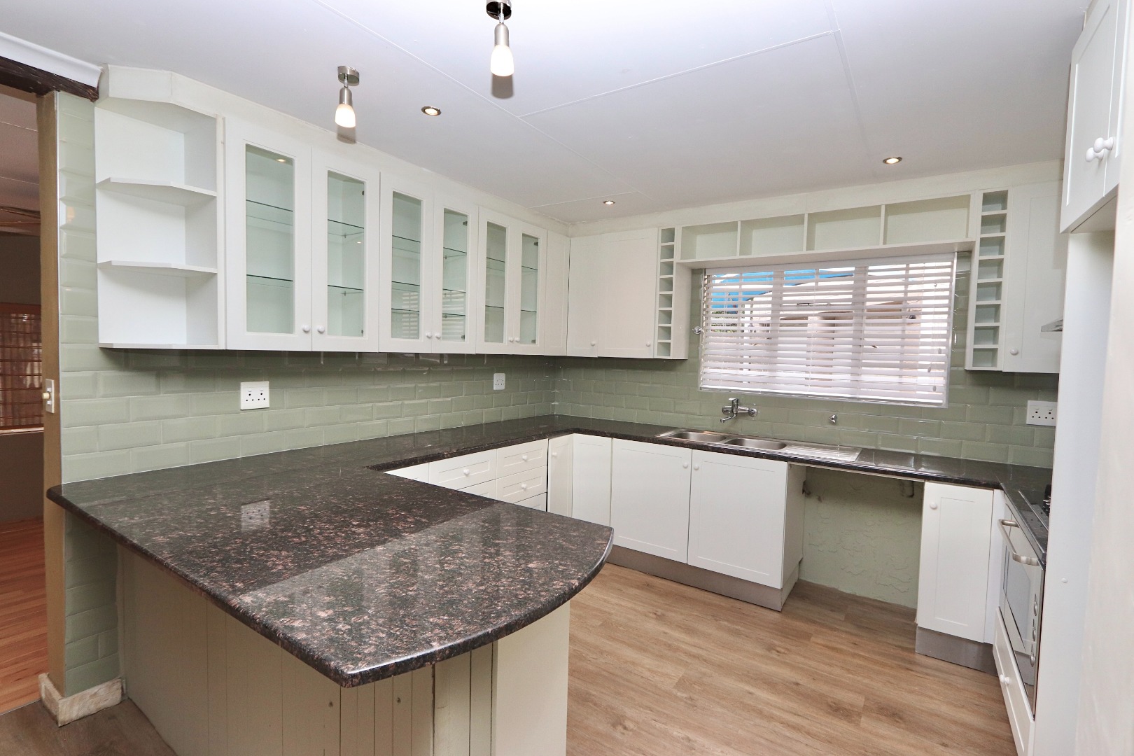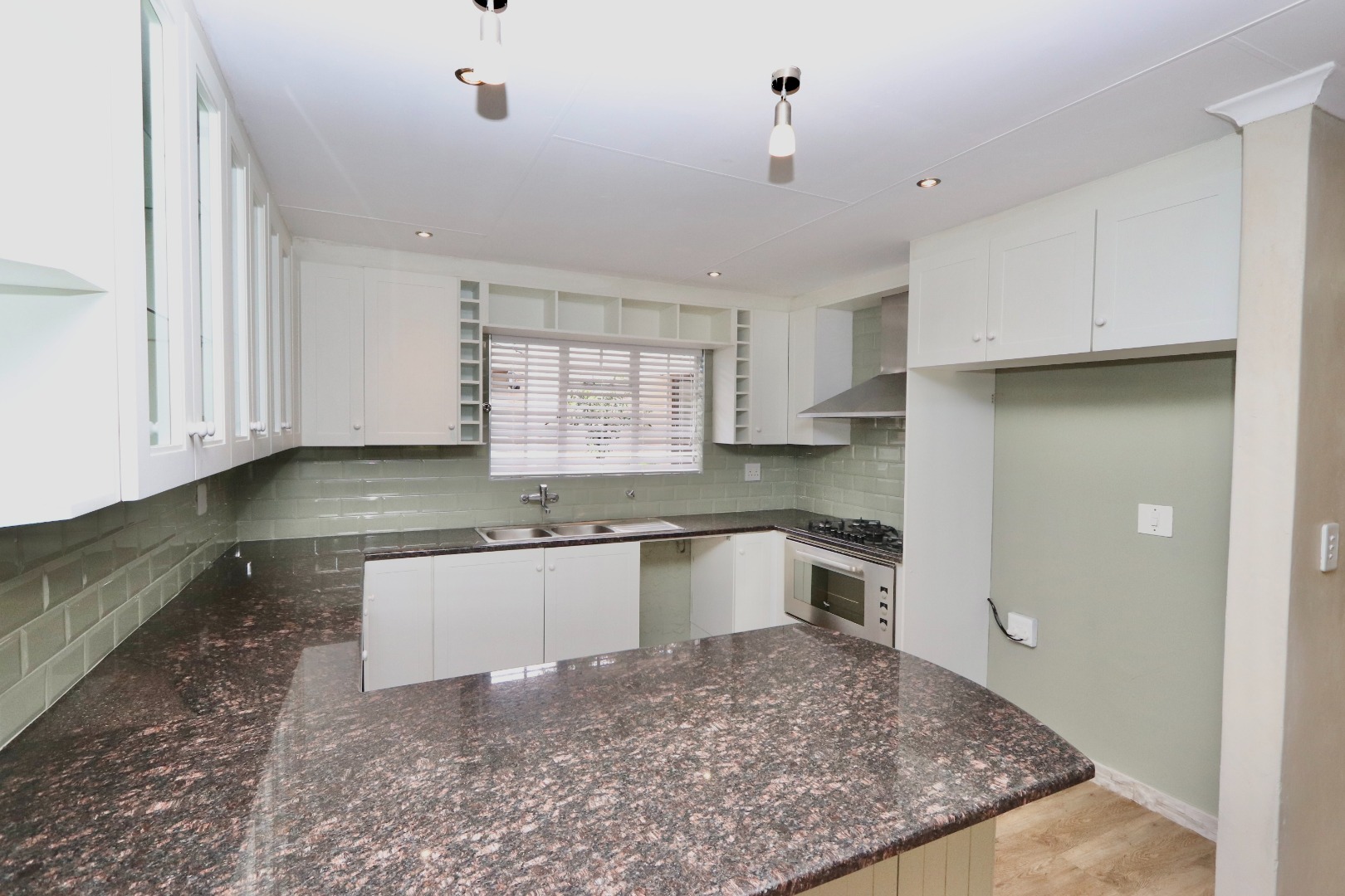 The well-appointed kitchen is both stylish and functional, featuring ample cupboard space, chic granite countertops, a gas stove and oven, space for an under-counter appliance, and room for a double-door fridge—ideal for modern family living. The dining area is enhanced with built-in cupboards, air conditioning, and fitted blinds, creating a comfortable space for everyday meals and entertaining. A cosy wood-burning fireplace adds character and warmth, while seamless flow leads out to a covered patio—perfect for year-round entertaining. The spacious lounge also opens onto the patio and is fitted with a ceiling fan, offering a relaxed and airy living environment.