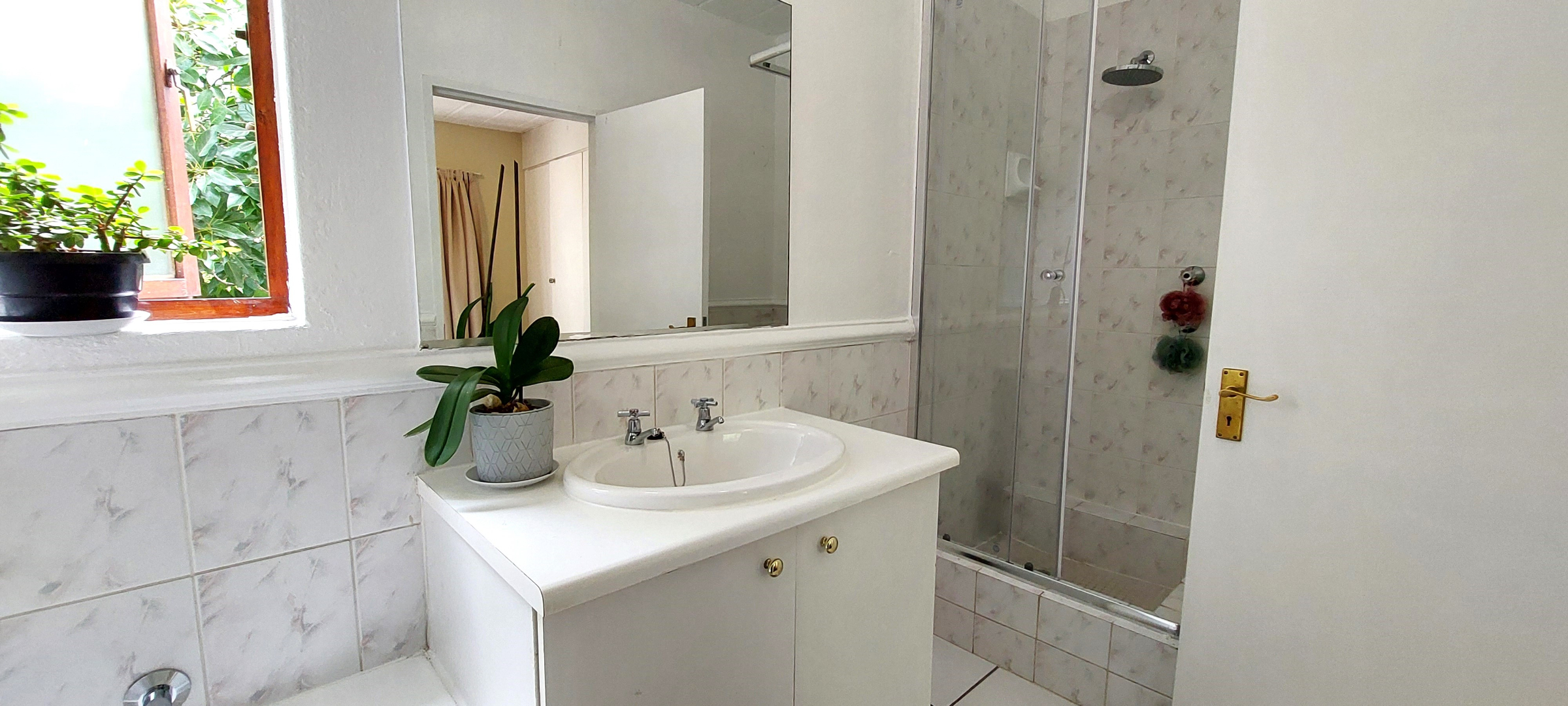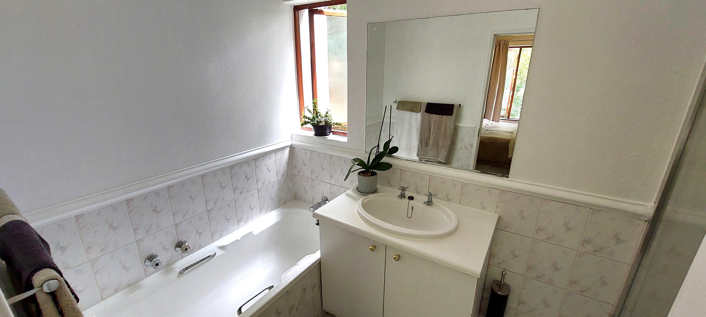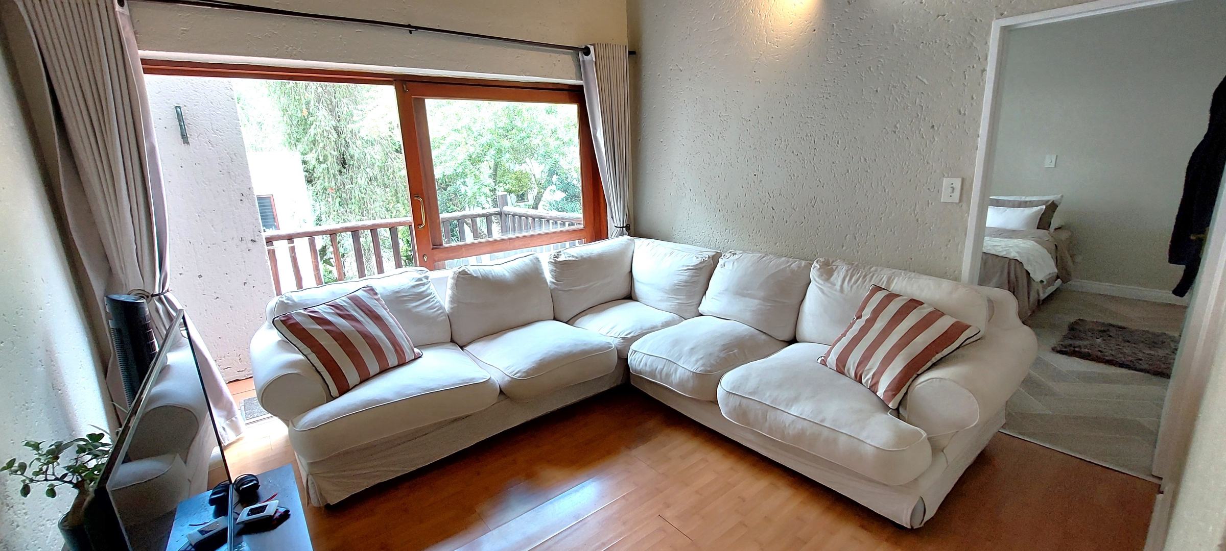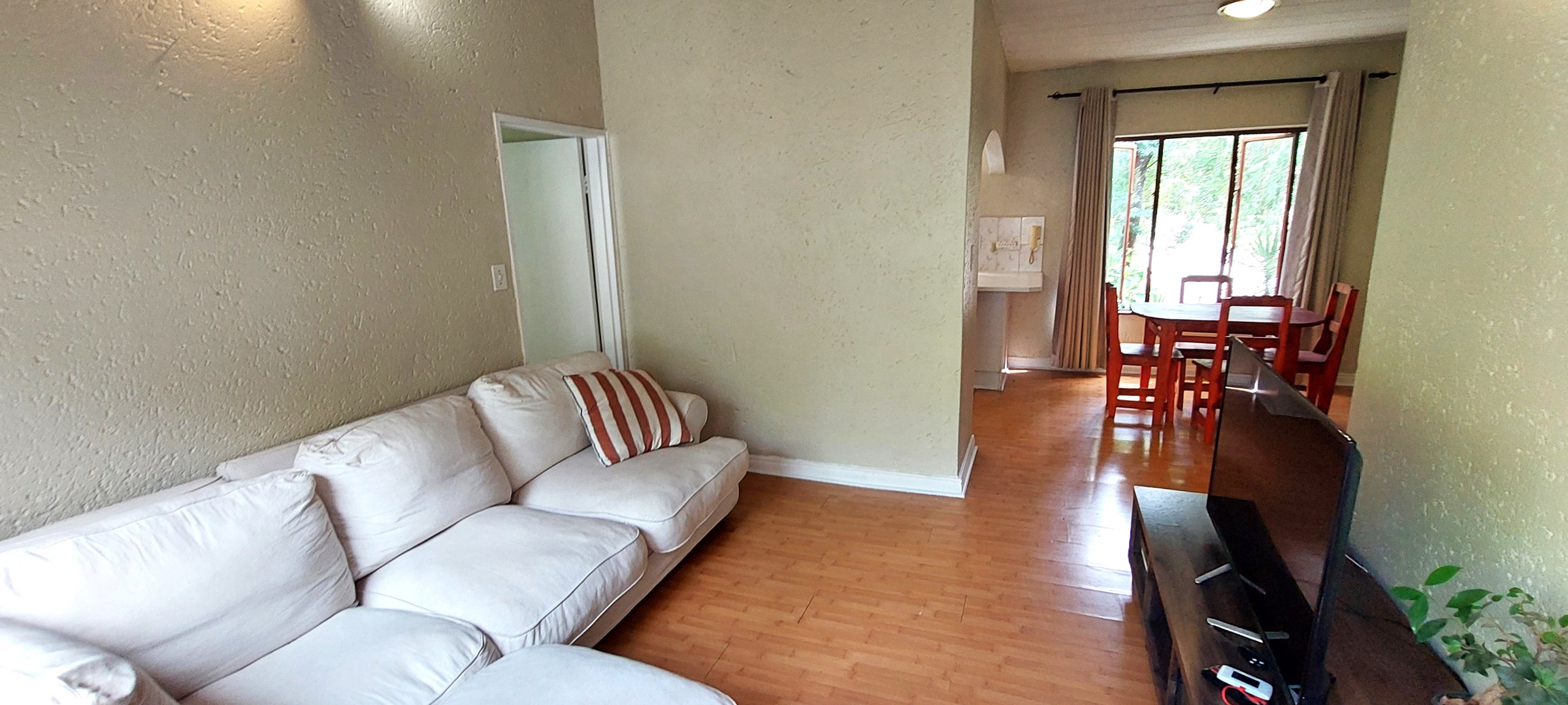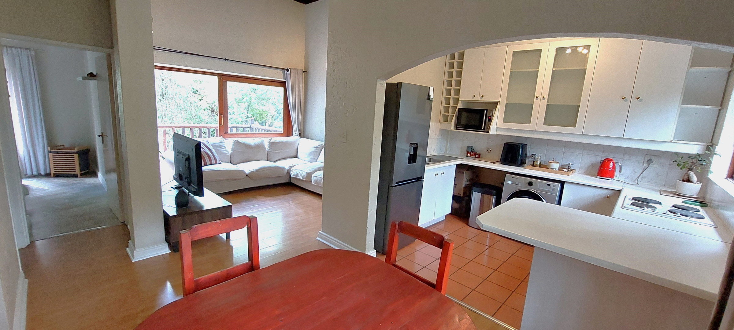 Sunny upstairs apartment with open-plan living with ample space for separate lounge and dining settings. Lounge sliders open out to a large balcony with built-in braai and lovely tree top view. Well-appointed kitchen includes ample cupboard space, a breakfast bar, electric cooking, space for 2 under-counter appliances plus single door fridge. The apartment has two separate bedroom suites. Main with full en-suite bathroom and passage to family bathroom with bath and 2nd bedroom. Fibre ready and unfortunately not pet friendly.