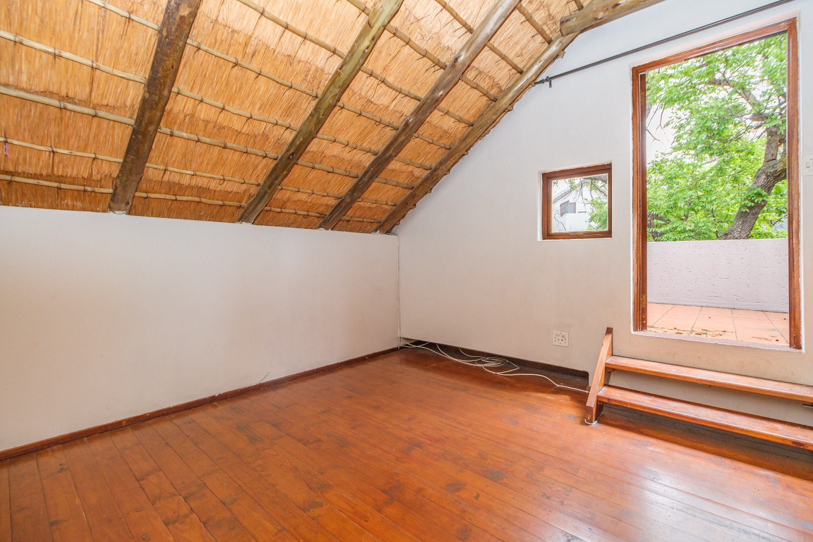 staircase leads to loft area where the thatched roof design is visible. The two