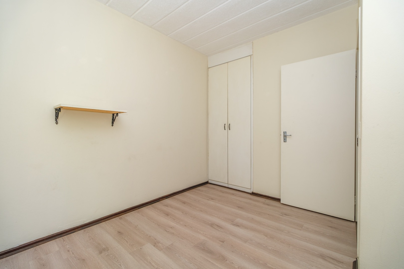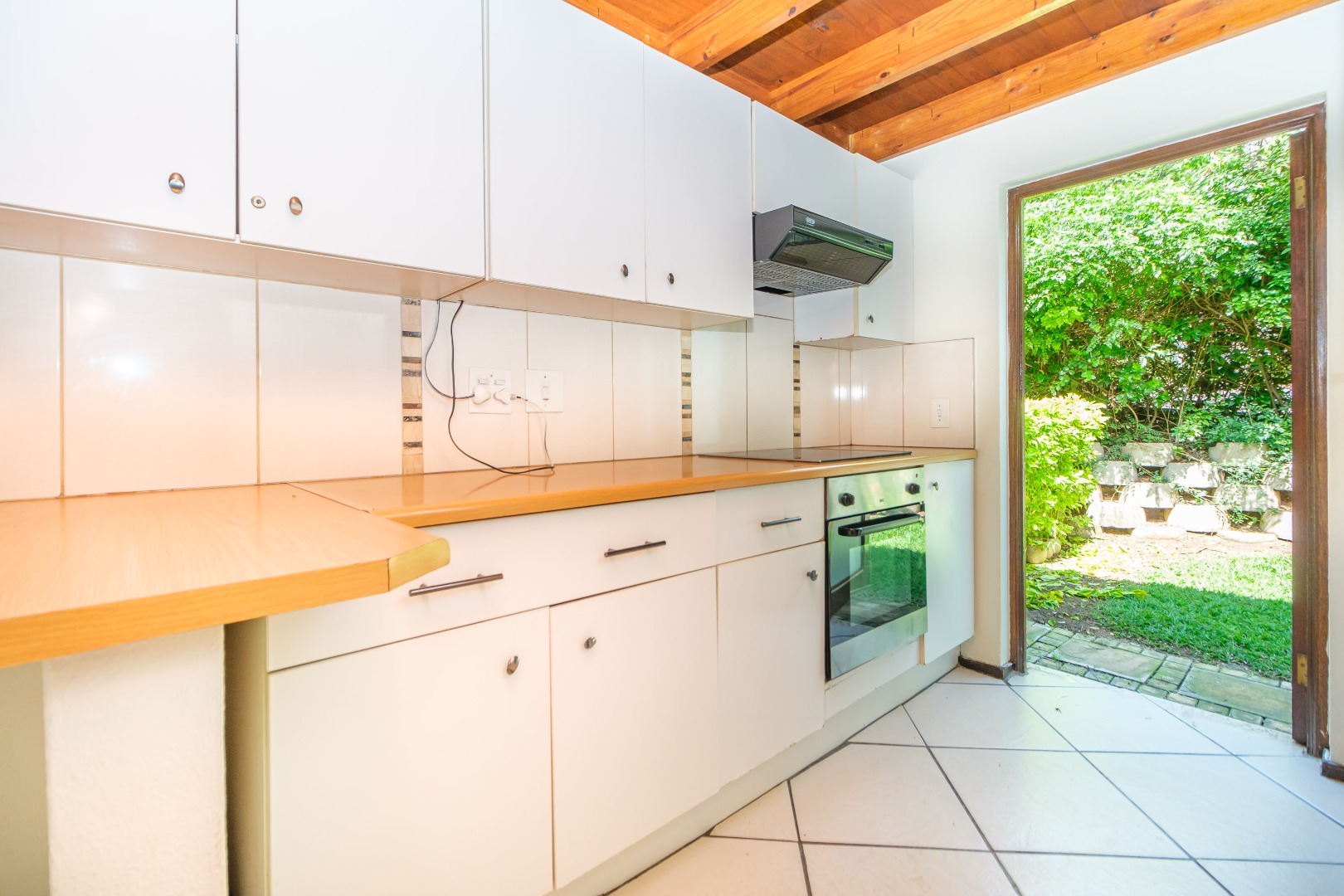 connecting to a compact, modern kitchen equipped with ample cupboards. A wooden