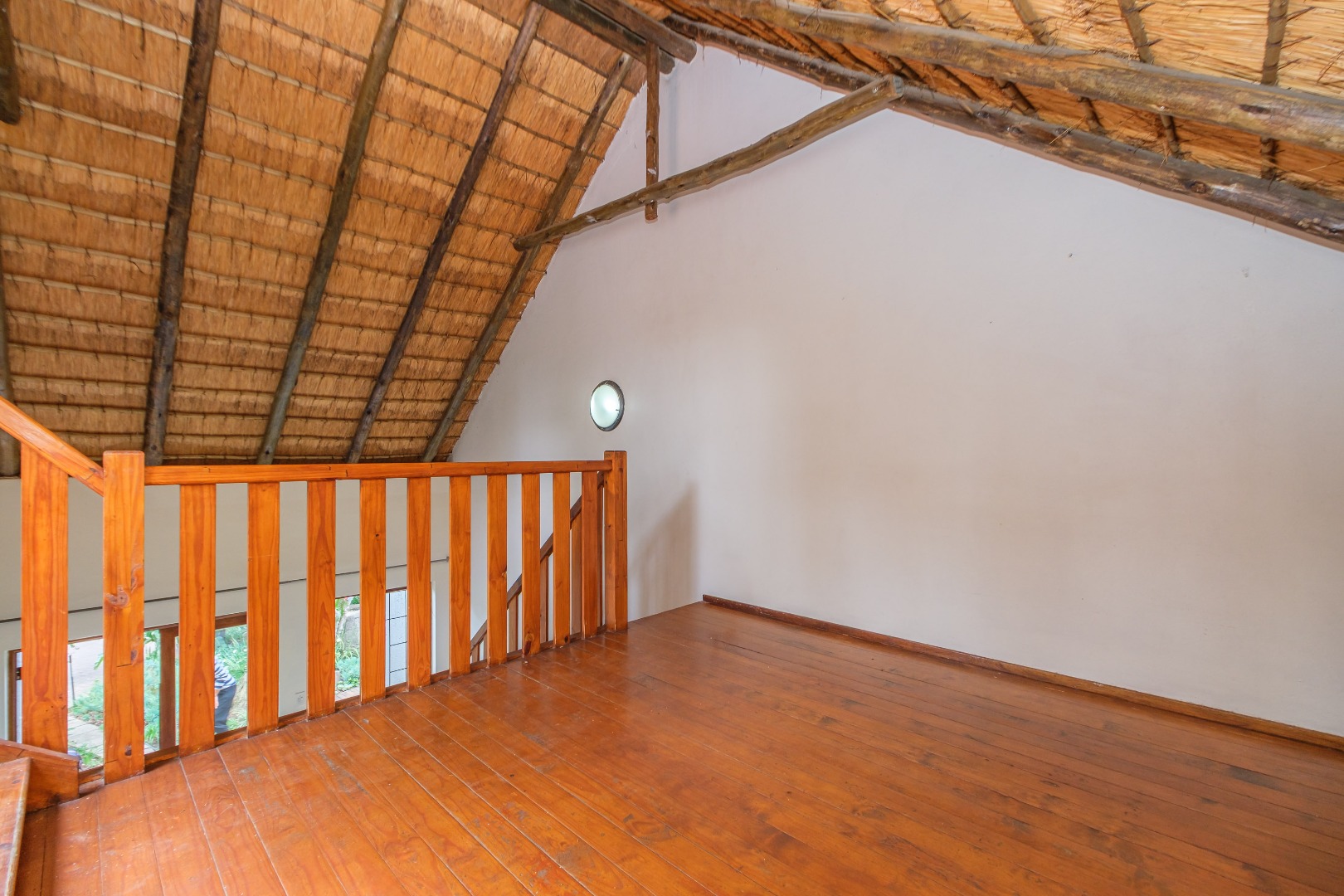 staircase leads to loft area where the thatched roof design is visible. The two
