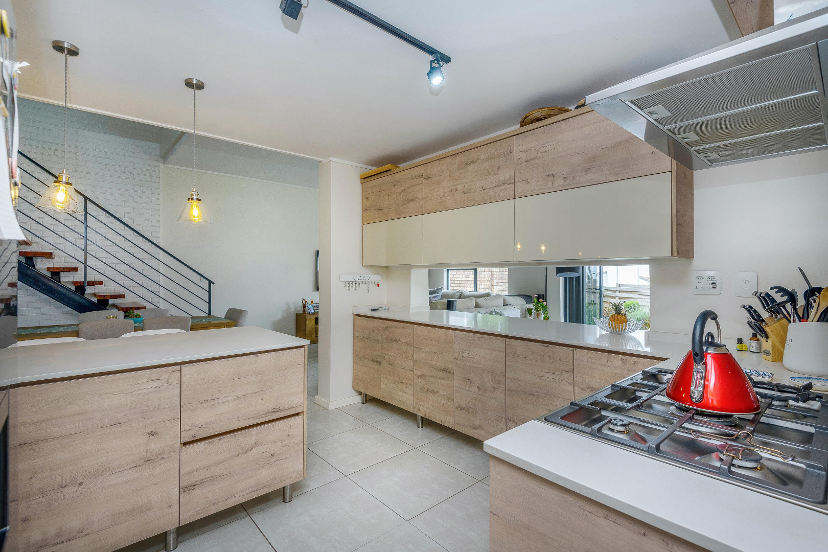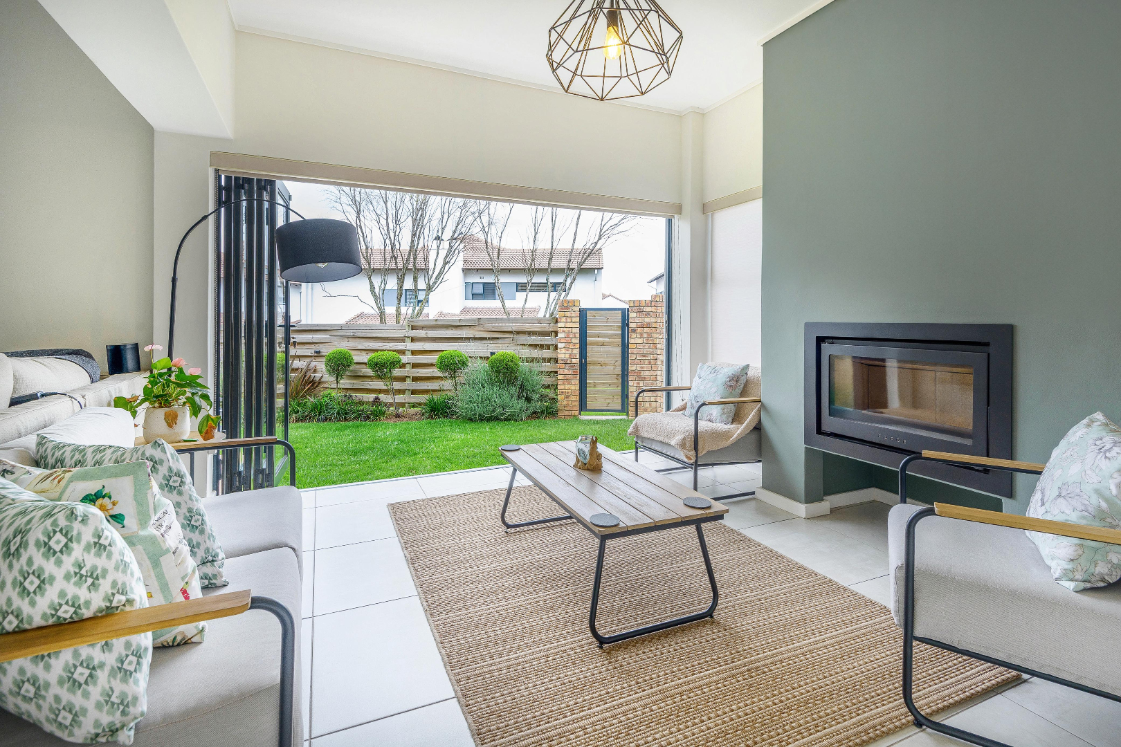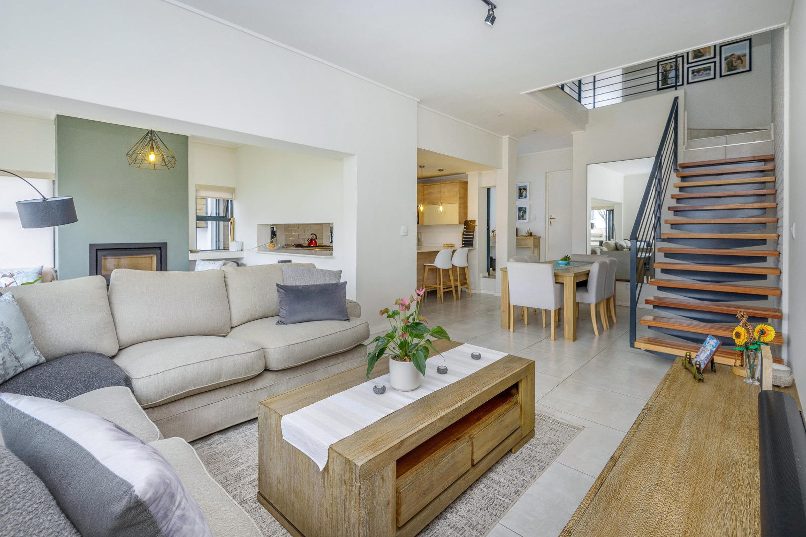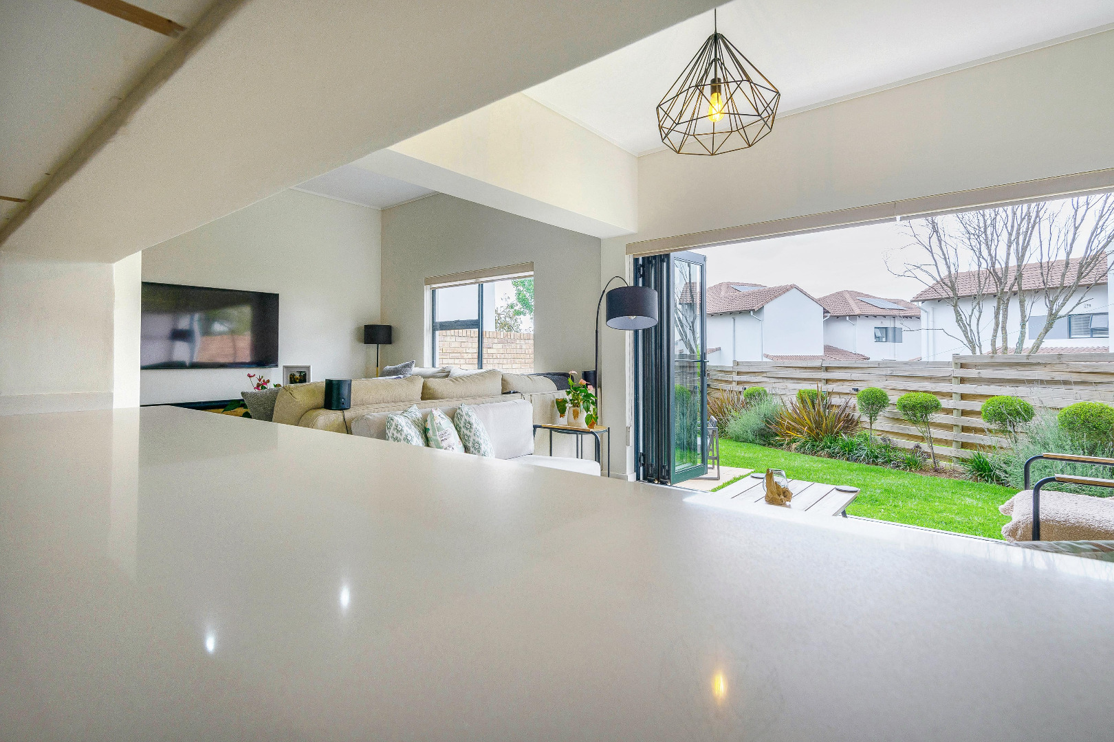 The home boasts an open-plan design with two spacious lounges, built in fire place, dining area and guest toilet. Modern kitchen with ample cupboard space, gas stove and scullery. Bi-fold stack doors to a low maintenance private garden.