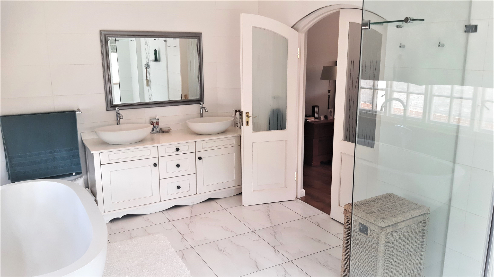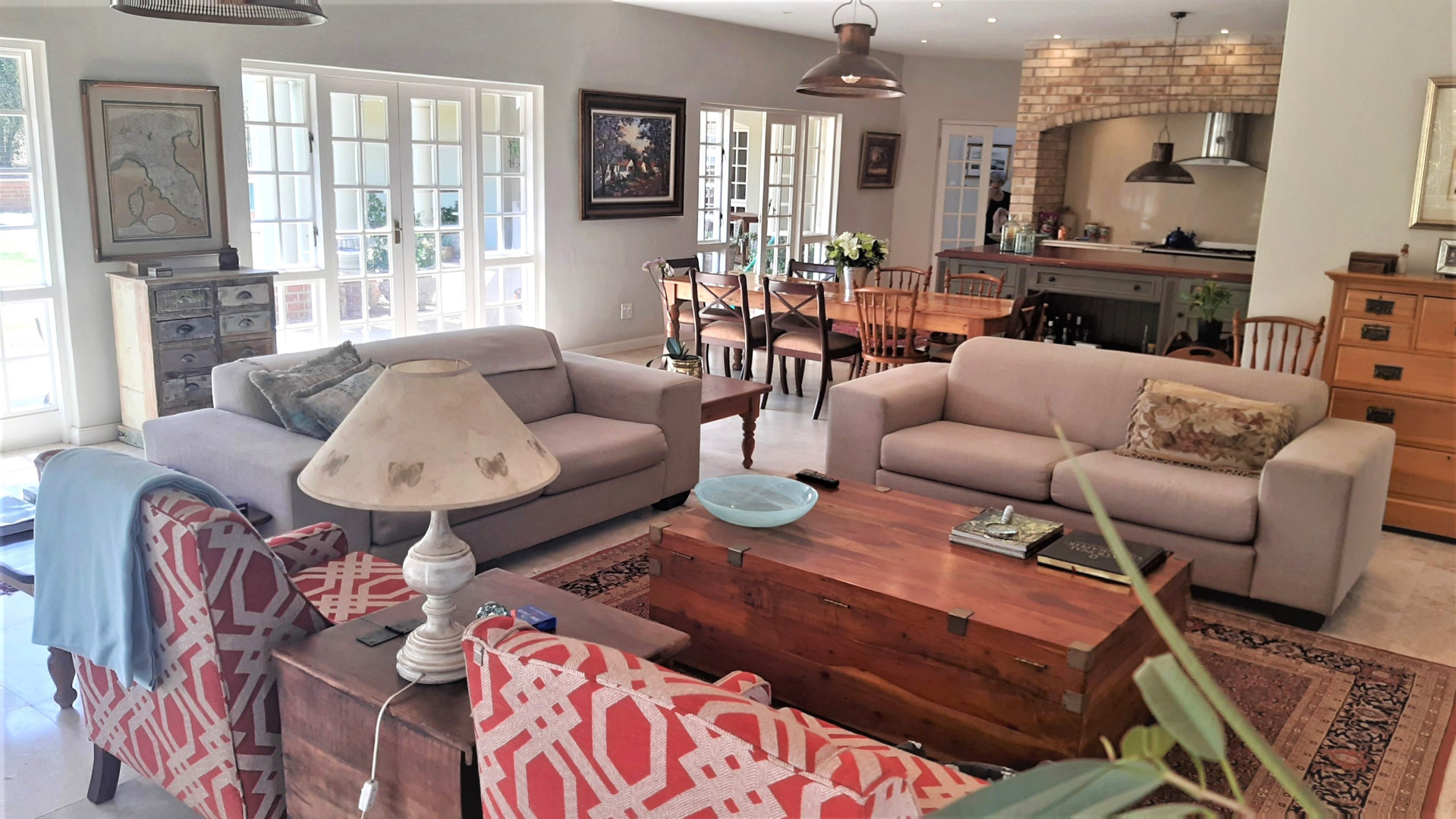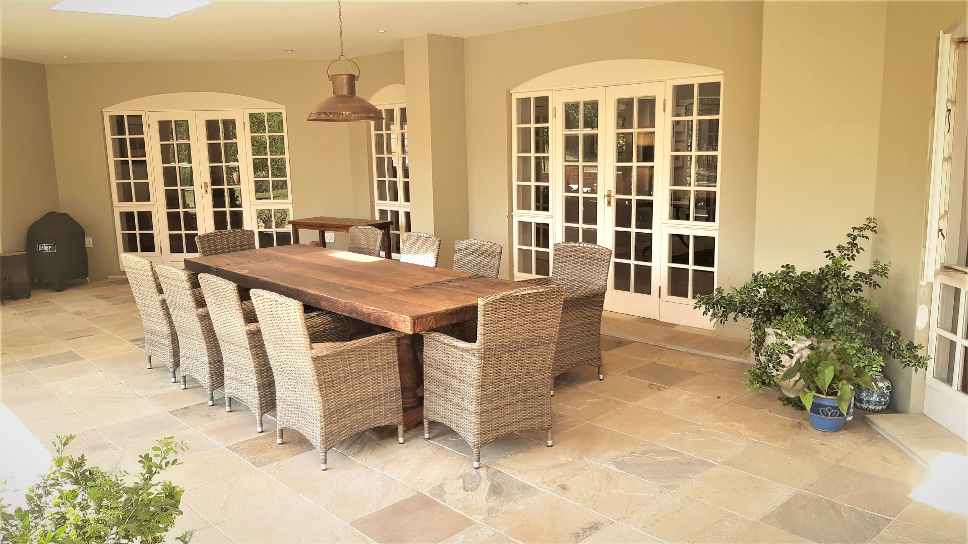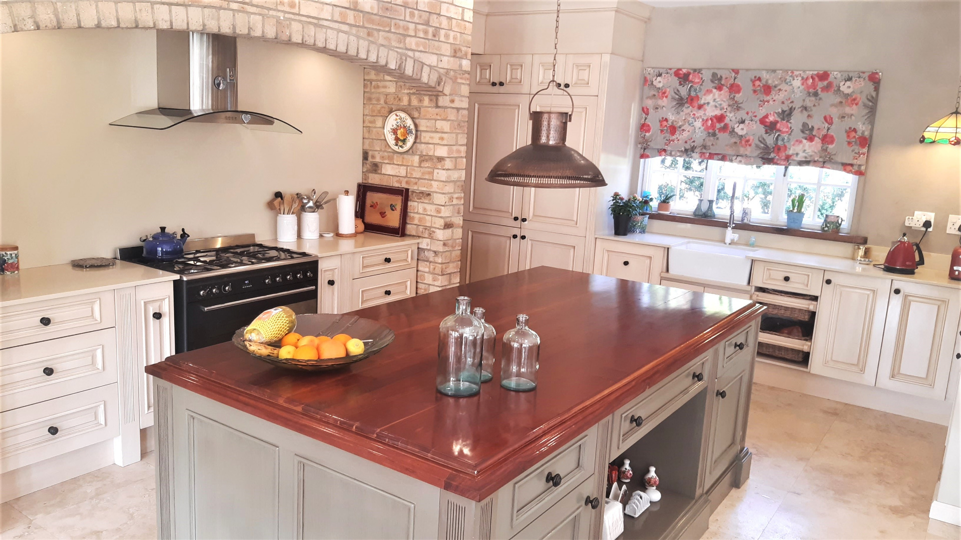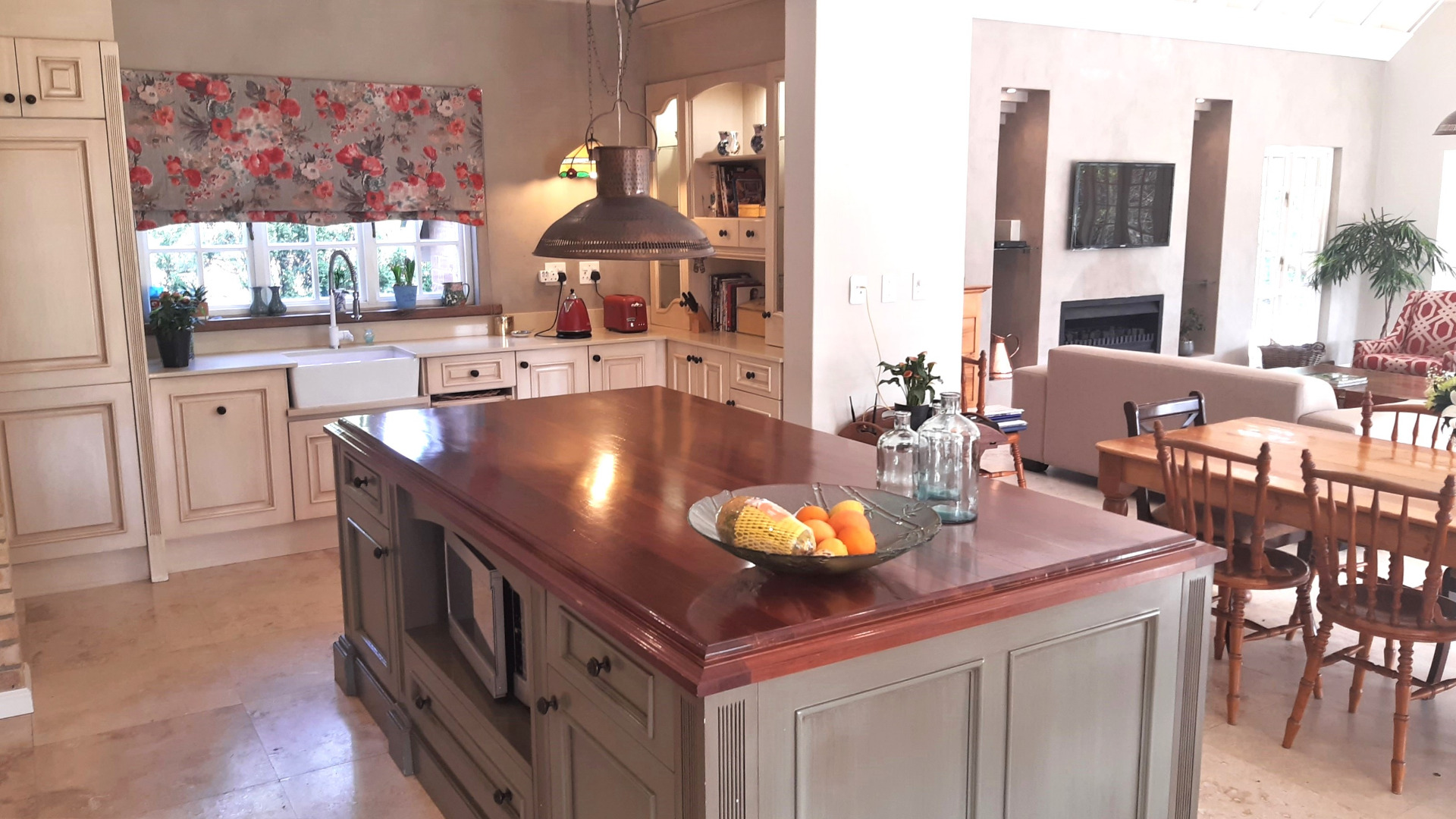 Country-style kitchen includes a large centre island, cooking range, full gas stove, integrated fridge / freezer, stone counter tops and ample work space. Separate scullery with a walk-in pantry cupboard, lockable storeroom, additional built-in cupboards for storage plus space for 2 under counter appliances.