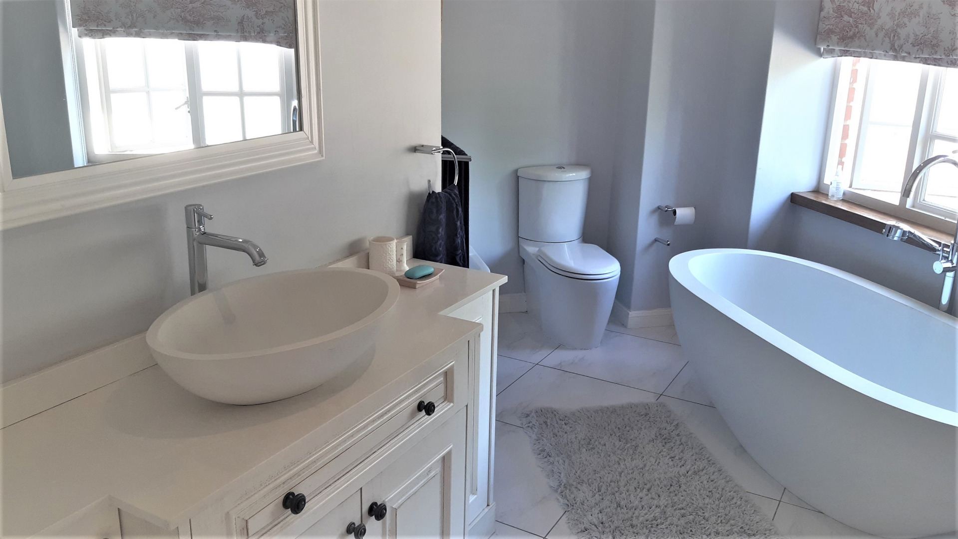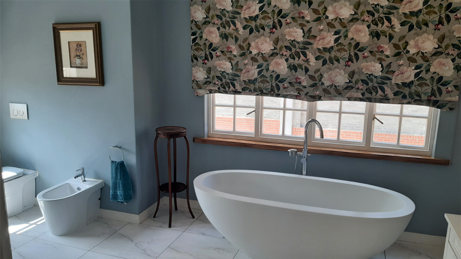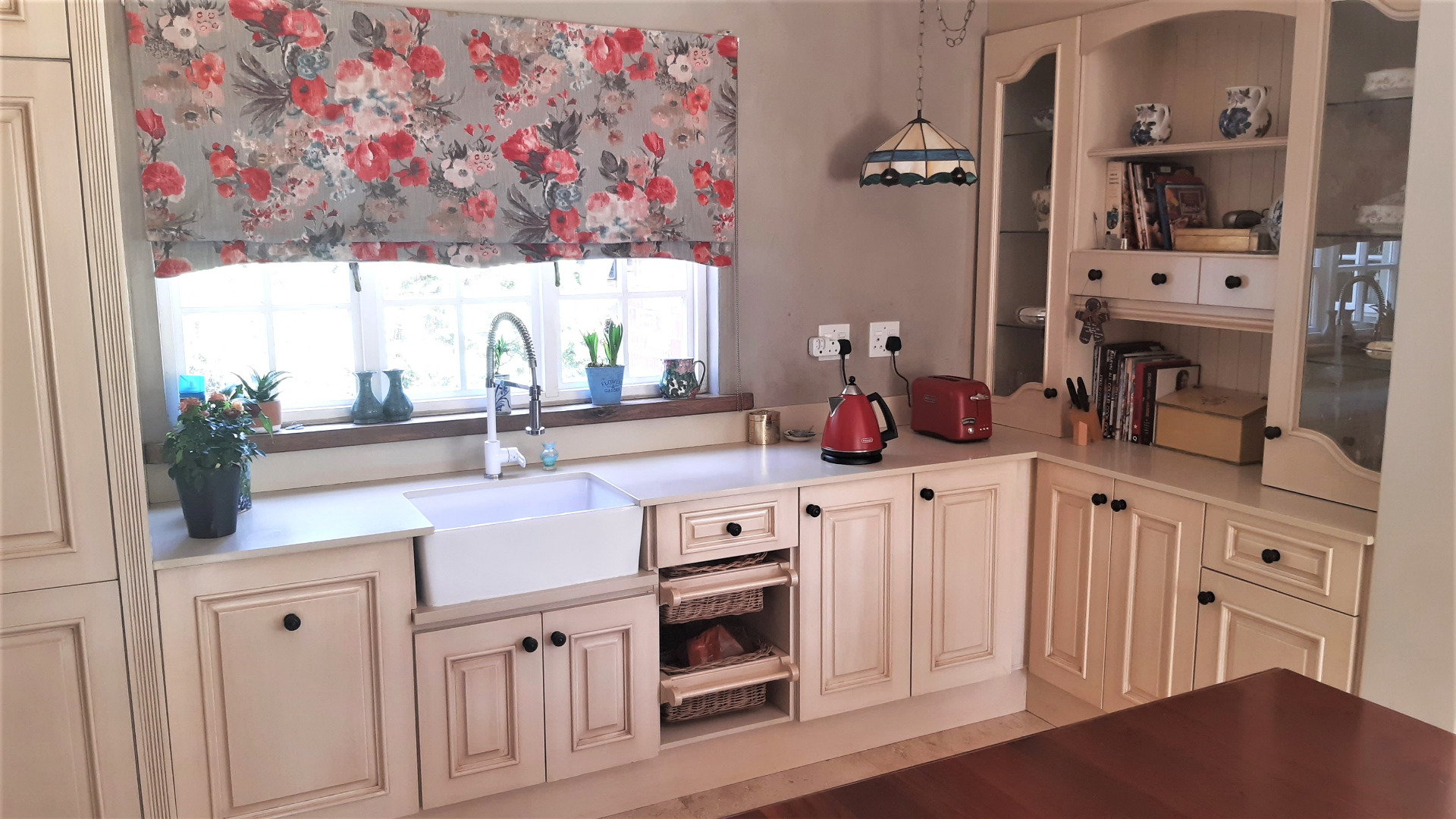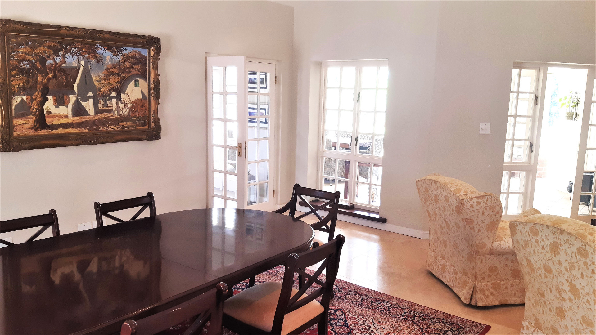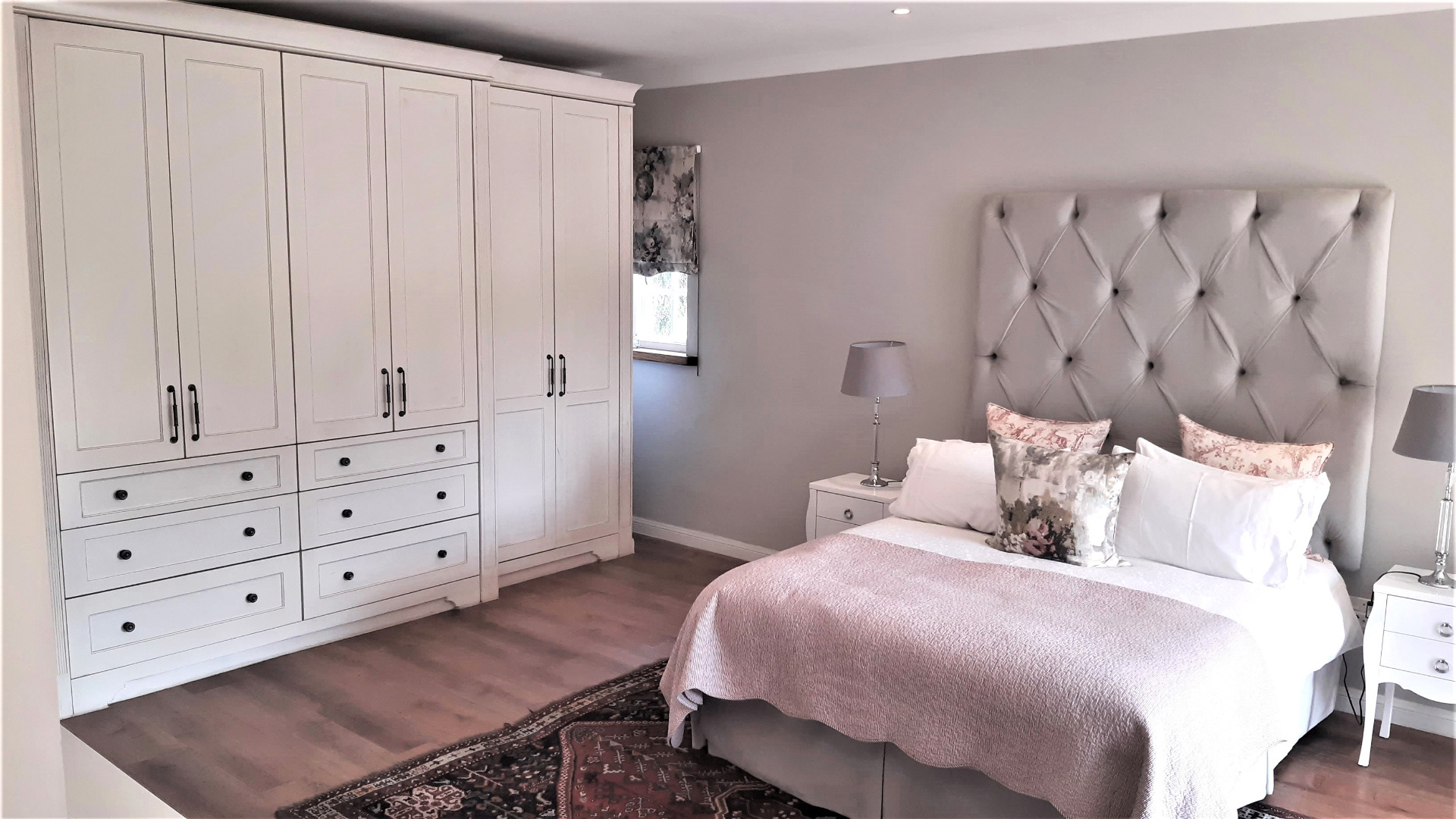 Country-style kitchen includes a large centre island, cooking range, full gas stove, integrated fridge / freezer, stone counter tops and ample work space. Separate scullery with a walk-in pantry cupboard, lockable storeroom, additional built-in cupboards for storage plus space for 2 under counter appliances.