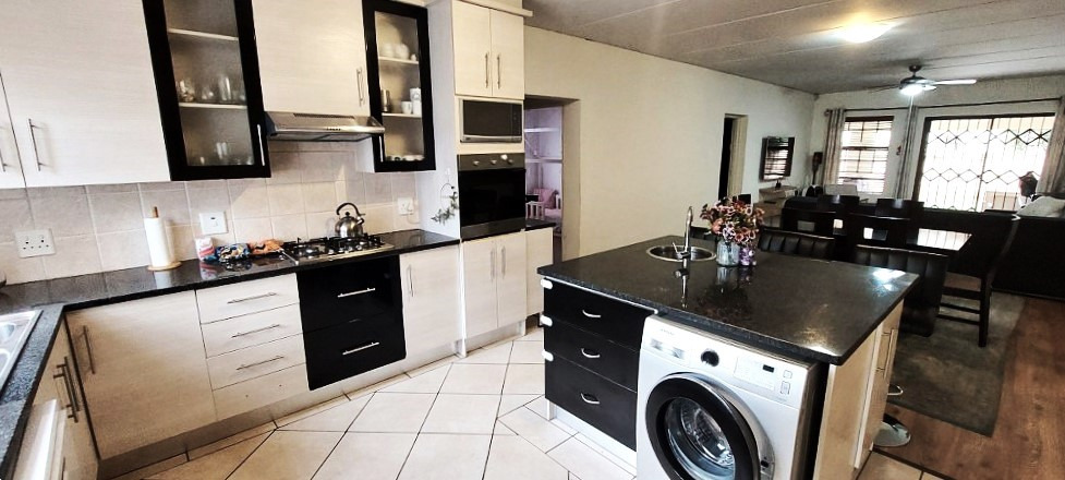 The heart of this home is its open-plan living and dining area, featuring elegant wooden laminate flooring and a ceiling fan for comfort. Sliding glass doors, equipped with security gates, lead out to a covered patio and private garden. The modern kitchen is a highlight, boasting two-tone cabinetry, dark granite countertops, electric eye-level oven and gas hob and a large central island with a second integrated sink and space for a washing machine.