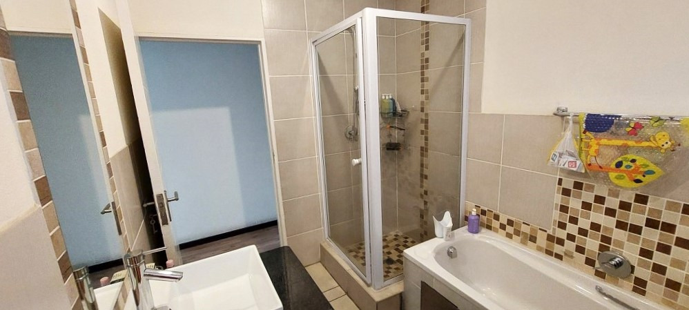 Accommodation comprises of three well-proportioned bedrooms, all fitted with laminate flooring and offering ample natural light. The main bedroom includes a full en-suite bathroom. 2nd family bathroom. Both bathrooms feature modern vanities with vessel sinks and glass-enclosed showers, providing sleek and functional space.