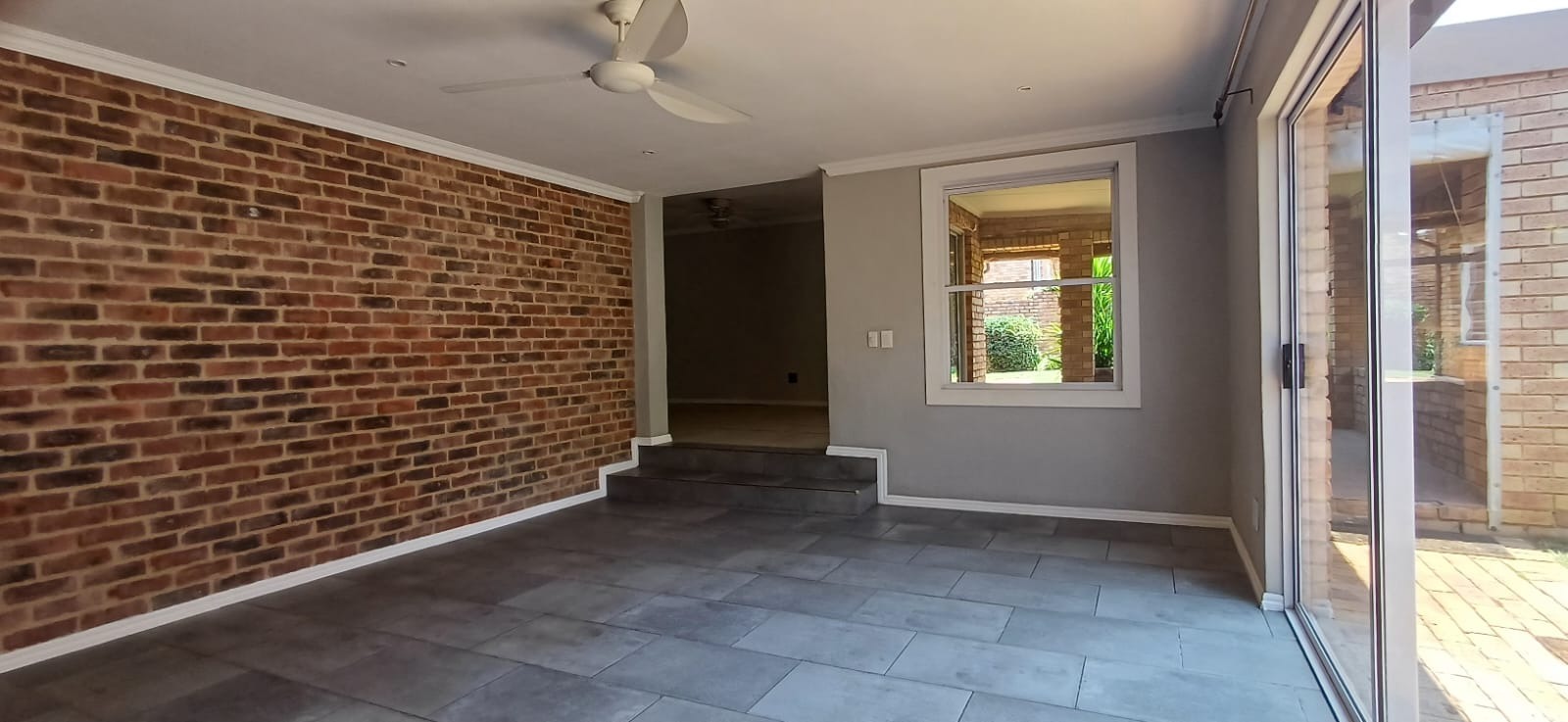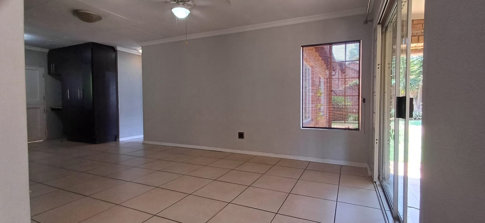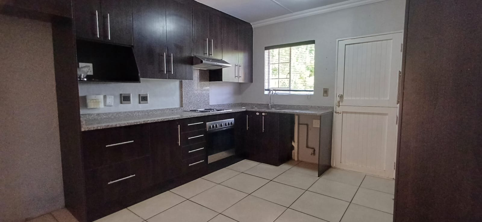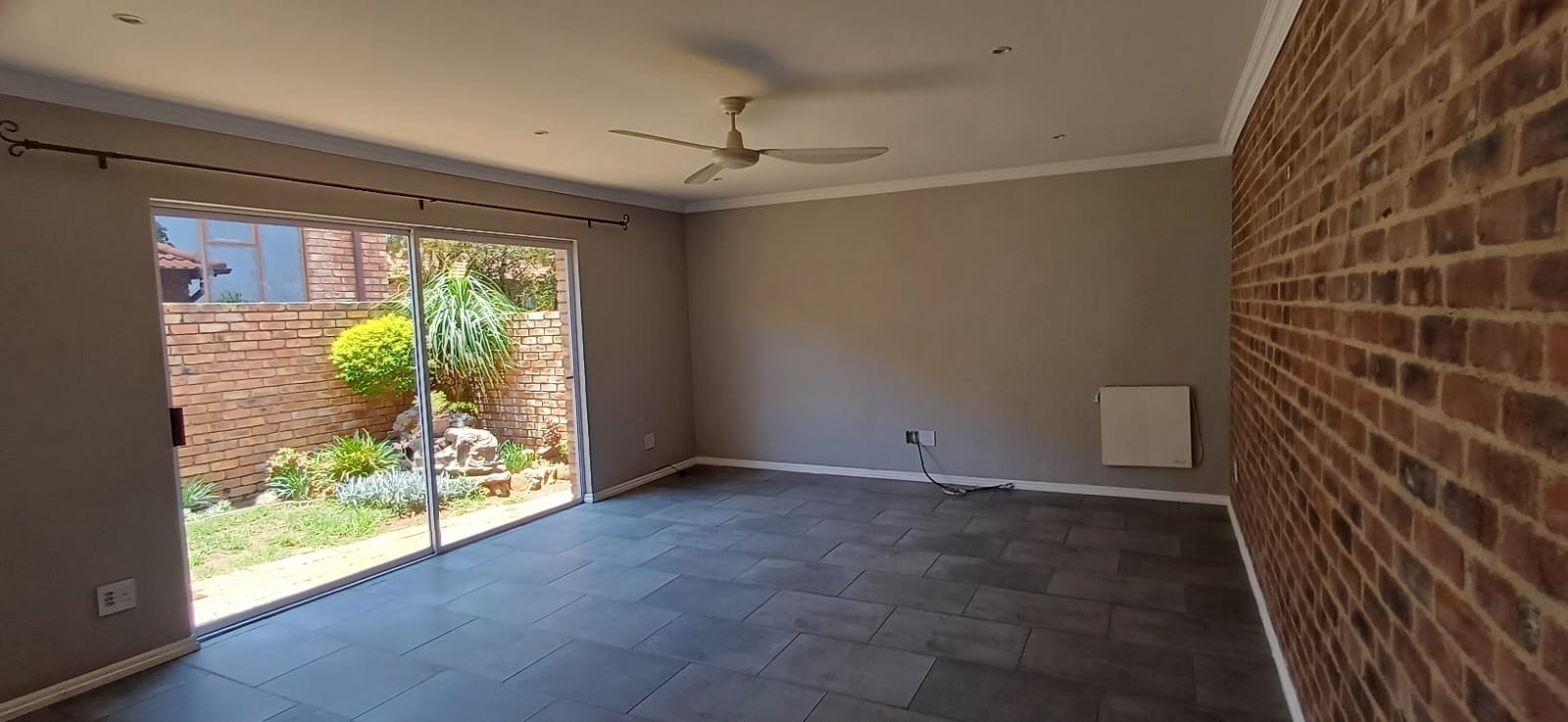 This inviting 2-bedroom, 2-bathroom rental property, including ensuite, offers a comfortable living space spanning 106 square meters within a secure residential development. The residence features a well-appointed kitchen with modern dark wood-look cabinetry, granite-style countertops, an integrated oven, hob, and extractor fan, all set on easy-to-maintain tiled flooring. The open-plan layout includes a dedicated dining room and a lounge area, which boasts an exposed brick accent wall, dark grey tiled flooring, a ceiling fan, and a wall-mounted heater for year-round comfort. Large sliding glass doors provide abundant natural light and seamless access to the private outdoor areas.